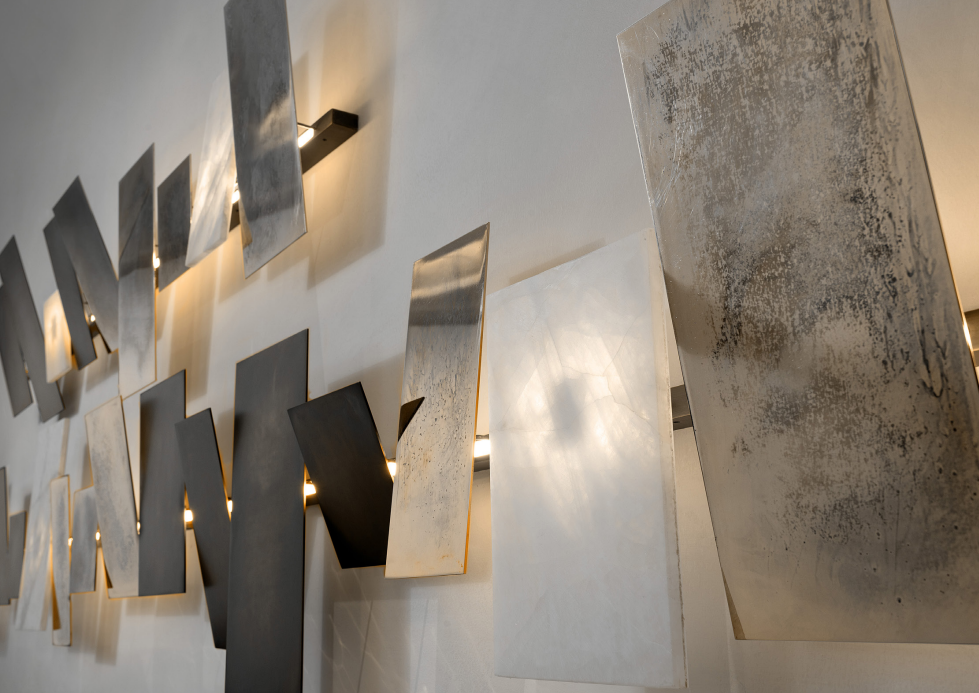Светильник ABACO — это настоящее художественное произведение, в котором свет и материя объединяются, создавая ироничный и элегантный образ. Этот настенный светильник представляет собой изысканное сочетание металлических модулей и фрагментов белого хрусталя разного размера. Модули расположены в ряд и чередуются с хрустальными вставками, образуя многогранный узор.