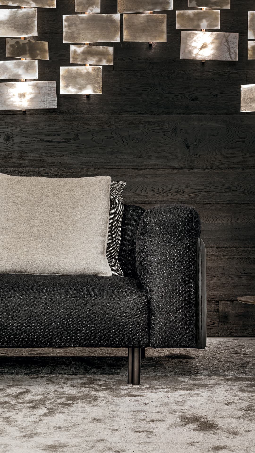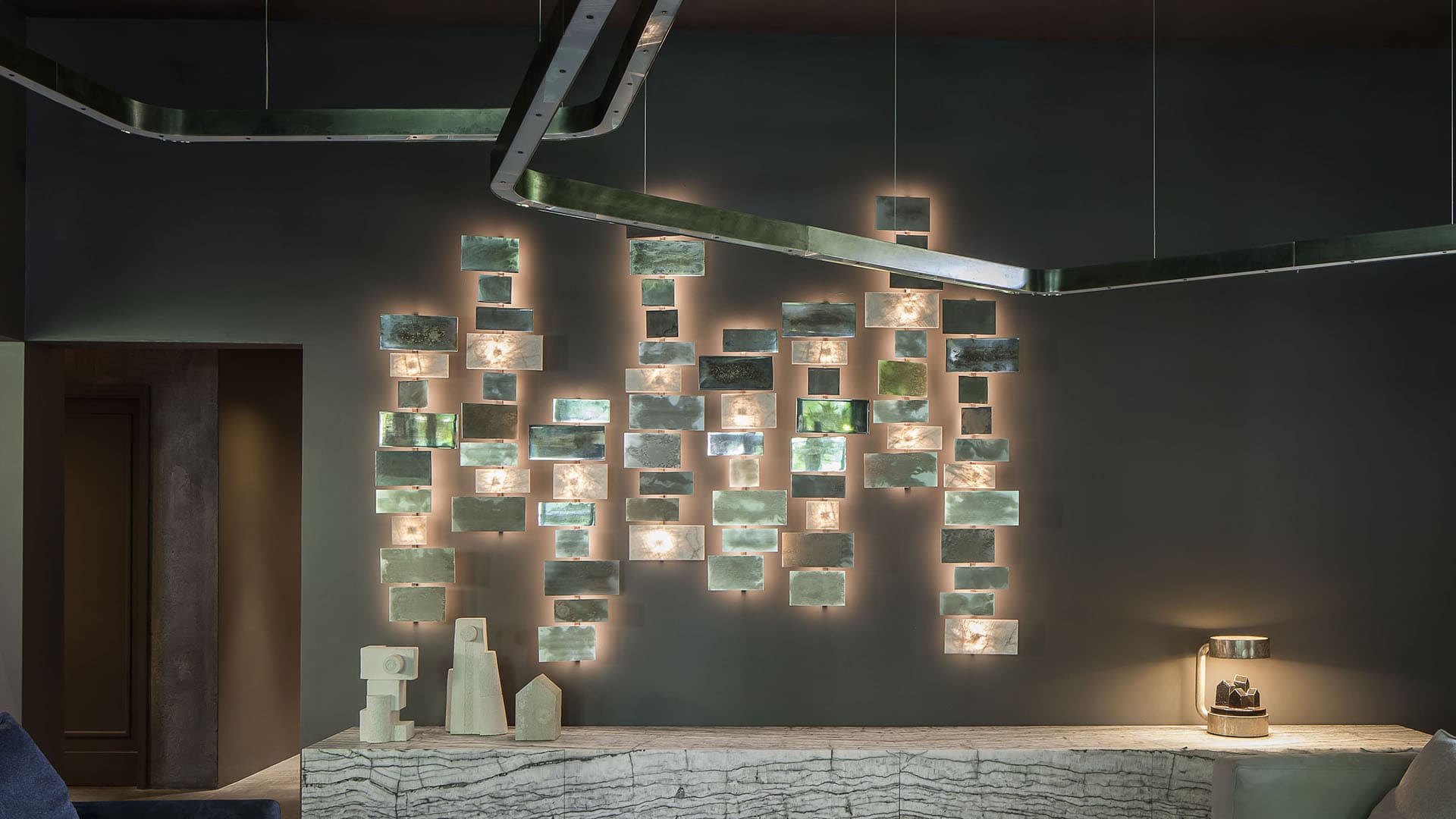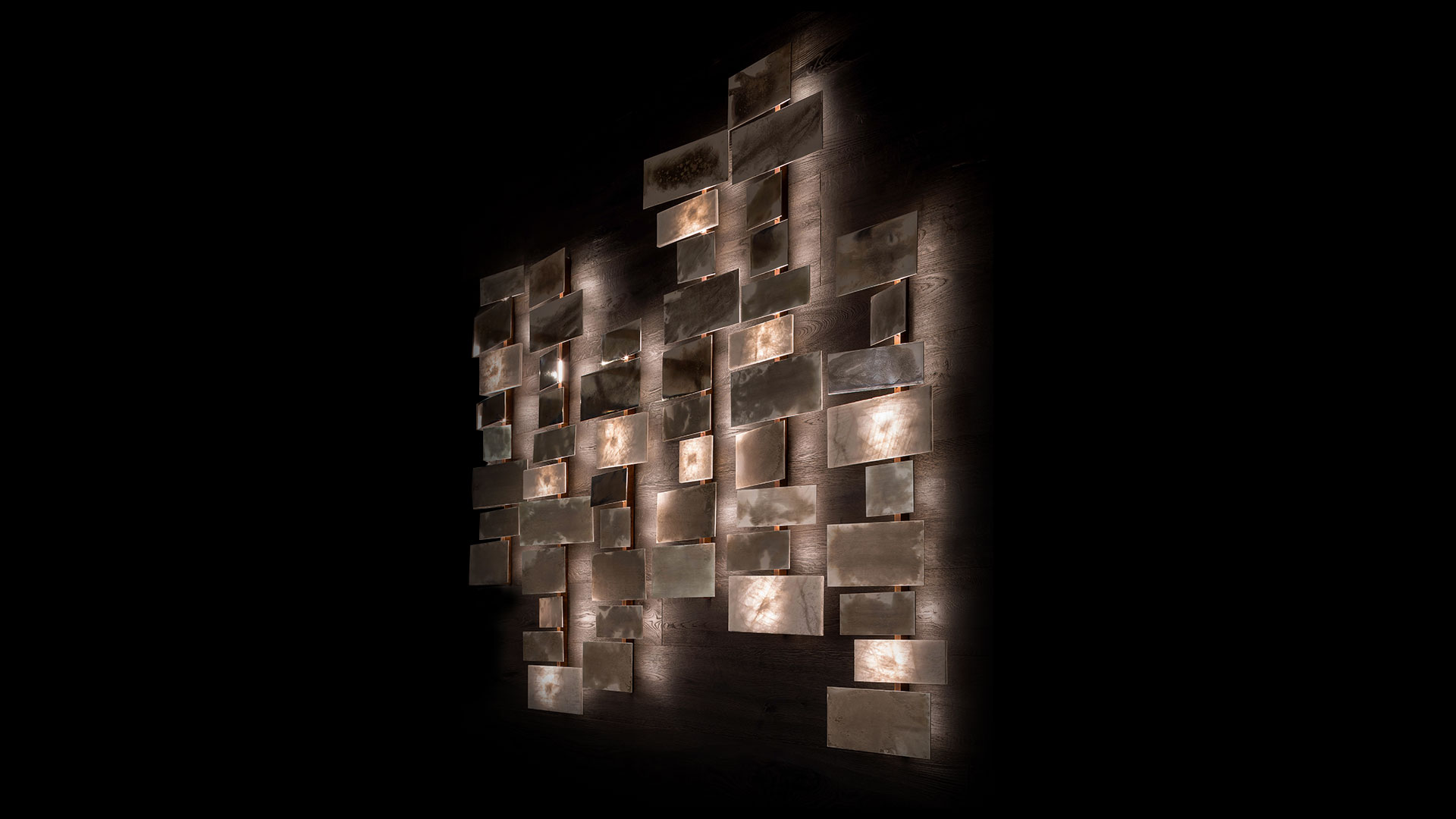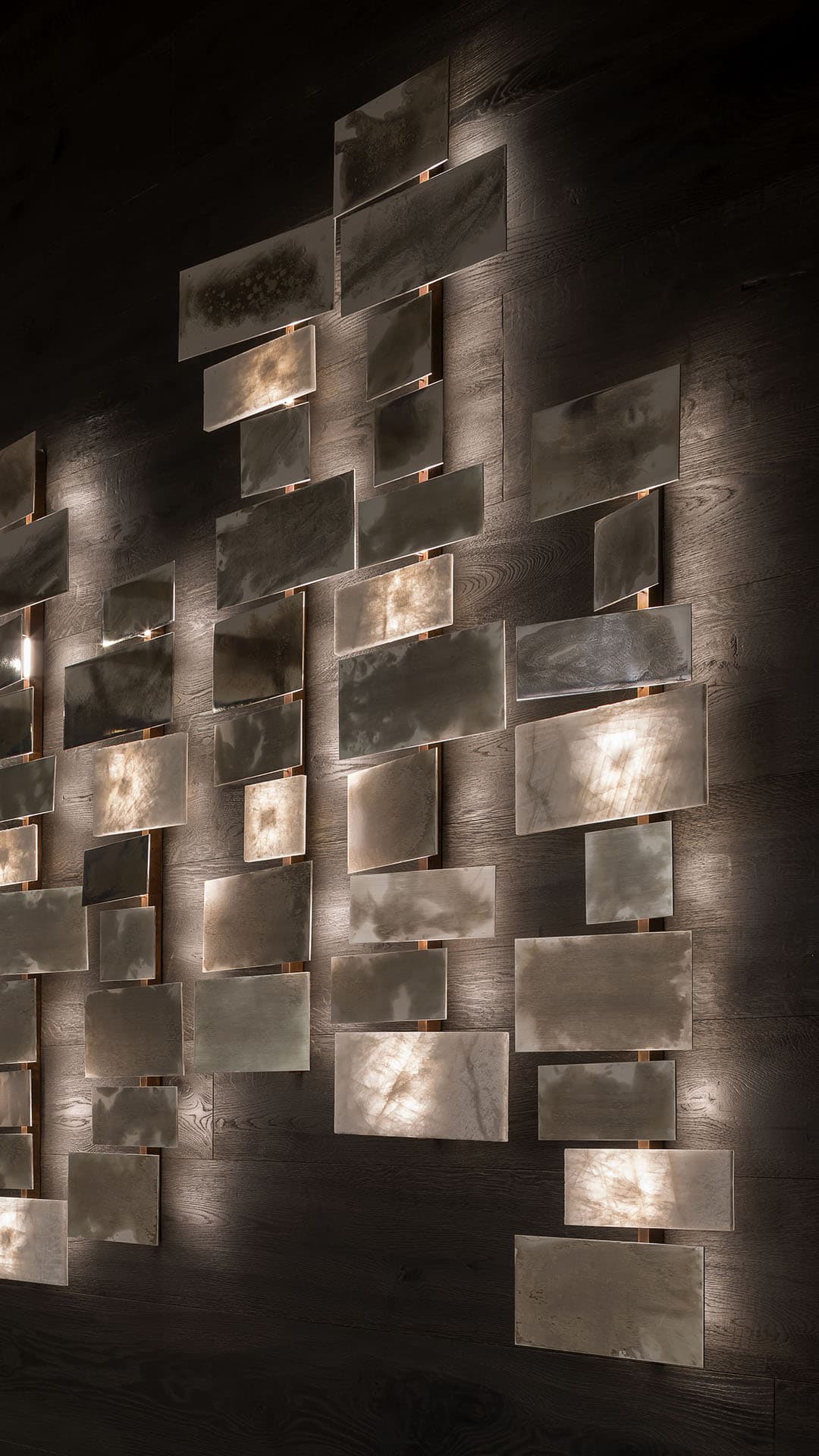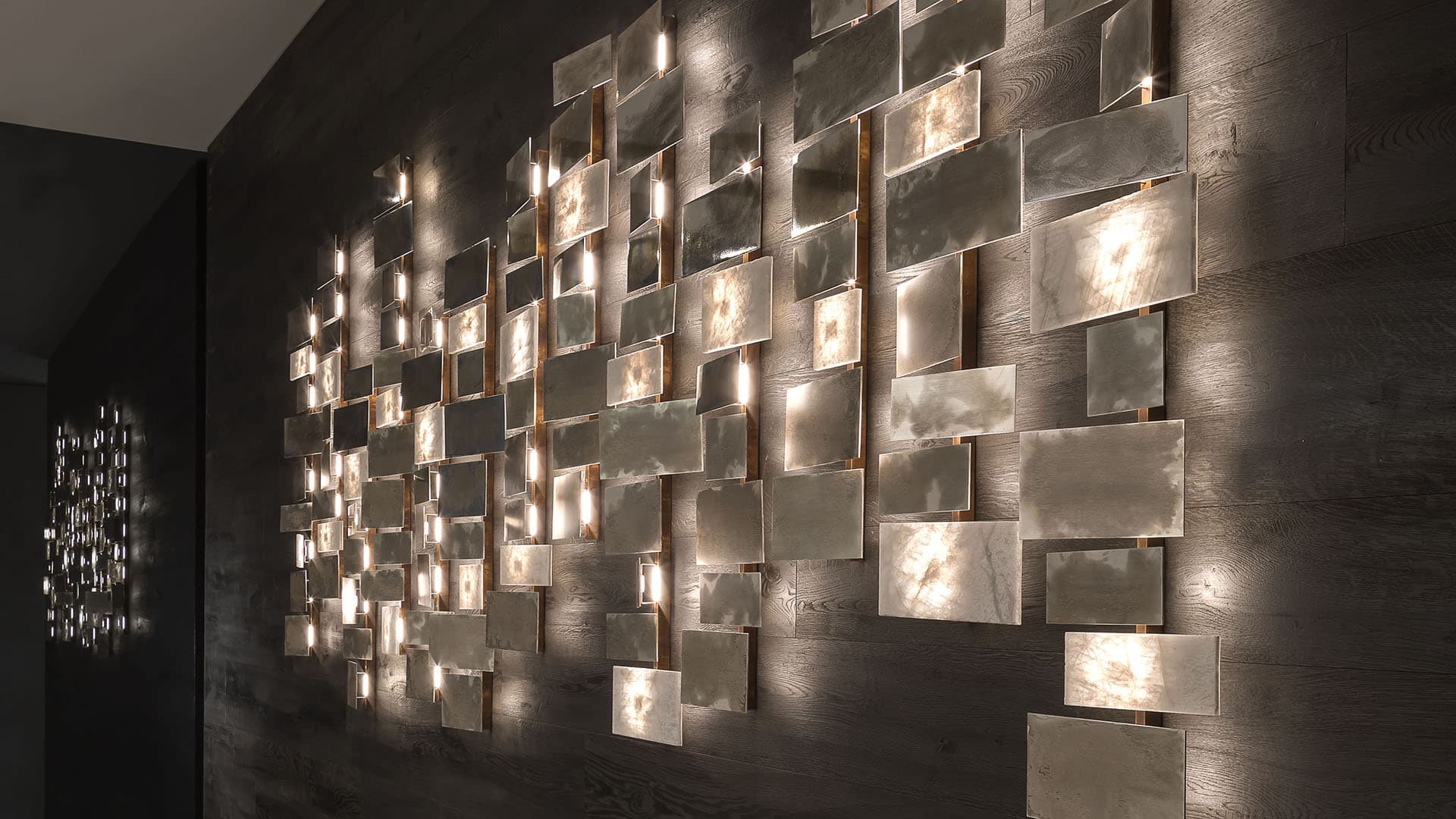 Лучи света, которые загадочно расходятся от точек пересечения элементов, создают особую атмосферу. Металлическая конструкция с прямоугольными плитками доступна в разных вариантах отделки. Варианты включают белый кристаллический камень и металл. Это позволяет подобрать оптимальный вариант для любого интерьера.