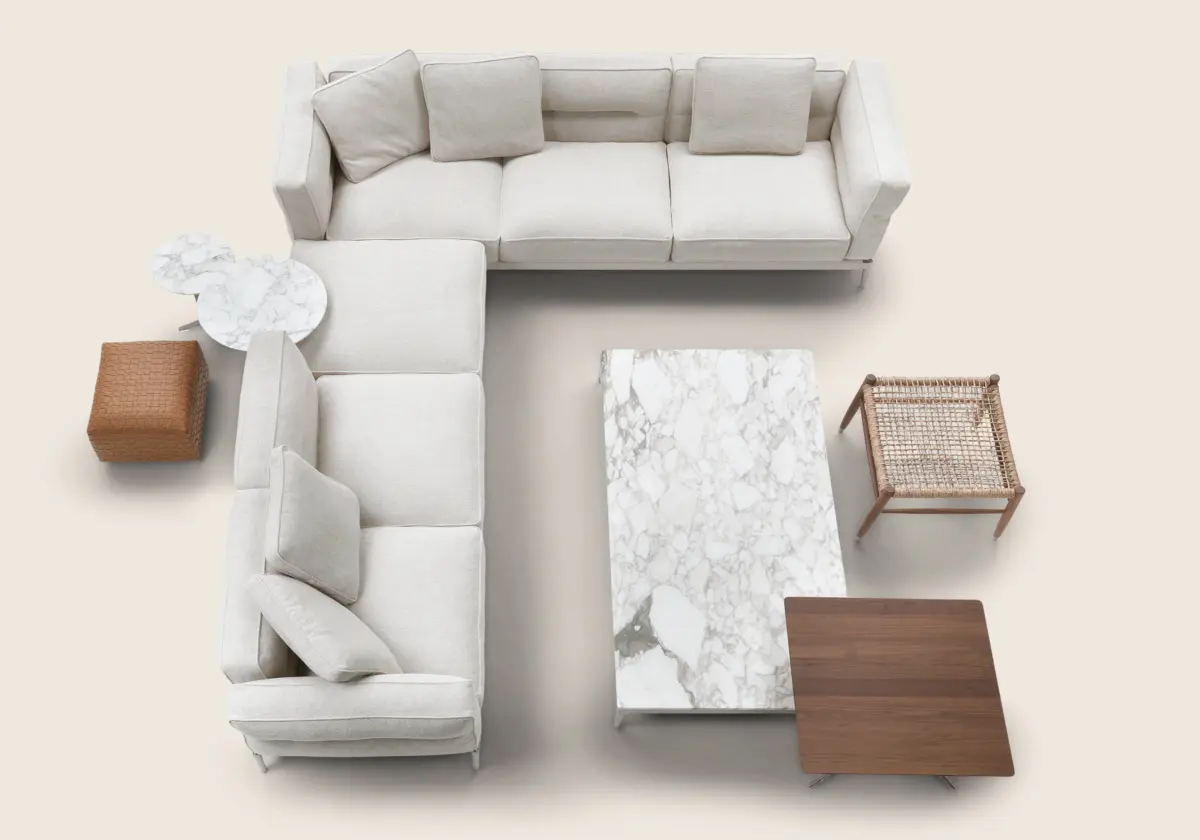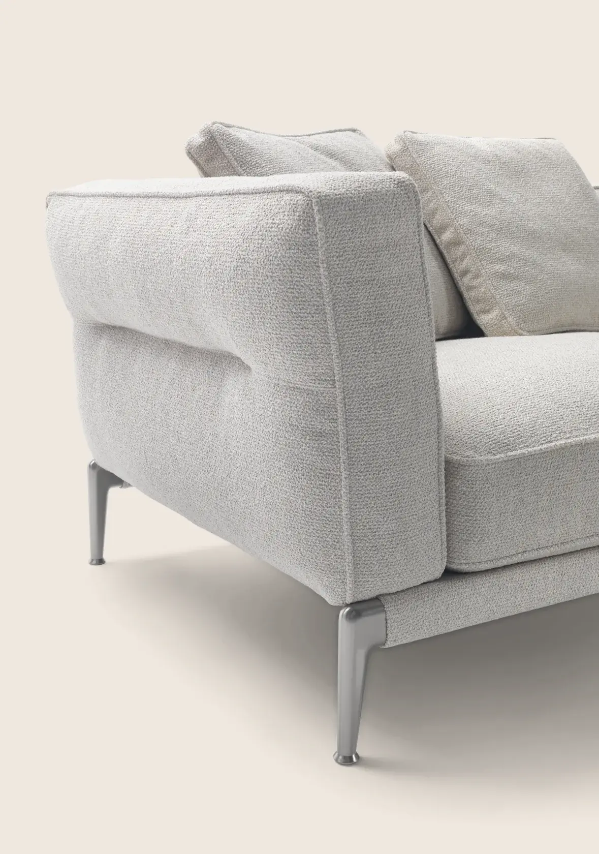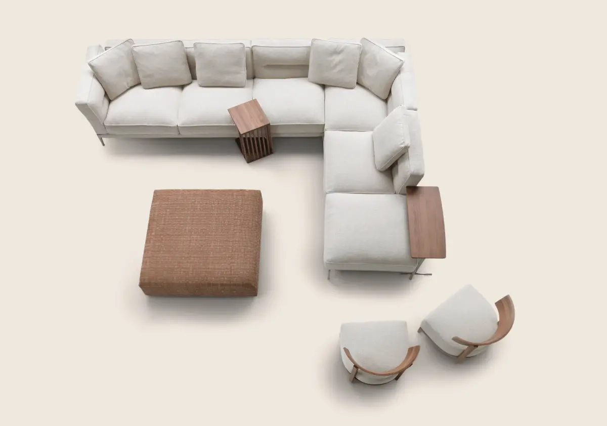 Мягкие подушки подлокотников и спинки соединены с основанием с помощью простой и эффективной байонетной системы крепления. Оригинальный продольный шов на подушках образует лёгкую складку на обивке из ткани или кожи. Этот шов не только следует естественному сгибу при откидывании на подушки, но и становится отличительной чертой дивана.