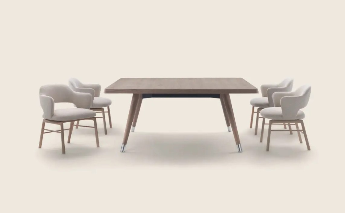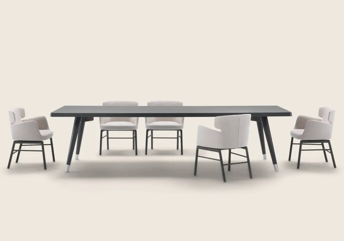 Столешницы столов ADLER изготовлены из дерева. Они могут быть шпонированы орехом каналетто, ясенем или дубом. Они отличаются своей толщиной, что обеспечивает их долговечность и устойчивость. Закруглённые углы не только добавляют столу эстетическую привлекательность, но и делают его более безопасным в использовании. Обеденные столы оснащены специальными металлическими вставками, которые придают им дополнительную прочность и надежность.