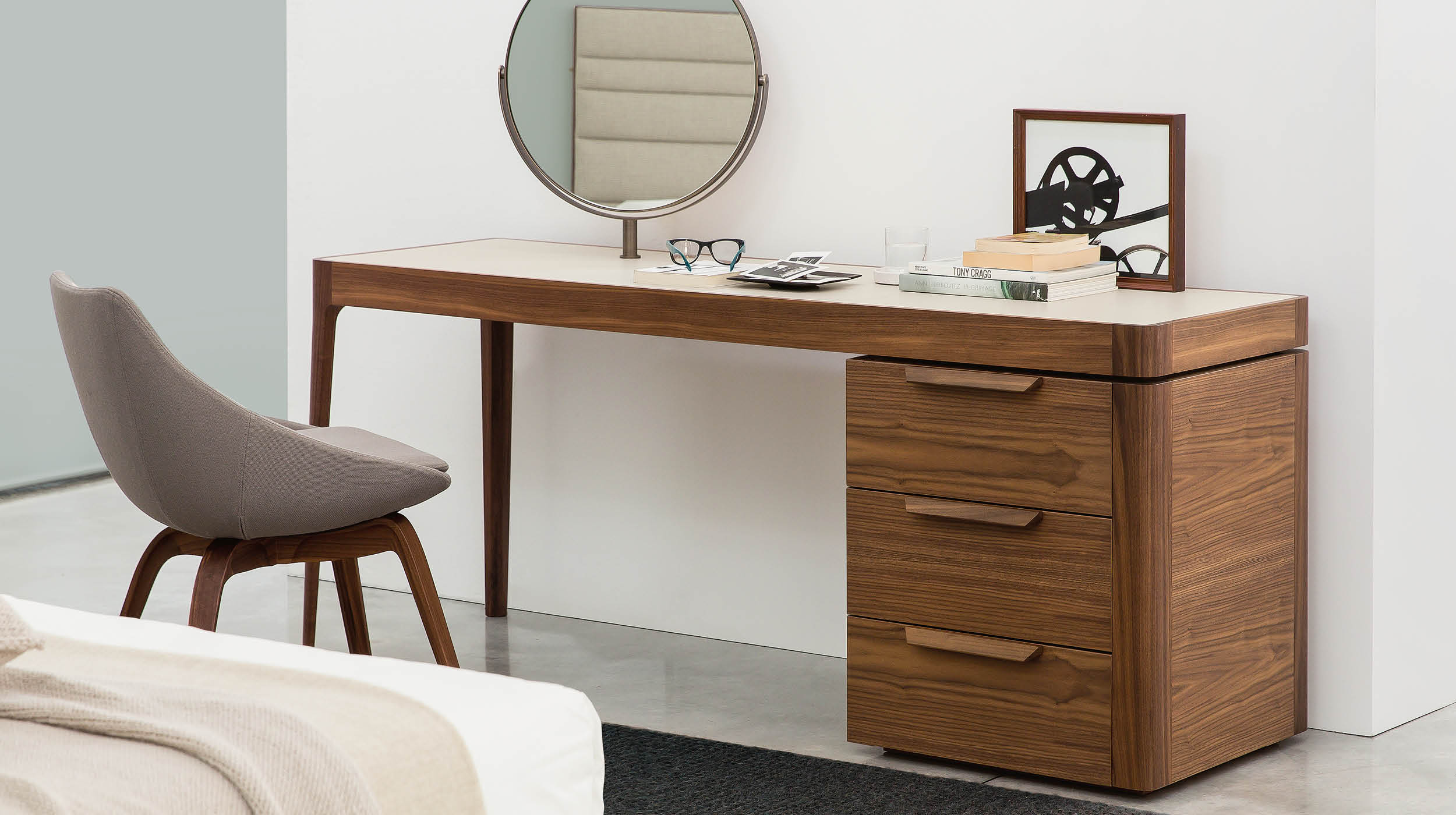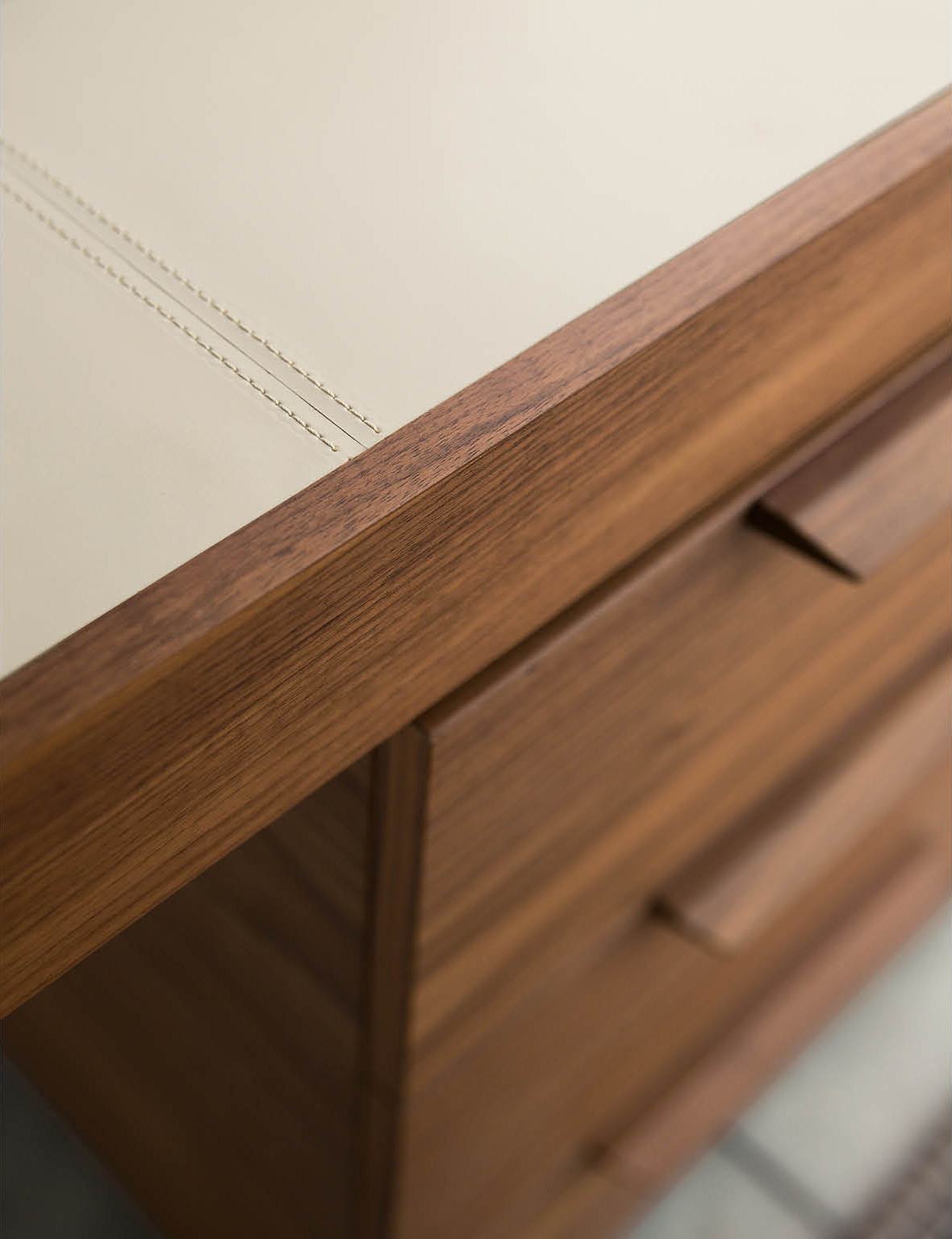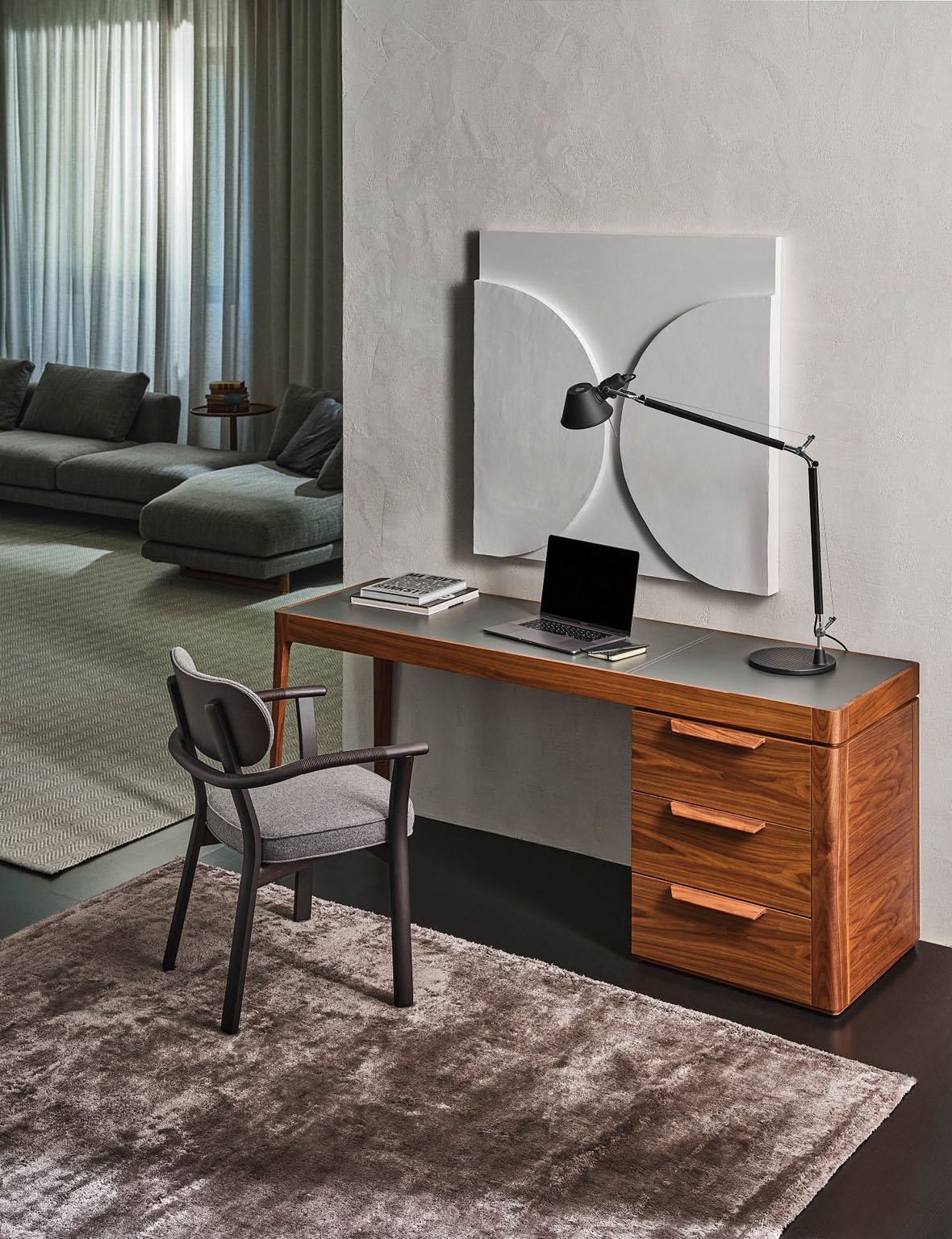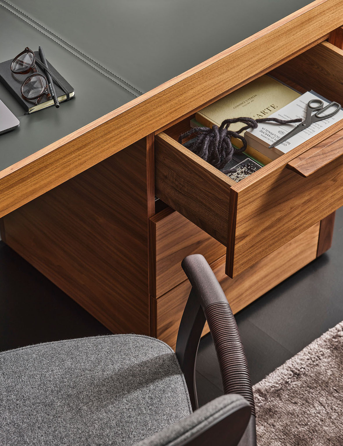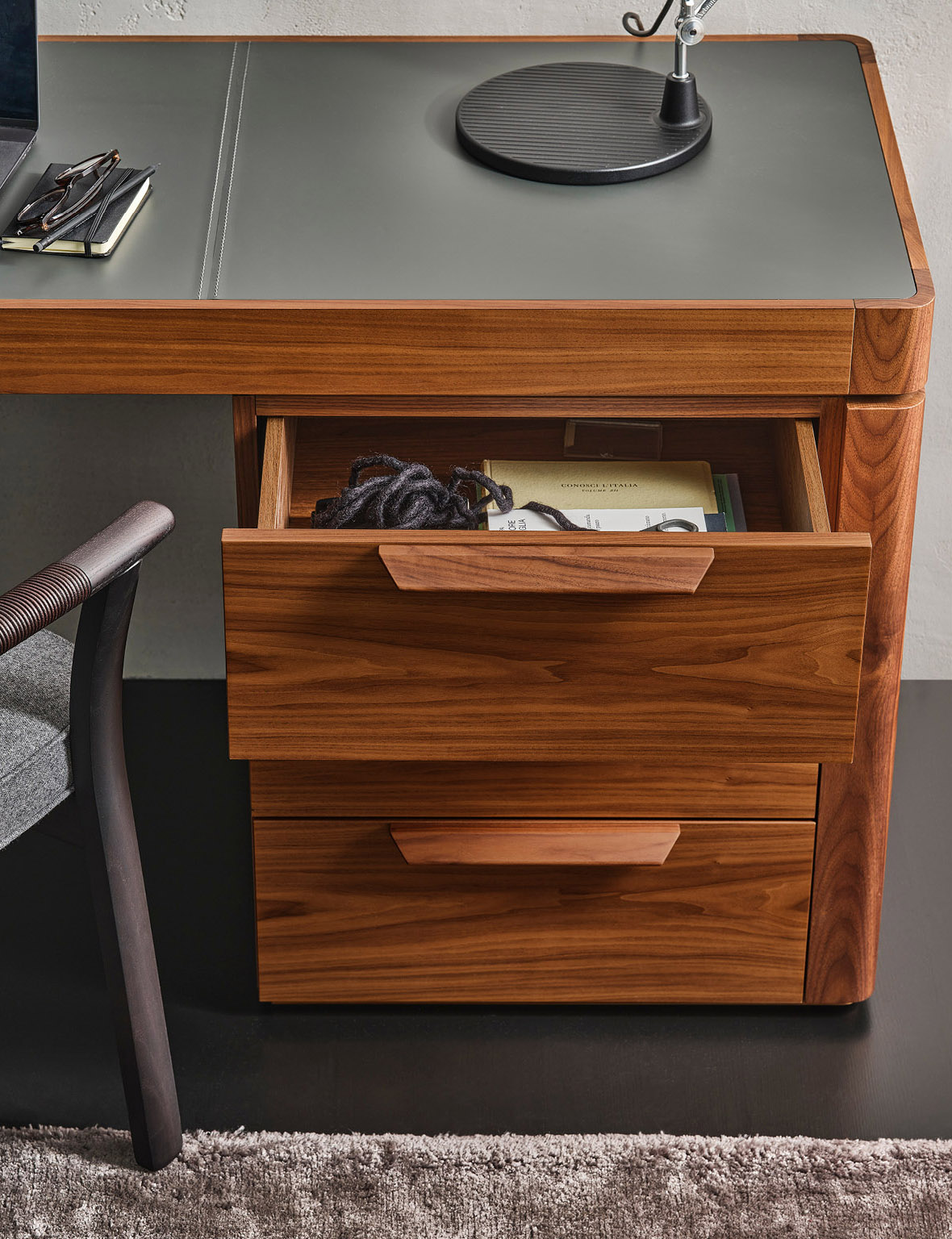 Письменный стол Afrodite от Карло Баллабиа для компании Porada сочетает в себе элегантность, функциональность и эстетическую привлекательность. Он выполнен из высококачественного орехового массива Canaletta, что придает ему изысканный и благородный вид.
