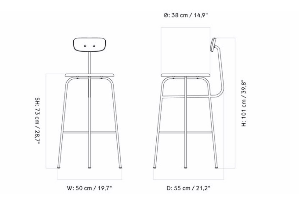 AFTEROOM BAR CHAIR отличается изысканным дизайном. Его размеры составляют: высота 101 см, ширина 50 см, глубина 55 см. Высота сиденья 73 см, глубина сиденья 38 см. Эти параметры обеспечивают оптимальное удобство использования.