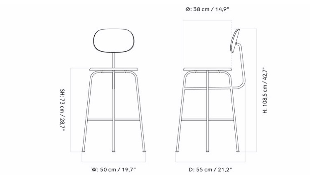 Высота стула составляет 108,5 см. Ширина – 50 см. Глубина – 55 см. Высота сиденья – 73 см. Глубина сиденья – 38 см. Такие размеры идеально подходят для барной стойки или кухонного острова.
