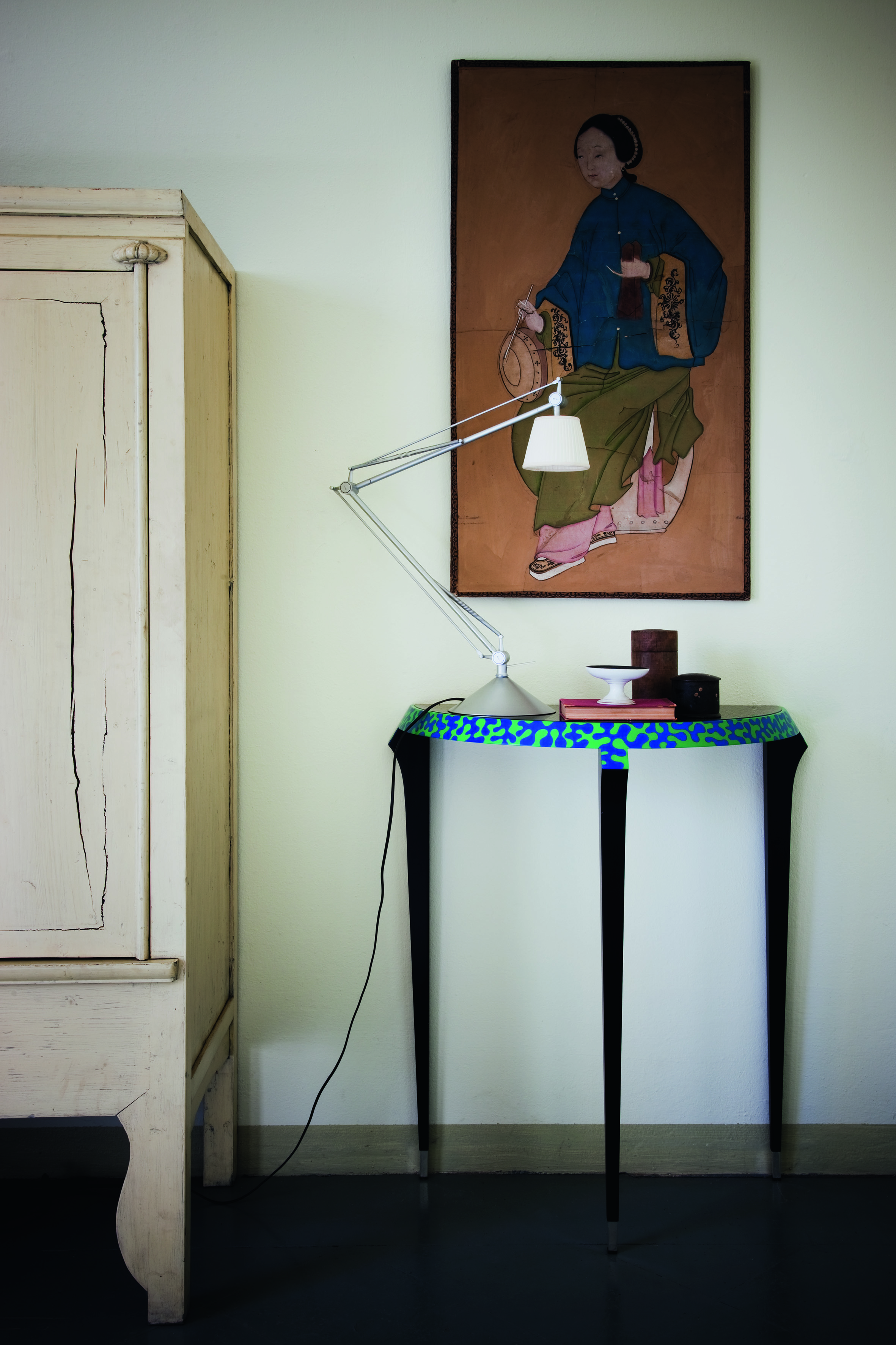Каркас консоли Agrilo изготовлен из лакированной древесины. Ножки данной модели выполнены из латуни в отделке под серебро. Топ сделан из гладкого лакированного стекла. Кромка сине-зеленого цвета декорирована вручную. Agrilo входит в лимитированную коллекцию от Zanotta. Подробности уточняйте у менеджеров или в PDF инструкции.