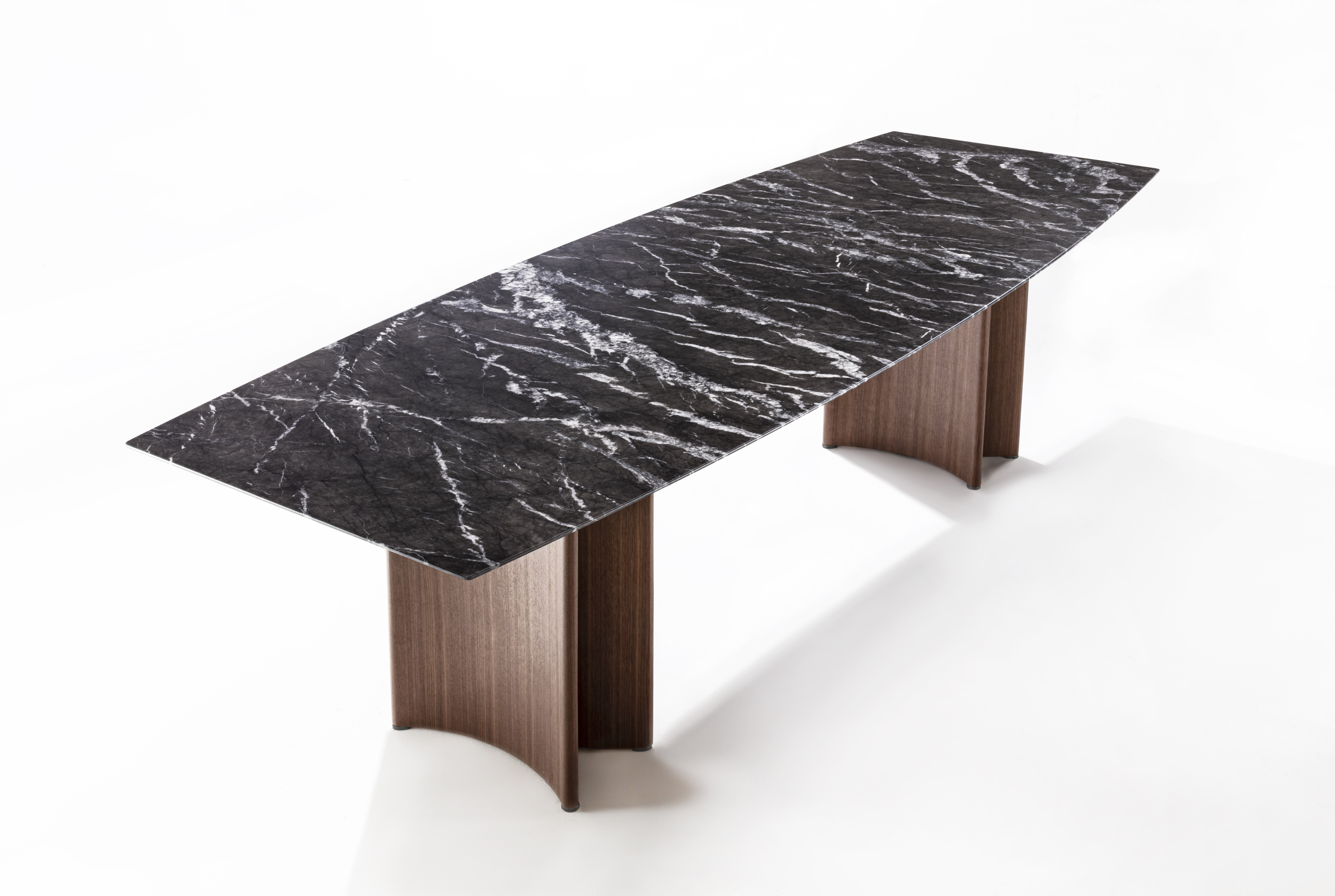 Модель M привлекает внимание своей утончённой эстетикой. Её основание состоит из двух полукруглых элементов, плавно переходящих в ореховый канал. Это сочетание придаёт столу визуальную гармонию и элегантность. Мраморная столешница толщиной 20 мм с аккуратно обработанной фаской подчёркивает её благородство и роскошный вид. Прочная алюминиевая панель толщиной 15 мм чёрного цвета обеспечивает надёжную поддержку столешницы. Она придаёт конструкции дополнительную прочность и завершённость. Металлические наконечники на ножках не только придают столу завершённый внешний вид. Они также обеспечивают его устойчивость и долговечность.