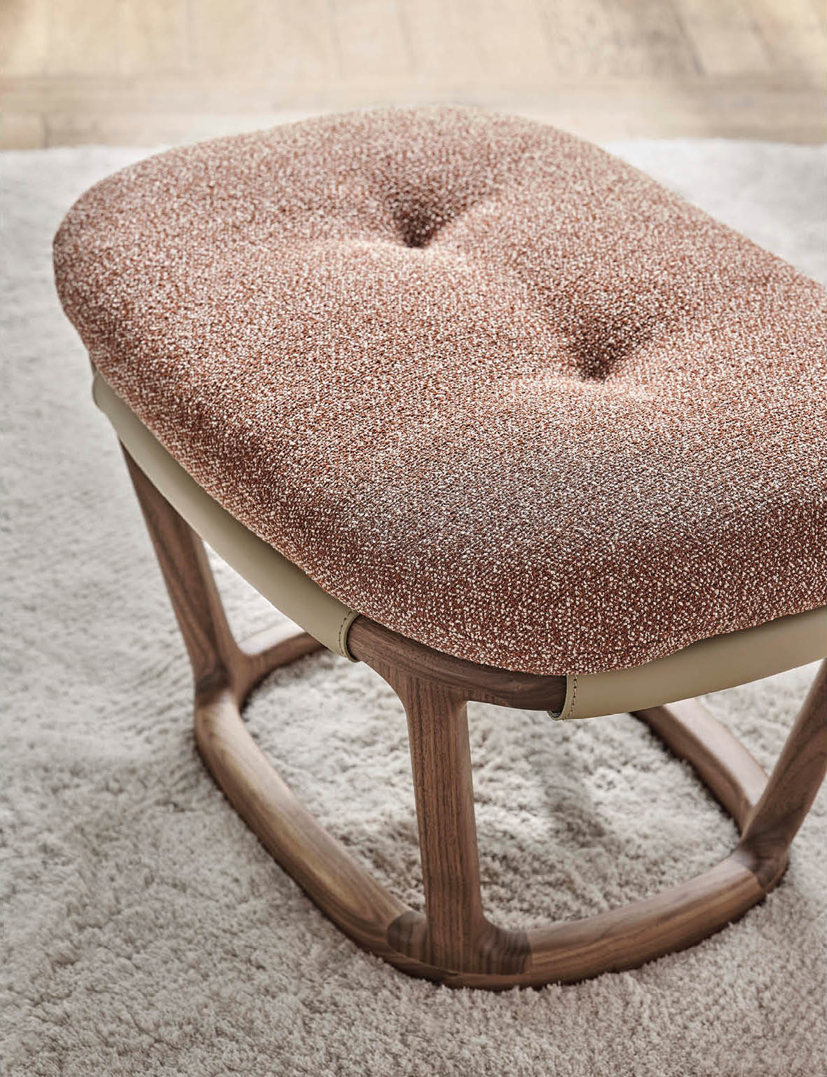Пуф Amarantha воплощает утончённую элегантность и гармоничное сочетание форм в дизайне интерьера. Его конструкция основана на прочном каркасе из массива ореха каналетта, который не только придаёт изделию солидность, но и гарантирует его долговечность. Декоративная подушка, выполненная в цветах коллекции и украшенная ракушкой из соединённого Cuoietto, добавляет изысканности и завершённости облику пуфа.