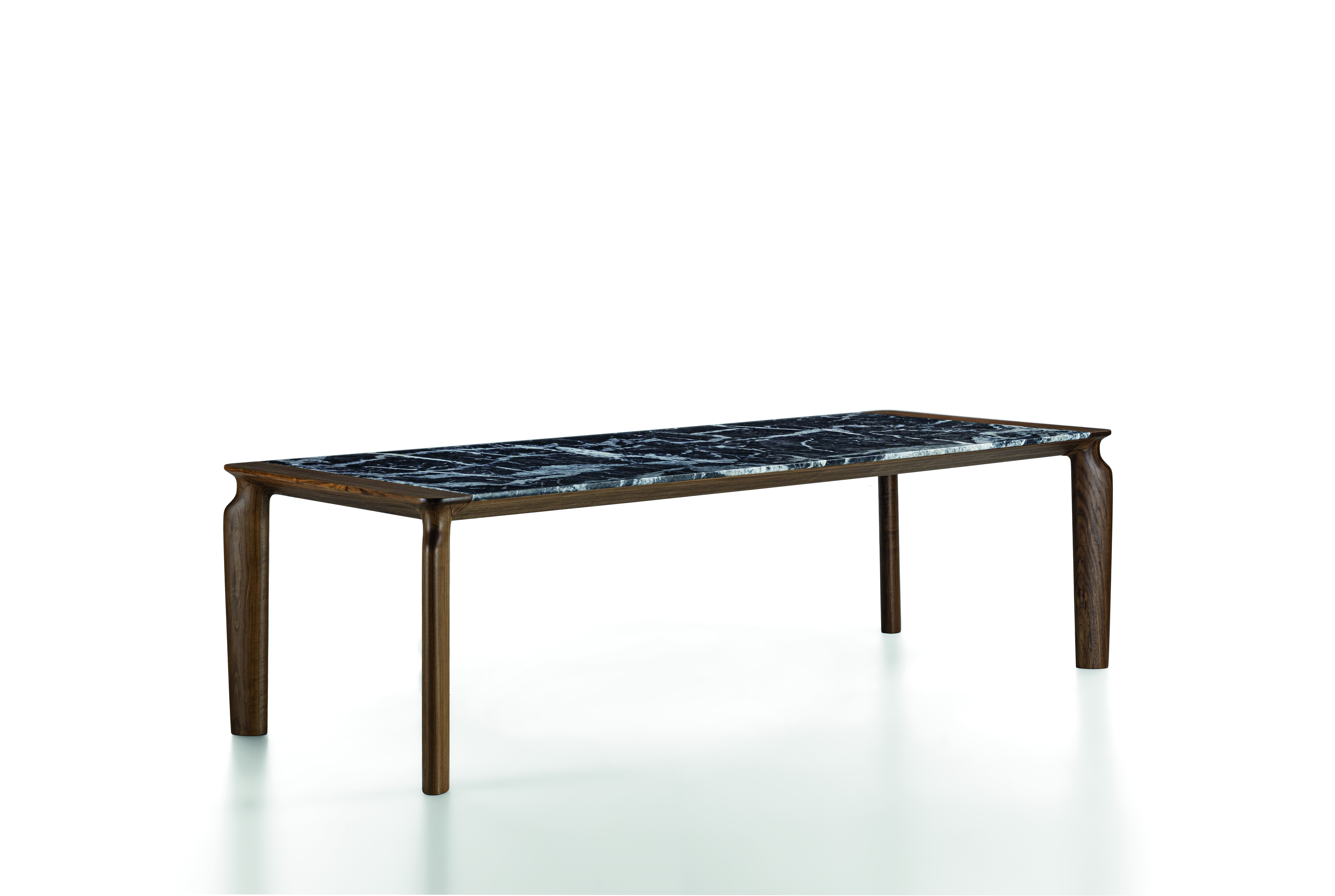 Коллекция включает две модели, которые позволяют выбрать оптимальный вариант для любого интерьера. Первая модель, Amphora M, представляет собой обеденный стол с мраморной столешницей, которая отличается своим благородным блеском и фиксированным размером. Мрамор добавляет столу роскошный и утончённый вид, делая его идеальным для классических и современных интерьеров. Ножки стола по периметру выполненные из цельного ореха, подчёркивают природную красоту и придаёт конструкции дополнительную прочность.