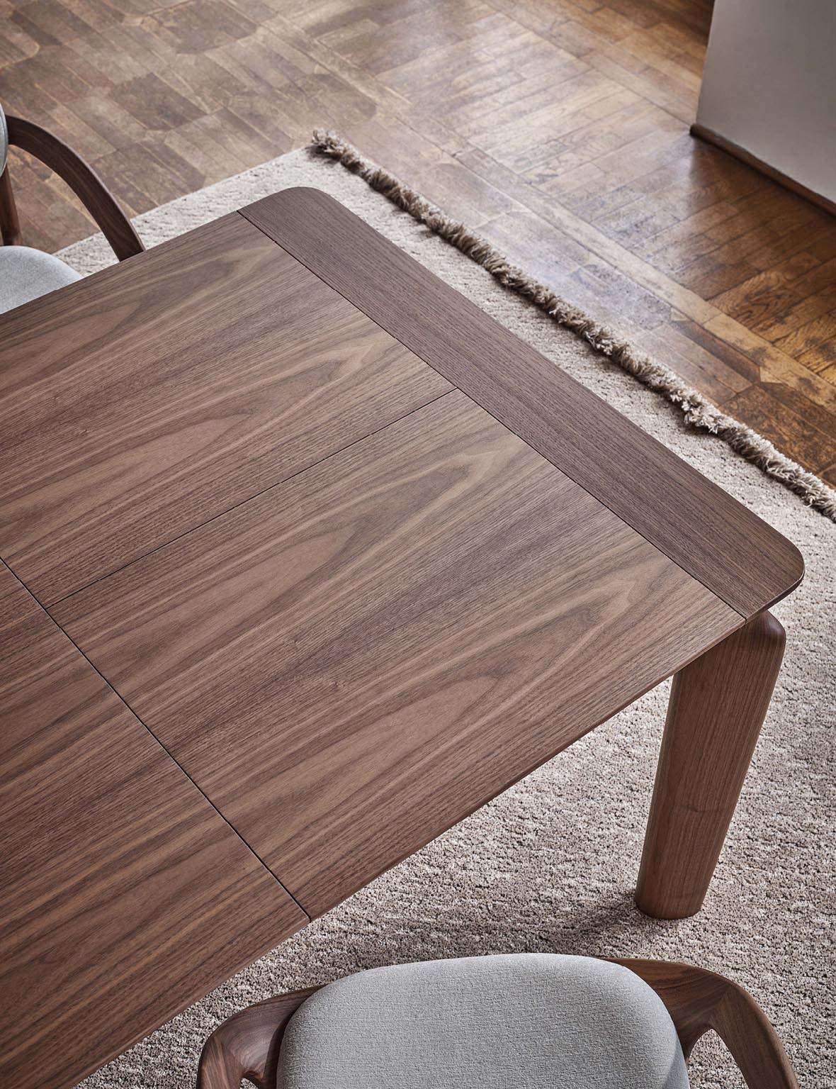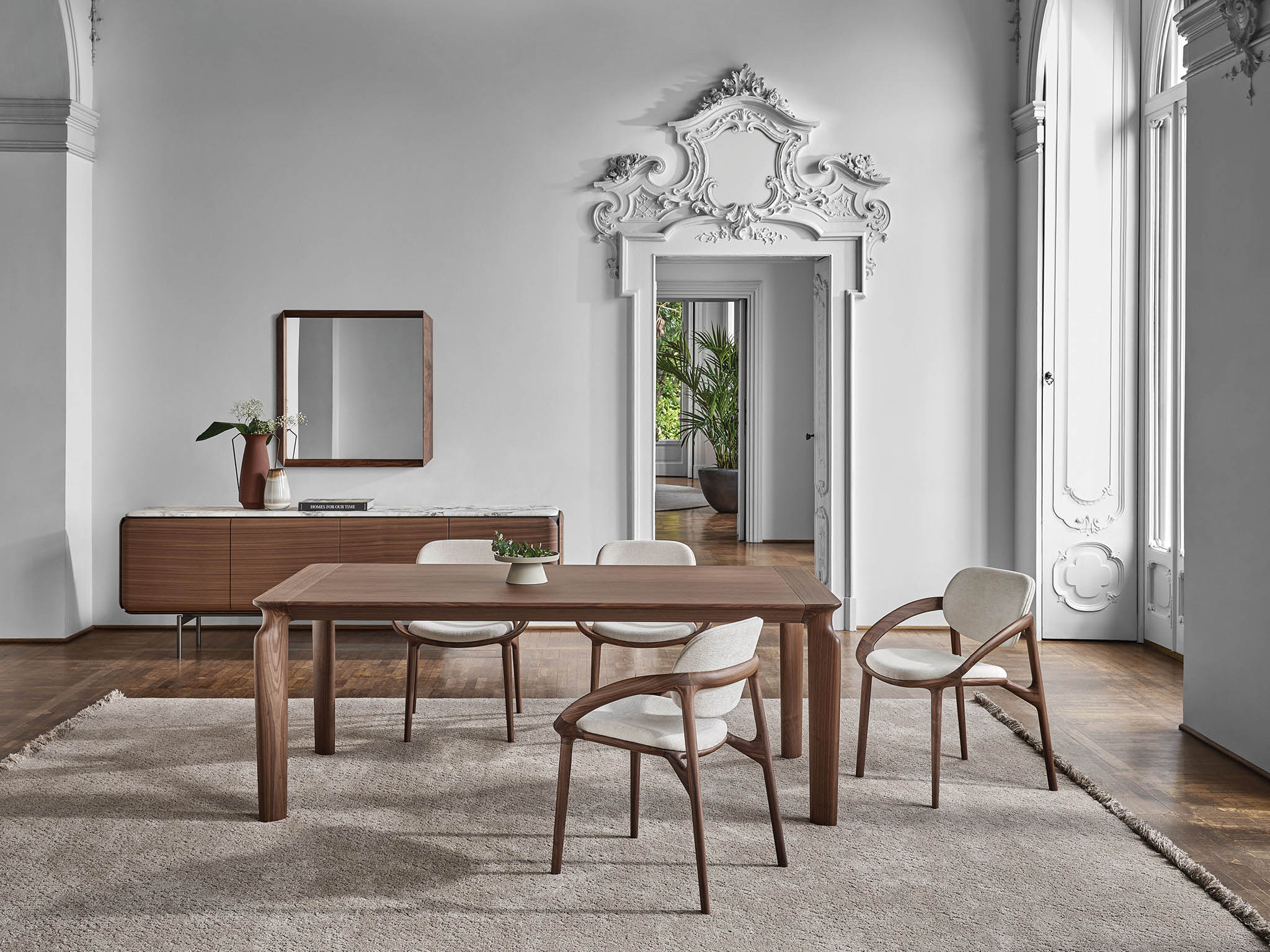 В ассортименте Porada появился стол Amphora, который сочетает в себе элегантность и функциональность. Этот выдвижной обеденный стол с верхней частью из ореха и ножками по периметру выполнен из массива ореха, что придает изделию натуральный и роскошный вид. Эта деталь подчеркивает экологичность и премиальность модели, делая её подходящей для различных стилей интерьера.