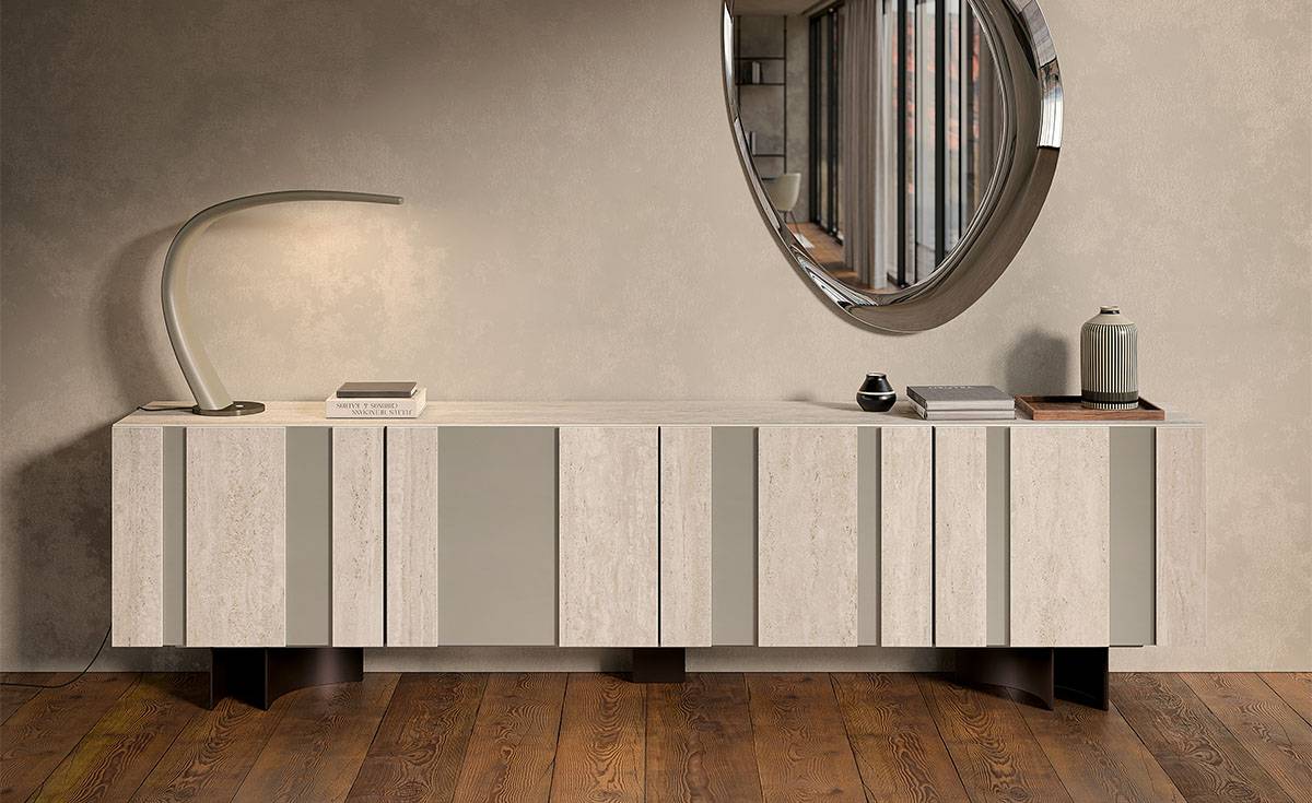 Изысканный деревянный комод с ритмичным чередованием отделок на фасадах. Вертикальные полосы разной ширины создают динамичную композицию, напоминающую клавиши пианино в их контрастном переходе от светлых к темным тонам.