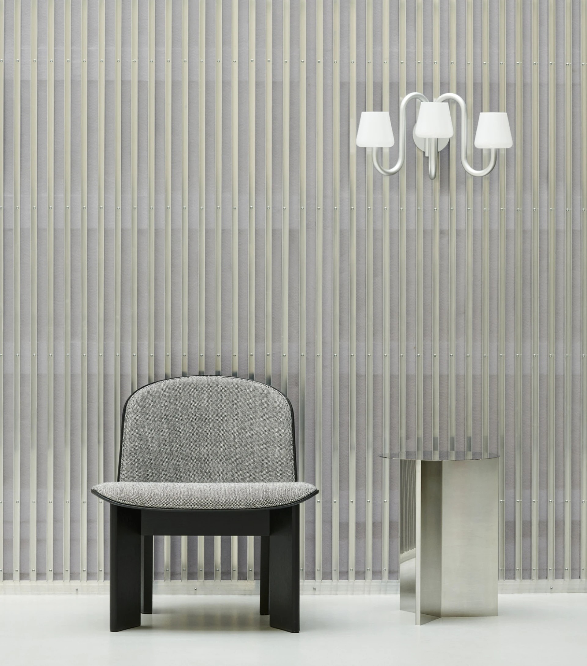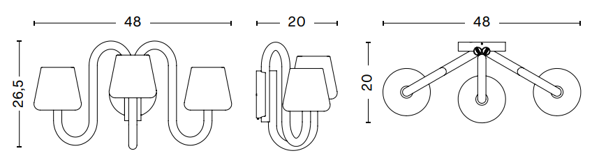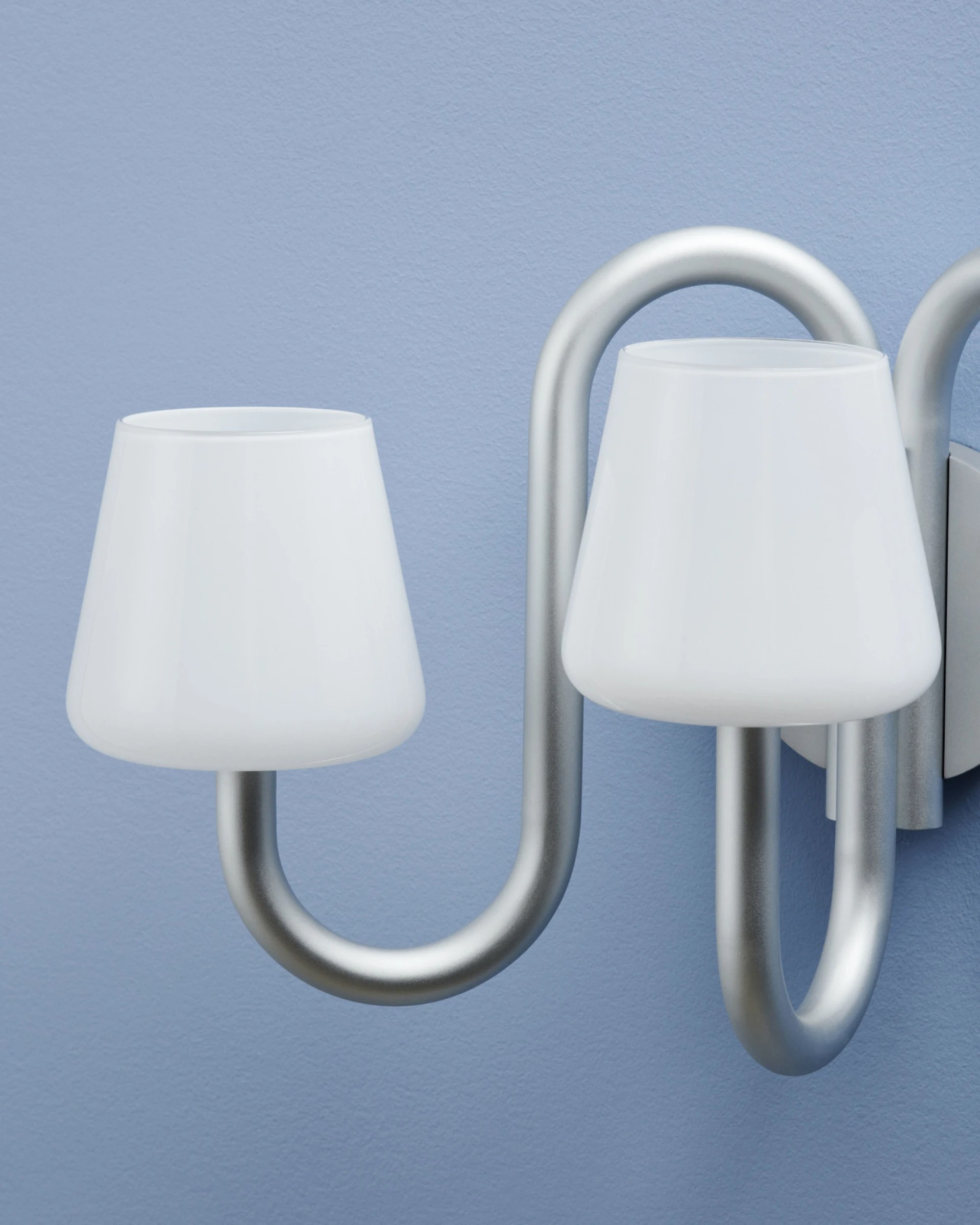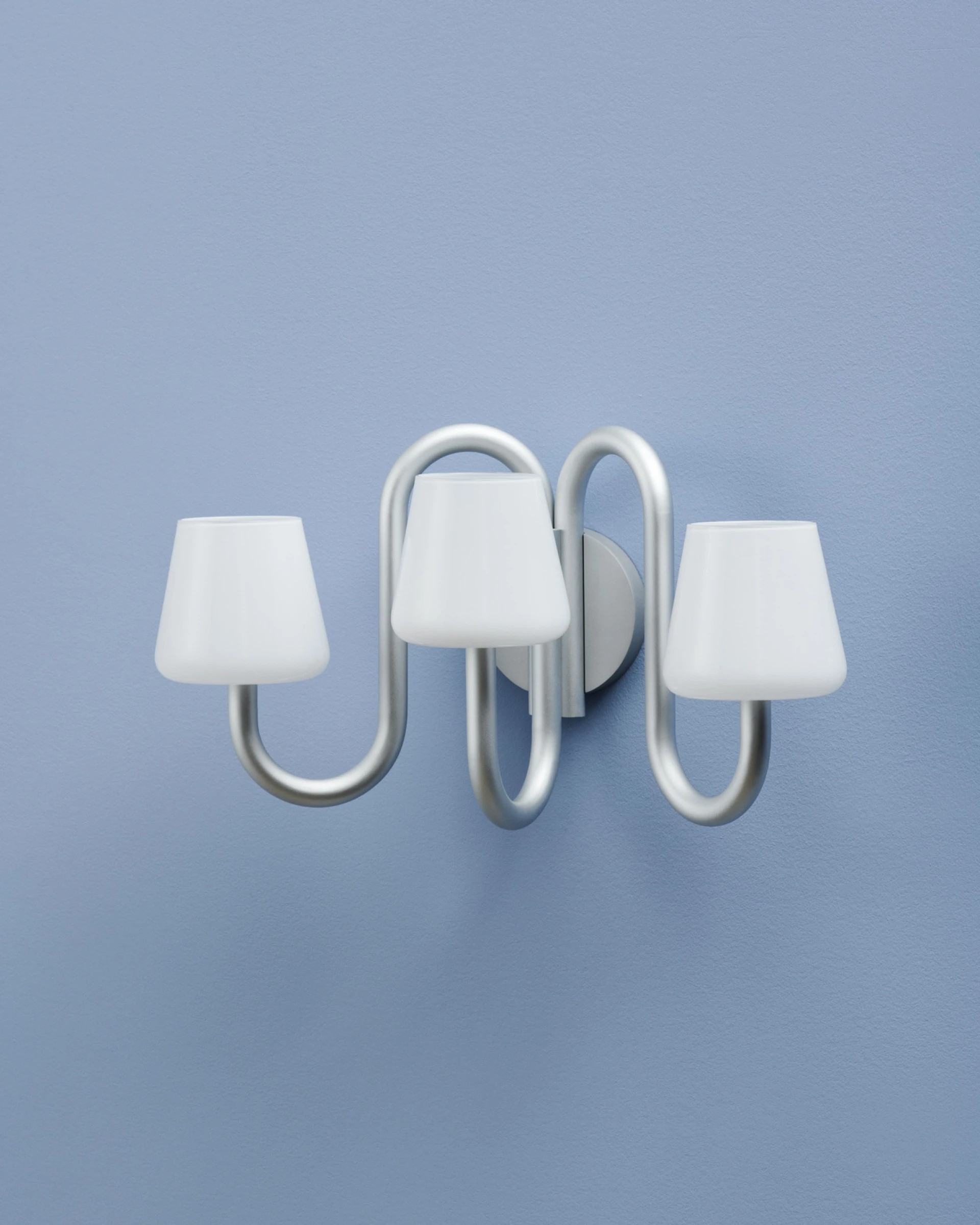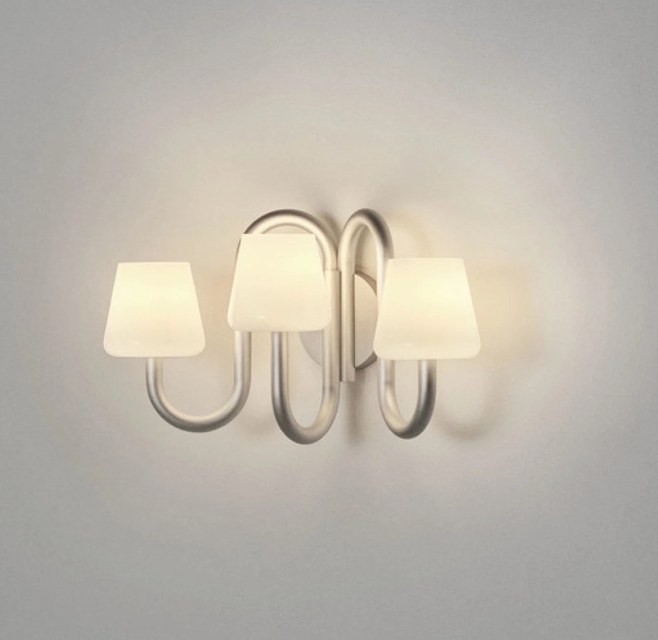 Бра Apollo сохраняет базовую конструкцию традиционного настенного светильника, однако его отличает скульптурный и функциональный дизайн. Три абажура из выдувного опалового стекла, расположенные над изогнутыми трубчатыми кронштейнами, создают интересный контраст между органичными формами абажуров и промышленной алюминиевой рамой.