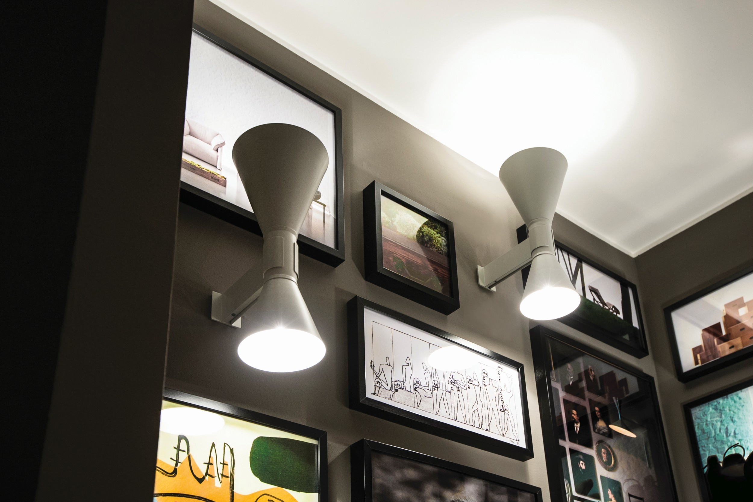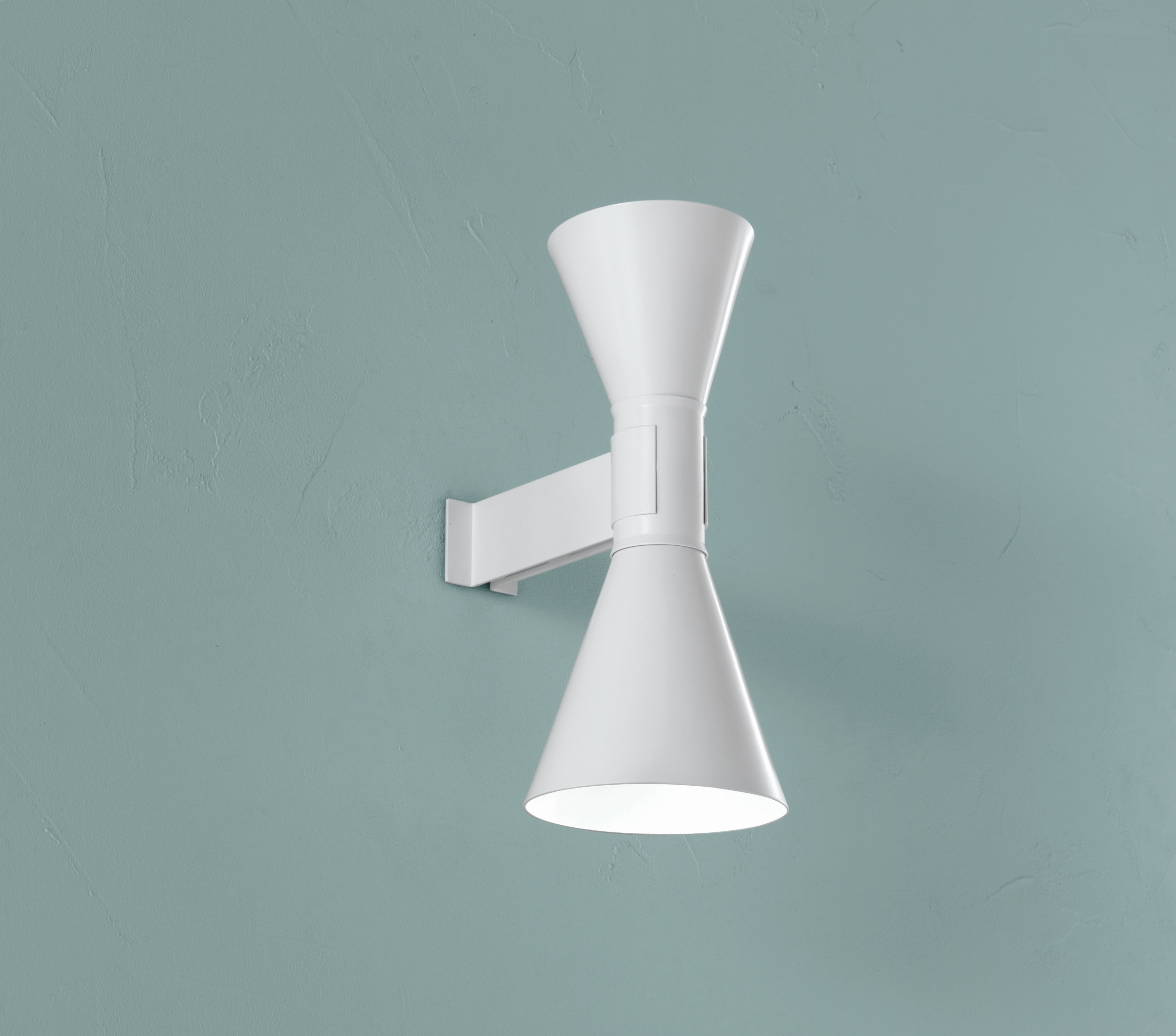 Настенный двойной светильник с алюминиевым корпусом. Лампа имеет два источника света, нижняя обеспечивает прямое освещение, в то время как верхняя обеспечивает диффузный рассеянный свет. Светильники могут быть исполнены в двух цветах: матовый белый или серый.
