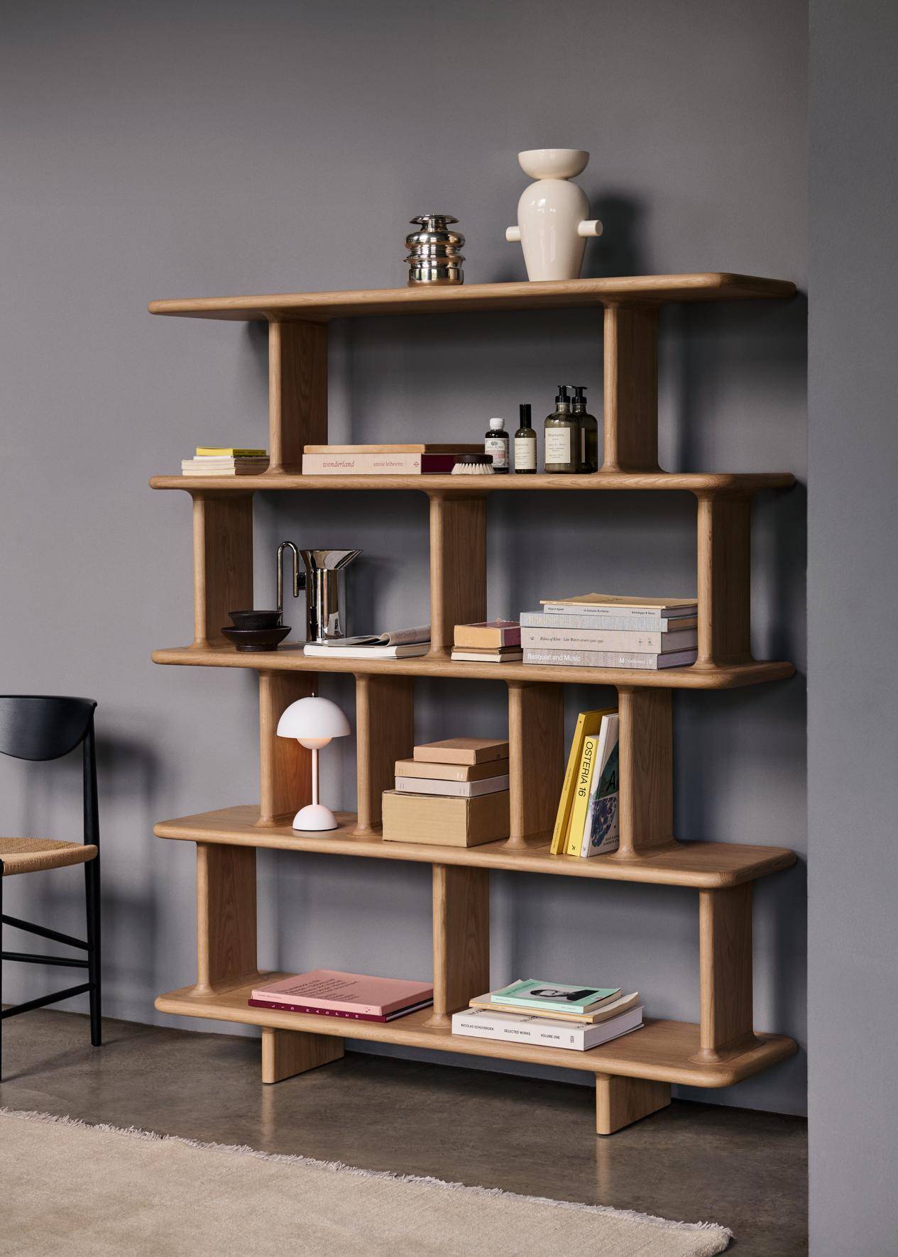 JH45 — самая динамичная, с наклонными, переплетающимися полками, словно ветви, застывшие в движении. Она не статична — она живёт. Её форма не просто хранит — она заставляет вас менять расположение вещей, открывая новые комбинации, новые смыслы.