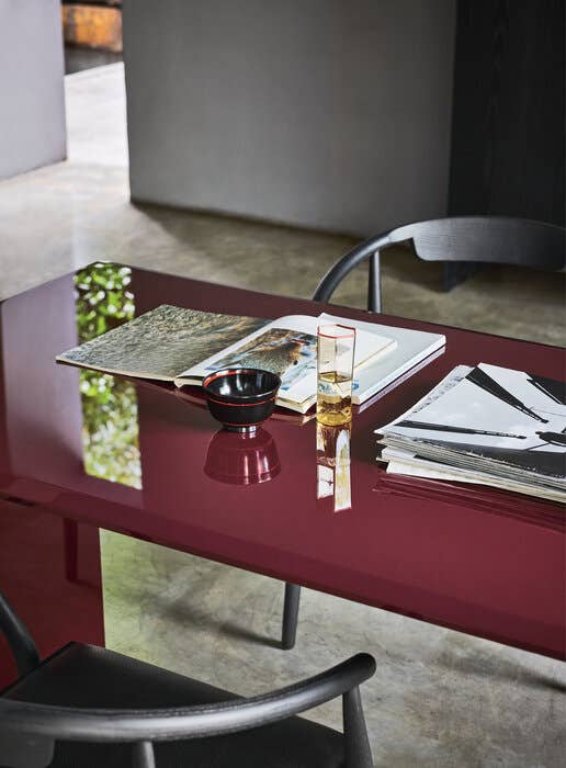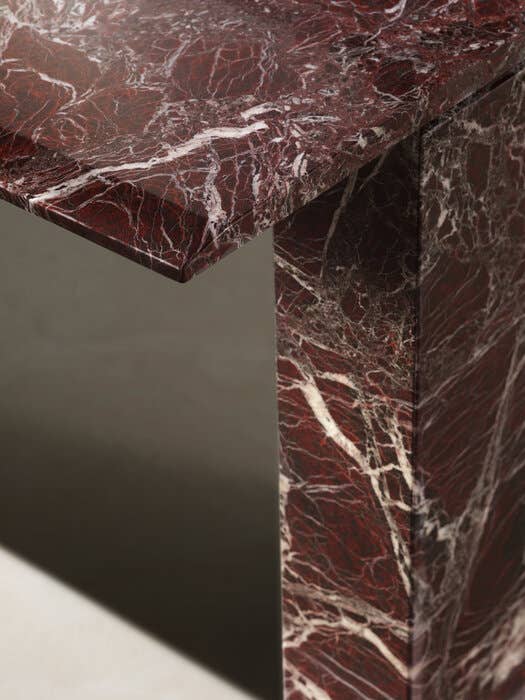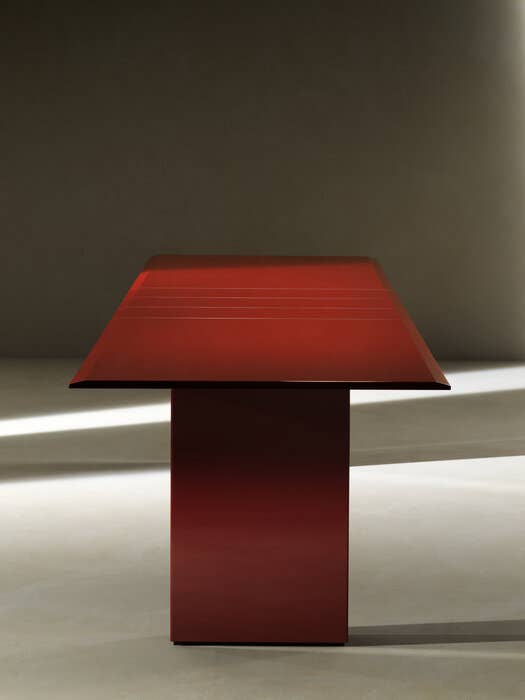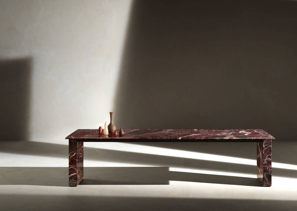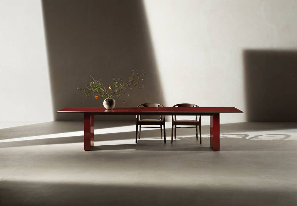 Фиксированный вариант стола Assiale представлен в двух размерах: 250 см и 294 см. Основное его преимущество — использование красного мрамора Levanto. Этот материал не только придаёт столу роскошный и монументальный вид, но и отличается высокой прочностью и долговечностью. Мрамор Levanto сохраняет свою элегантность и минималистичный дизайн на протяжении многих лет, делая стол не только красивым, но и надёжным элементом интерьера.