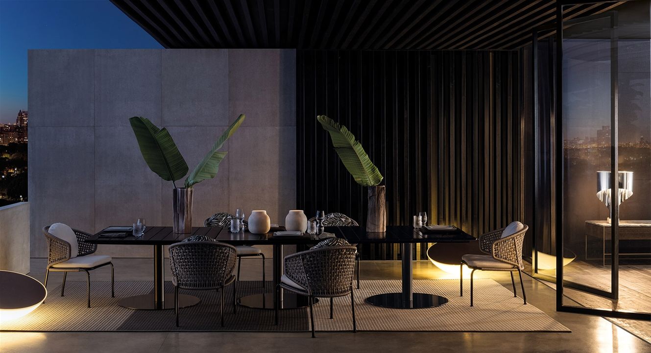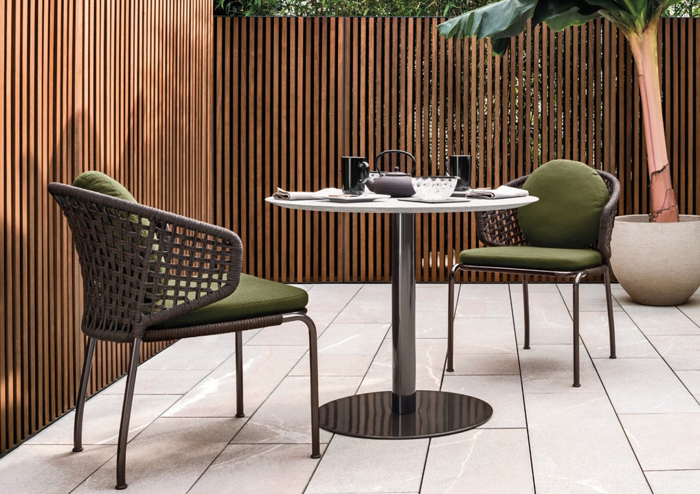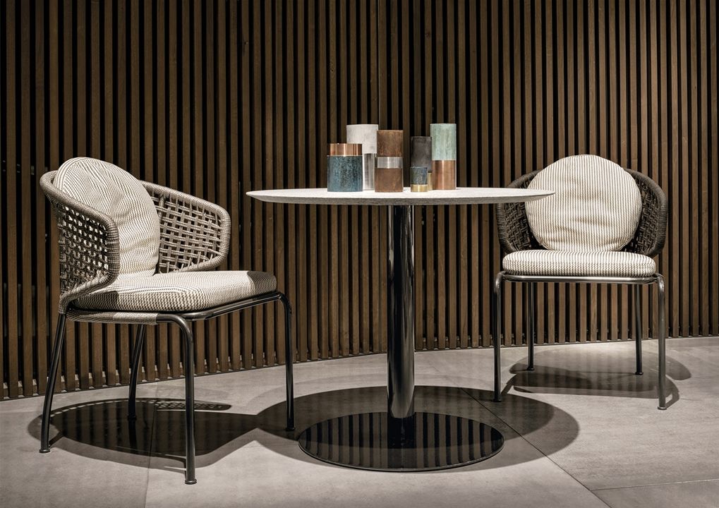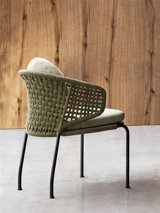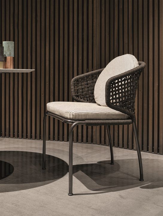 Коллекция Aston от фабрики Minotti включает в себя диваны, кресла, стулья, шезлонги. Каркас стула Aston Cord Outdoor изготавливается из металла, который покрывается защитным лаком. Сиденье и спинка наполнены пенополиуретаном, который отличается упругостью. В качестве обивки используется ткань. Доступно несколько вариантов цвета обивки. Спинка и подлокотники оформляются при помощи переплетения тканевых шнуров. Стул можно использовать на улице, благодаря использованию специальных влагостойких материалов.