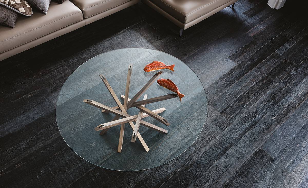 Кофейный стол Atari представляет собой мастерское сочетание структурной сложности и визуальной лёгкости. Его дизайн бросает вызов традиционным представлениям о конструкции, превращая функциональный предмет в динамичный арт-объект. Основание стола образовано восемью деревянными элементами, которые, сложно переплетаются, создавая устойчивую, но визуально невесомую структуру. Стол доступен в круглой и квадратной версиях, а также в увеличенном размере с двойным основанием, что усиливает скульптурный эффект и делает его доминантой в пространстве. Прозрачная столешница не скрывает изящную конструкцию, позволяя в полной мере насладиться её красотой со всех углов обзора.
