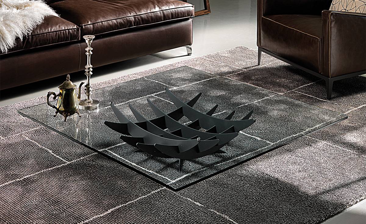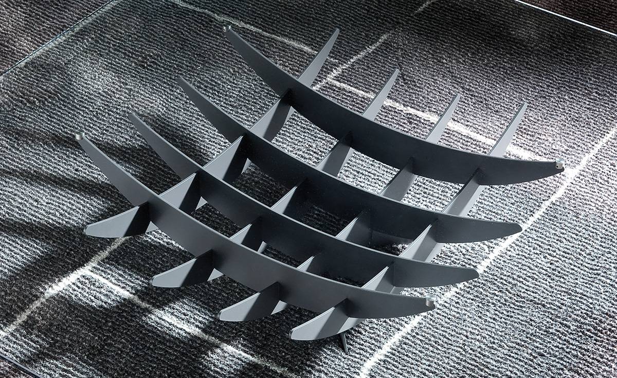 Стеклянная столешница покоится всего на четырех опорных точках, оставляя сложную структуру основания визуально свободной и создавая впечатление, что она парит в воздухе. Наличие различных форм и размеров позволяет идеально вписать стол в помещения разного масштаба и стилистики.