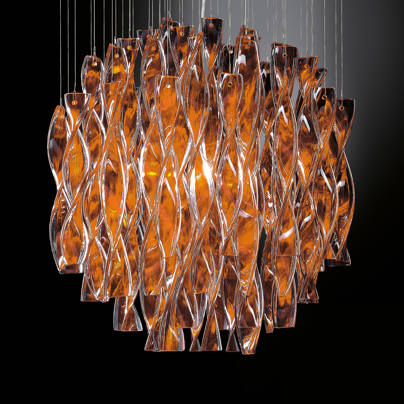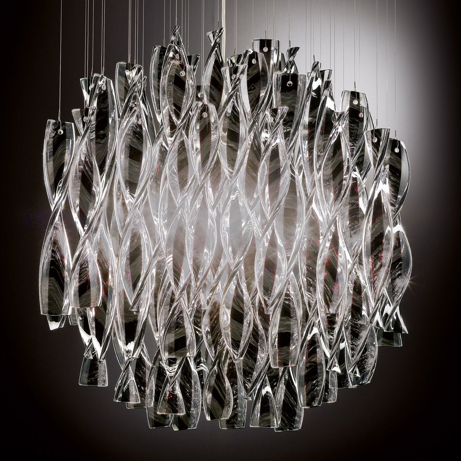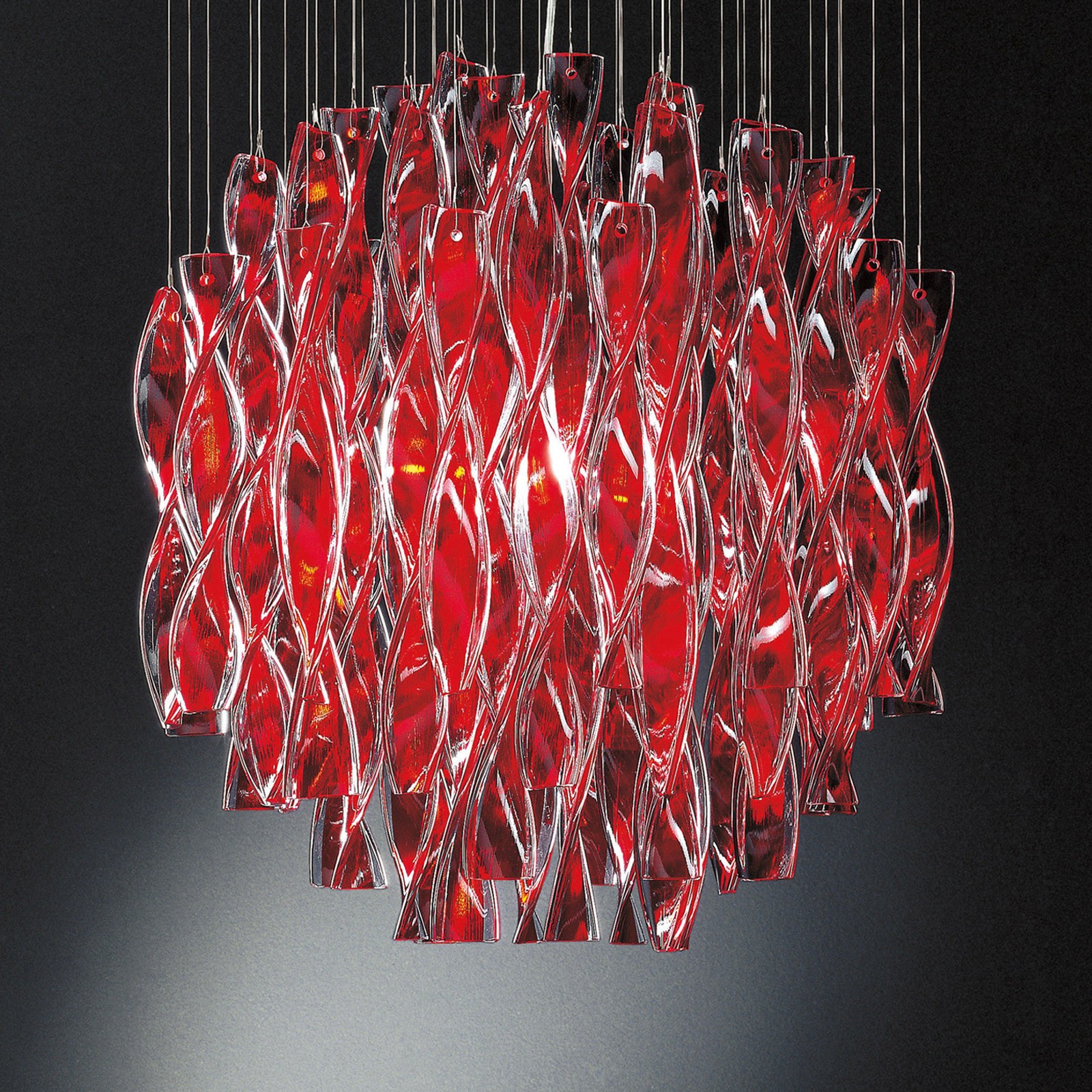 Соблазнительные формы, извилистый образ, который играет на текучести; эстетические, визуальные и тактильные характеристики, которые касаются эмоционального восприятия объекта. Волны света, полосы цвета, хрустальная пьеса: шелковистые волны бурных вод, сверкающие объекты, вдохновленные гидродинамическими формами морских животных. Коллекция Aura является не только инструментом, но и языком, который выражает мечты, желания и ощущения. Эти светильники - воплощенный свет, что привлекает вас как на когнитивном, так и на эмоциональном уровне; наблюдатель инстинктивно протягивает руку, чтобы коснуться кристаллов, выйти за рамки визуального восприятия. Извилистые и отражающие поверхности создают спонтанные эффекты, где цвет сочетается с воплощением, создавая светильник, который определяет и интерпретирует сам свет: утонченный в оттенках белого, страстный в красном, таинственный в черном. В коллекции Aura стекло производится полностью вручную, используя традиционные методы итальянских мастеров.