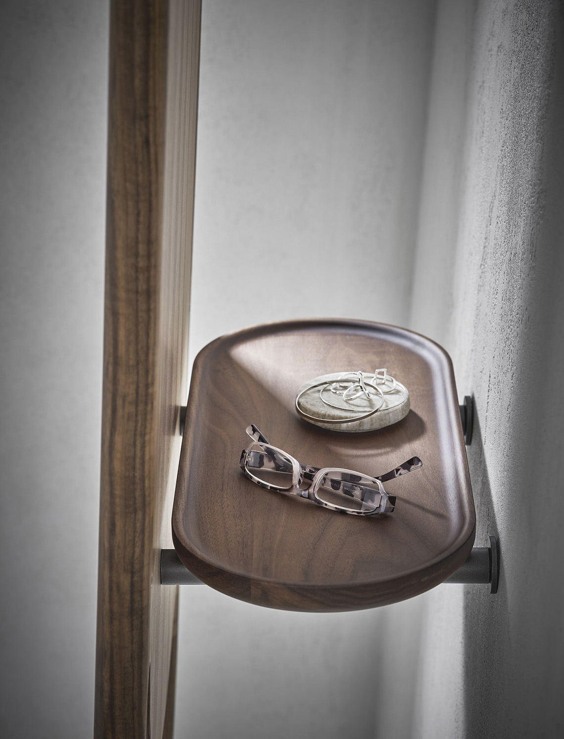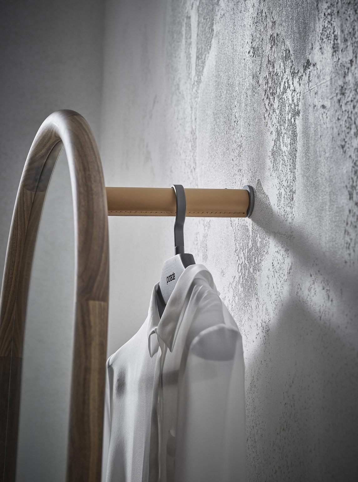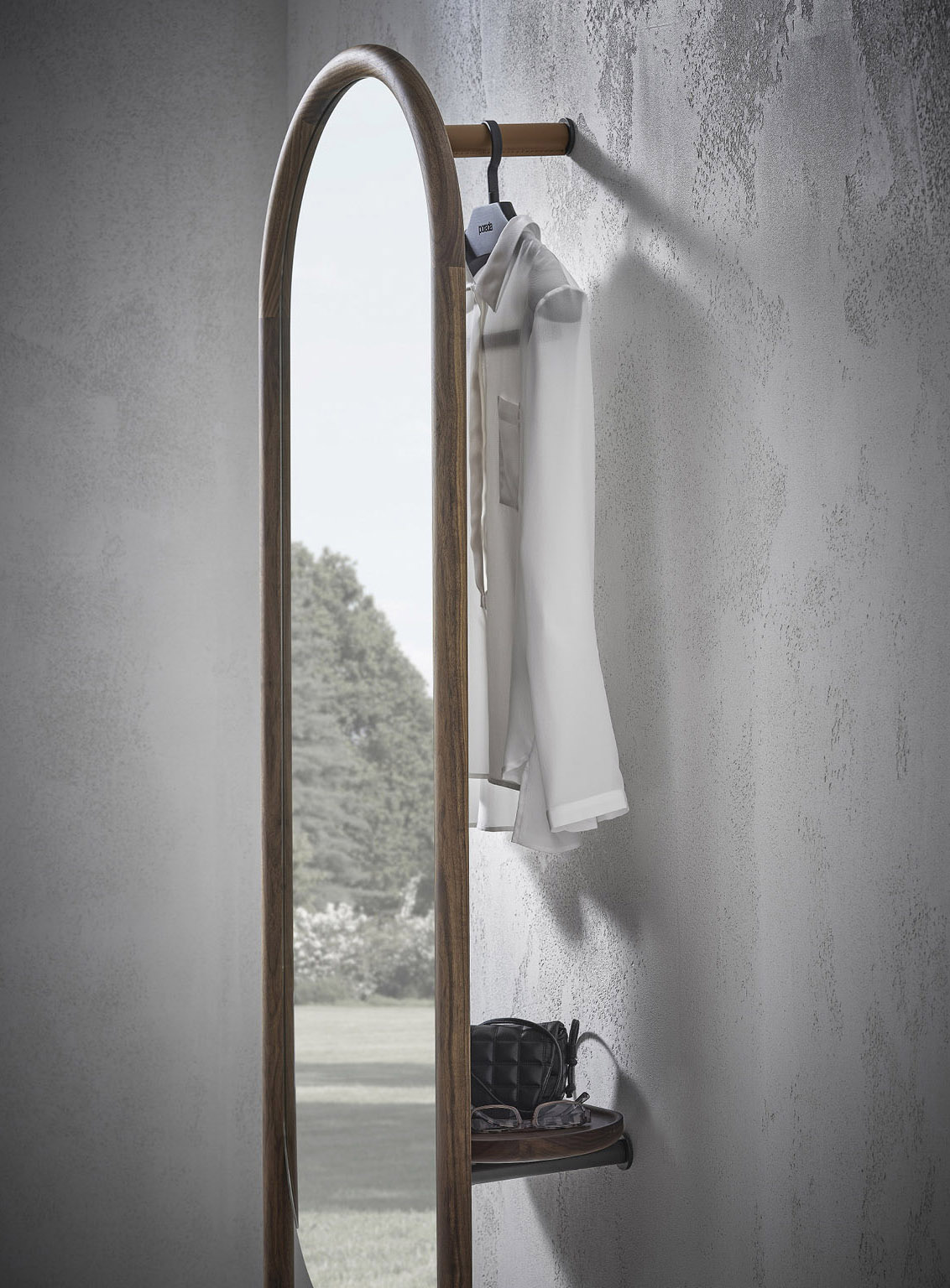 Задняя стенка зеркала дополнена элегантной полкой из того же ореха Canaletta, а также перекладиной для вешалок, покрытой состаренной кожей Cuoietto. Это сочетание материалов создаёт ощущение тепла и уюта, делая зеркало не только стильным, но и функциональным элементом интерьера. Перекладина способна выдержать до трёх вешалок с зажимами или без них, что позволяет эффективно использовать пространство и организовать хранение одежды.