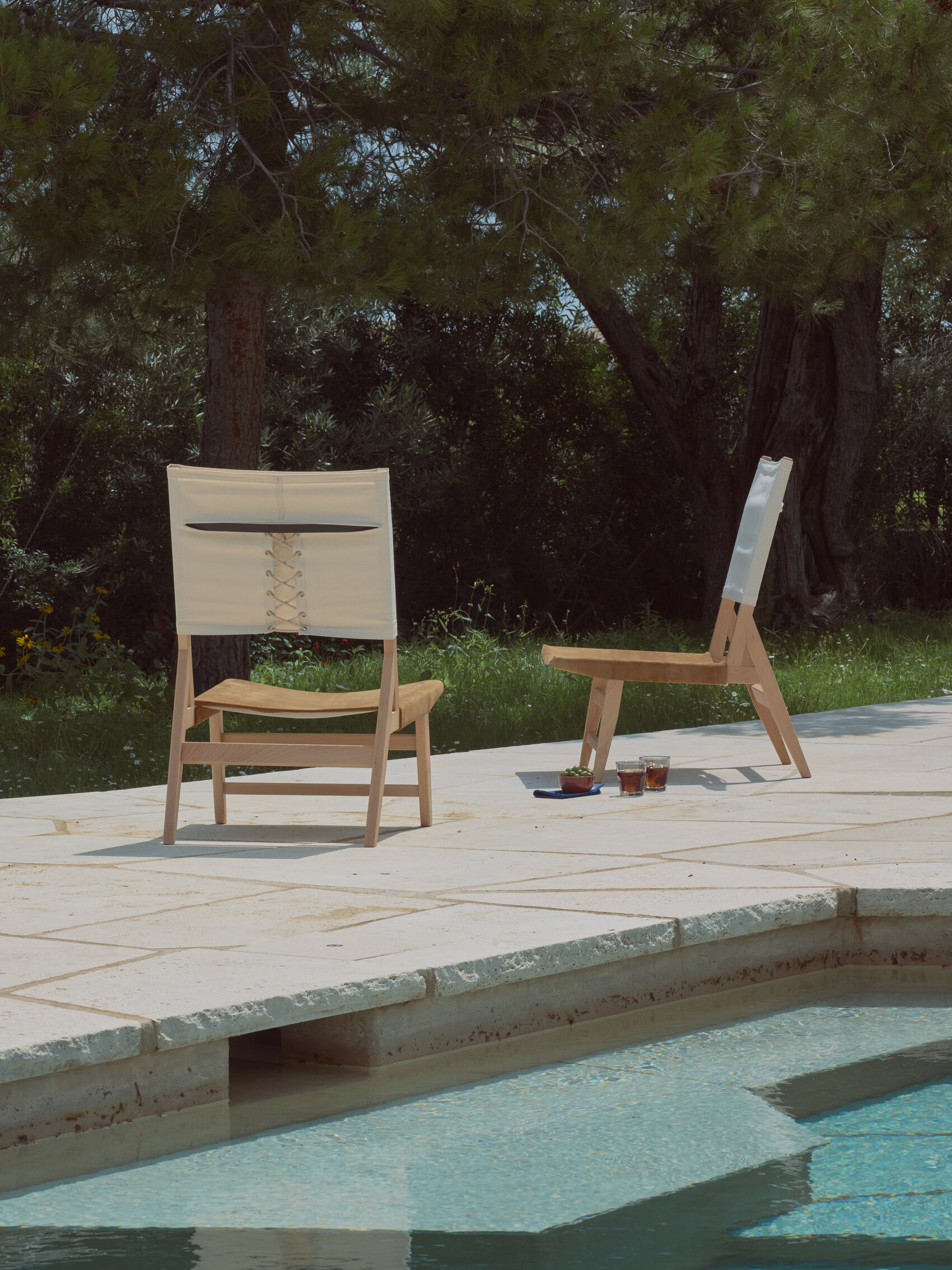 Сиденье обито натуральной замшевой кожей. Она приятна на ощупь и придаёт мебели благородный вид. Спинка выполнена из белой брезентовой ткани. Она натянута с помощью морского каната. Этот приём вызывает ассоциации с такелажем парусника. ненавязчиво отсылая к морской тематике, столь близкой средиземноморской культуре.