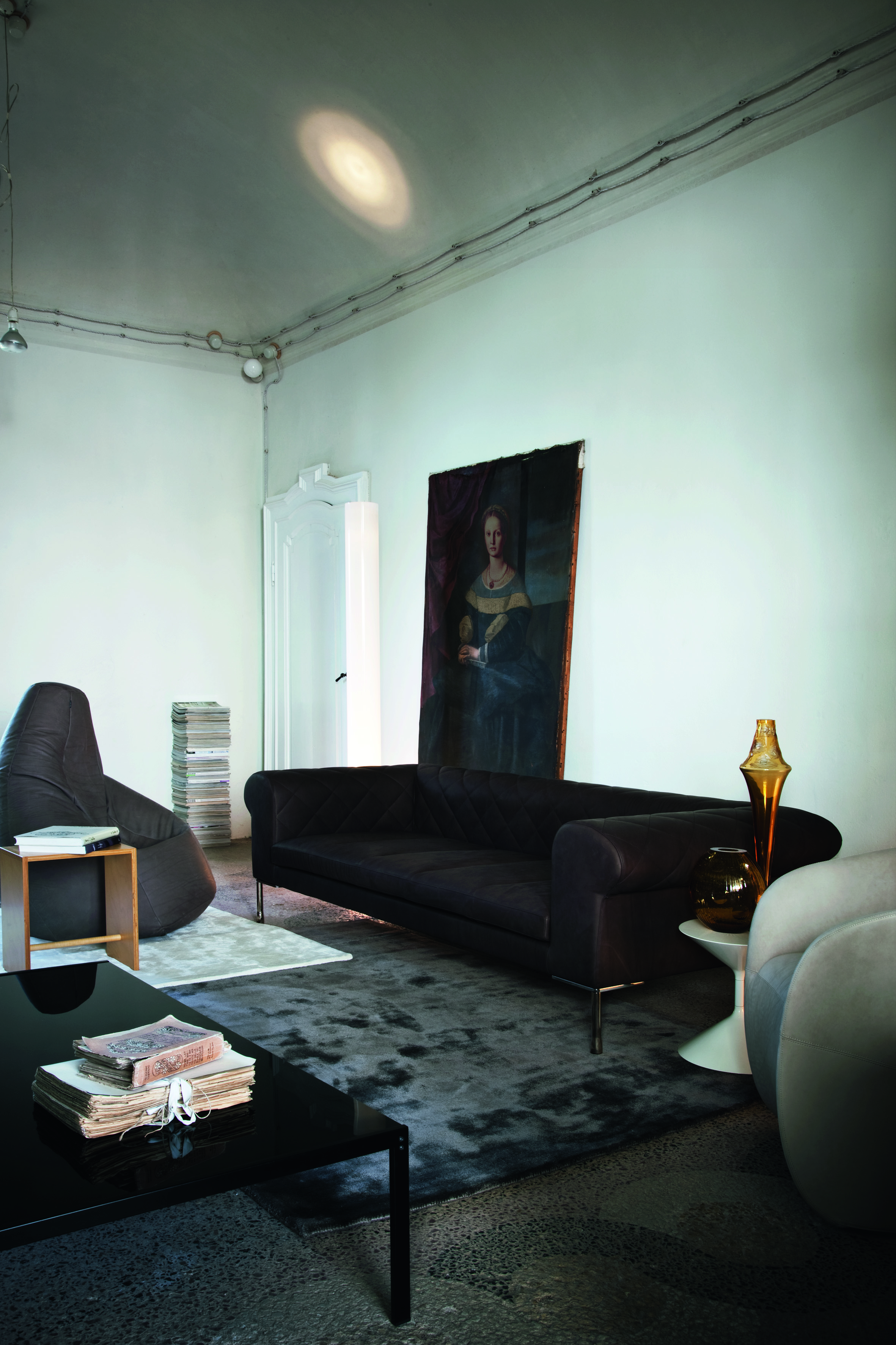 Островной диван на стальном каркасе. Упругость сиденью придают эластичные ремни. Наполнитель - полиуретан или дакрон DuPont. Внутренний чехол из нейлона не снимается. Съемная обивка из кожи или текстиля. Декоративная стежка украшает спинку и подлокотники. Ножки из хромированной стали или покрыты лаком графитового цвета.