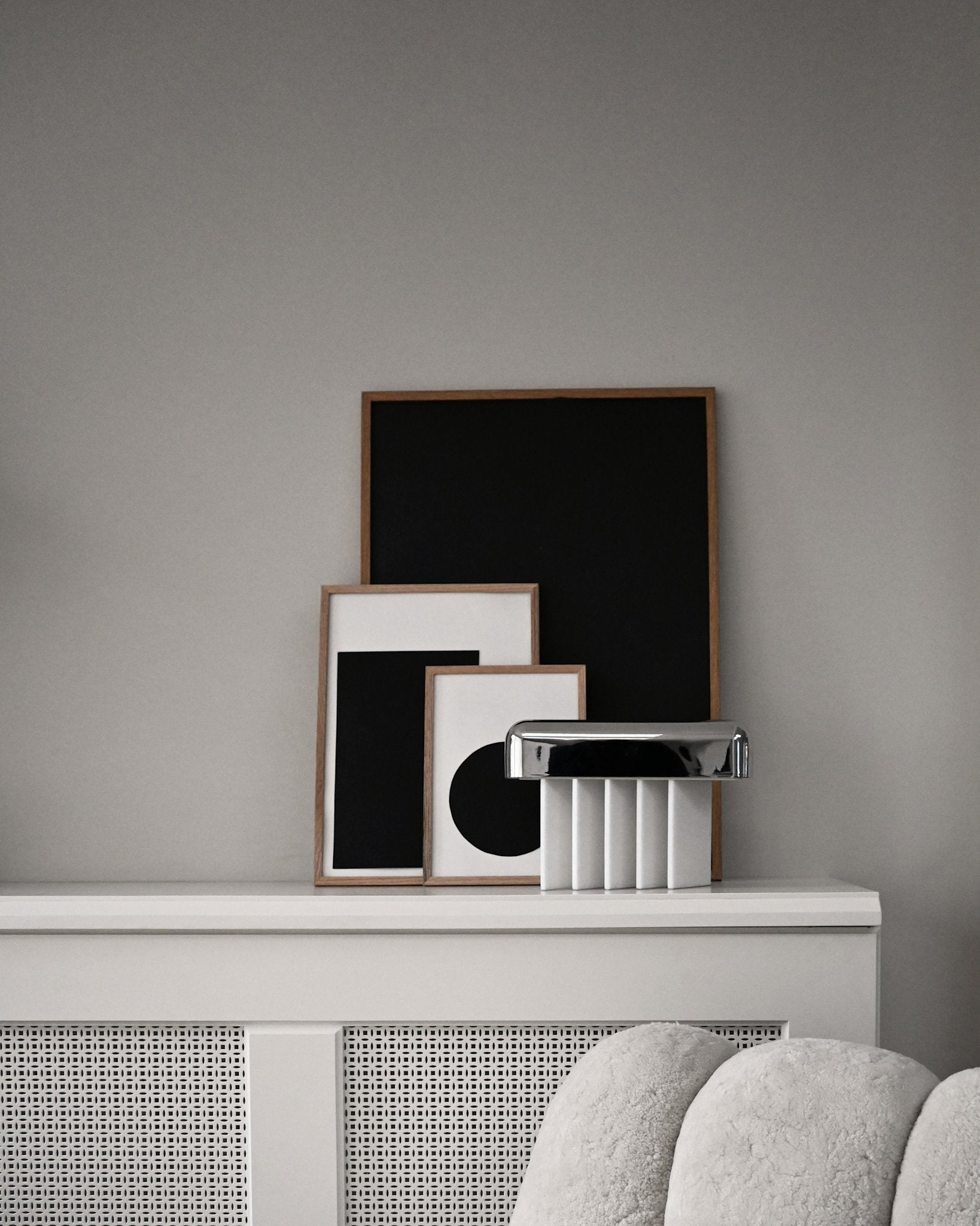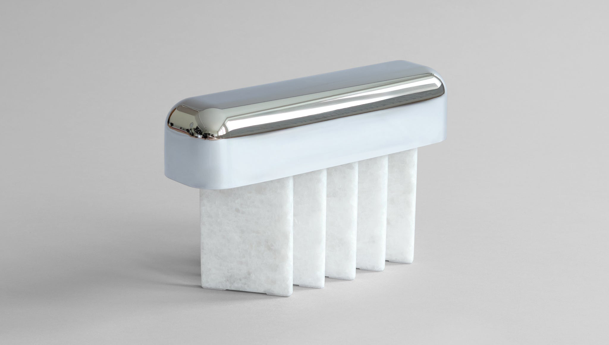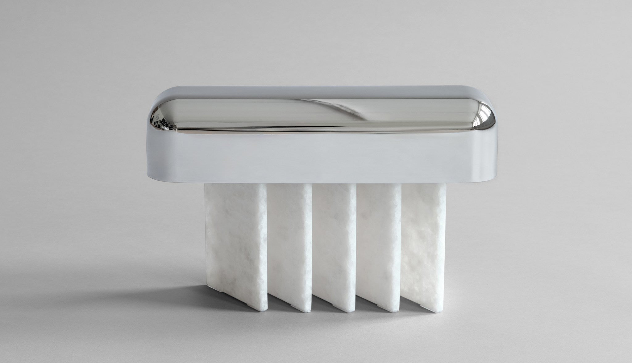 Зеркальная поверхность металлического плафона не только отражает окружающее пространство, играя со светом и тенью. Она также подчёркивает лаконичность силуэта. Абажур, словно парящий над основанием, придаёт лампе лёгкость. Несмотря на использование таких основательных материалов, как мрамор и металл, лампа выглядит воздушной.