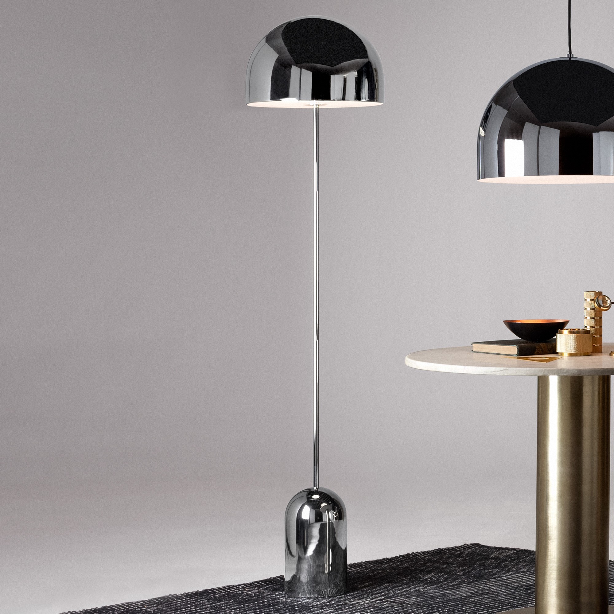 Том Диксон разработал напольный светильник Bell с чистыми, простыми линиями. Конструкция выполнена из хромированной прессованной стали и состоит из двух куполов: основания и абажура, прекрасно симметричных друг другу. Переключатель находится в основание на шнуре питания. Этот светильник добавляет элегантности и оригинальности любому помещению. Отражающий материал хорошо вписывается в любой обстановке в которой он находится. Это истинное произведение искусства, созданное одним из самых известных талантов в мире освещения и мебели, названным дизайнером года по многим важным журналов.