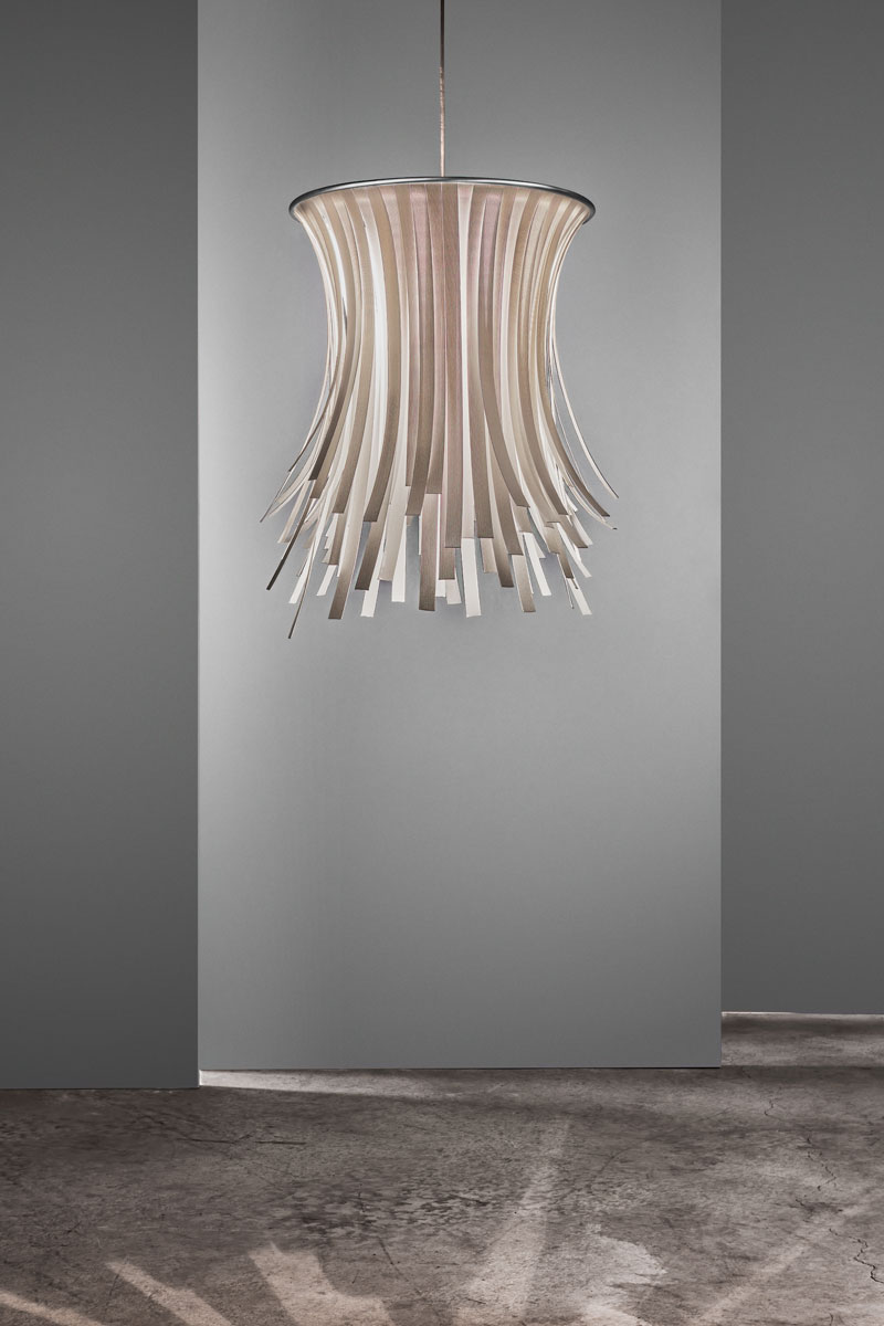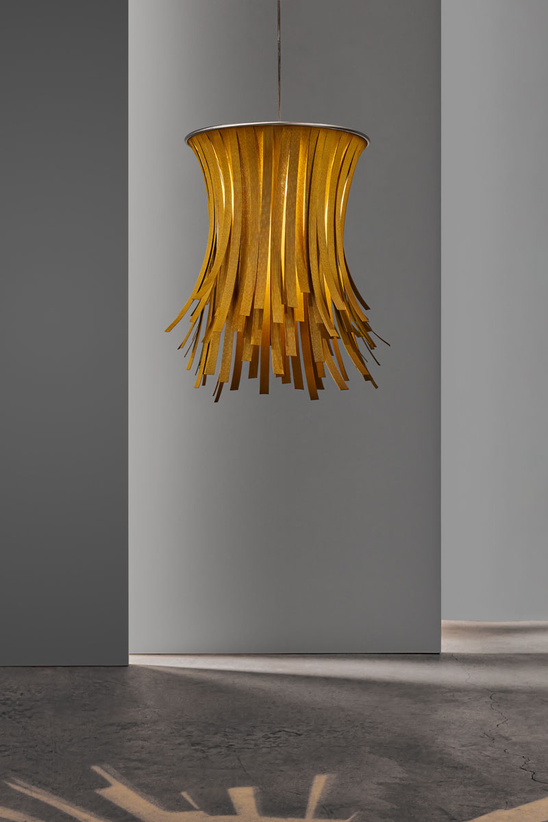 Главная особенность светильника — материал: плафон изготавливают из прессованной целлюлозы. Это натуральный и экологичный материал, который придаёт изделию особый облик. Каждое изделие делают вручную, поэтому все светильники немного отличаются друг от друга и выглядят как авторские предметы интерьера. При этом модель представлена в нескольких цветовых вариантах, что позволяет подобрать подходящий оттенок для разных стилей оформления.