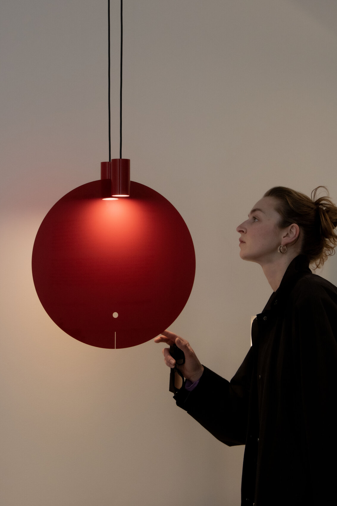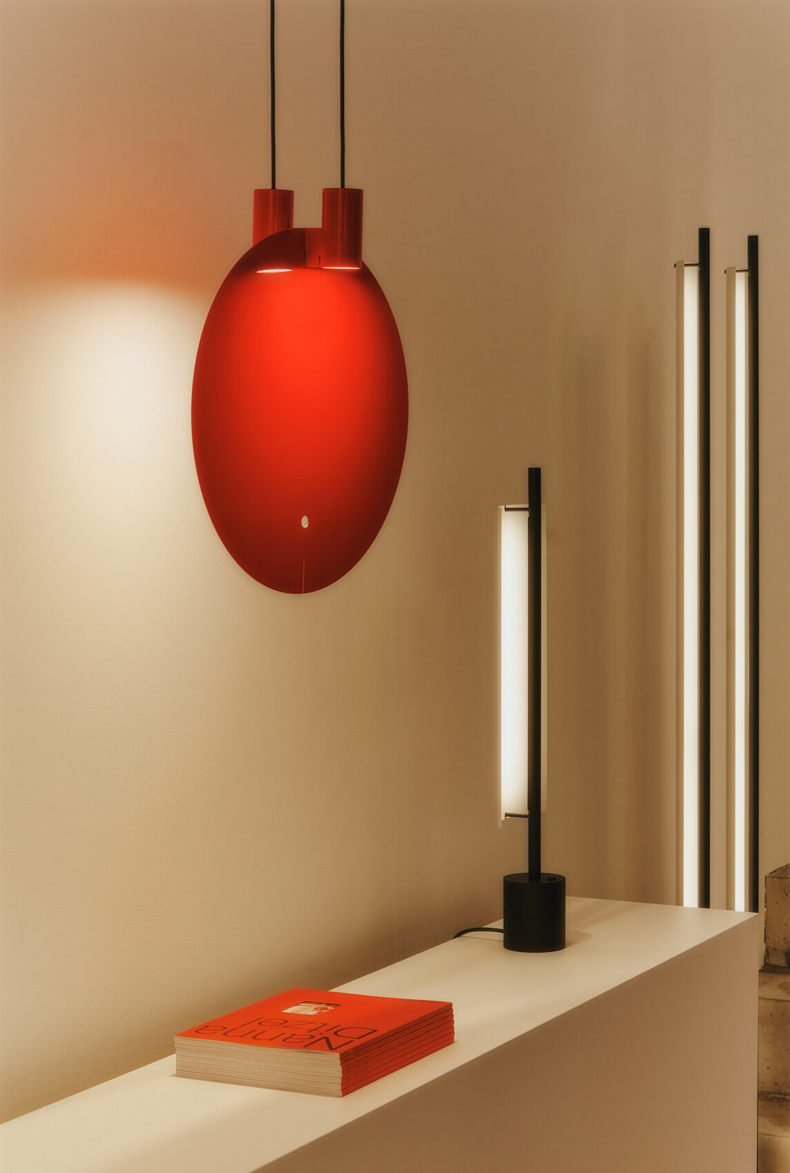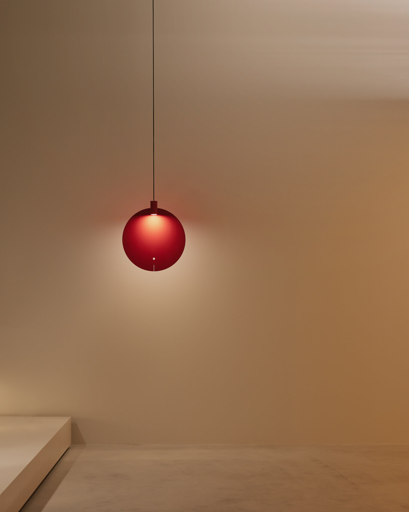Конструкция выполнена из металла с глянцевым покрытием. Доступны два цвета — кремово‑белый, который придаёт интерьеру лёгкость и сдержанную элегантность, и ярко‑красный, способный стать выразительным акцентом. Круглый белый навес не только скрывает блок питания, но и подчёркивает геометрическую чистоту общего силуэта.