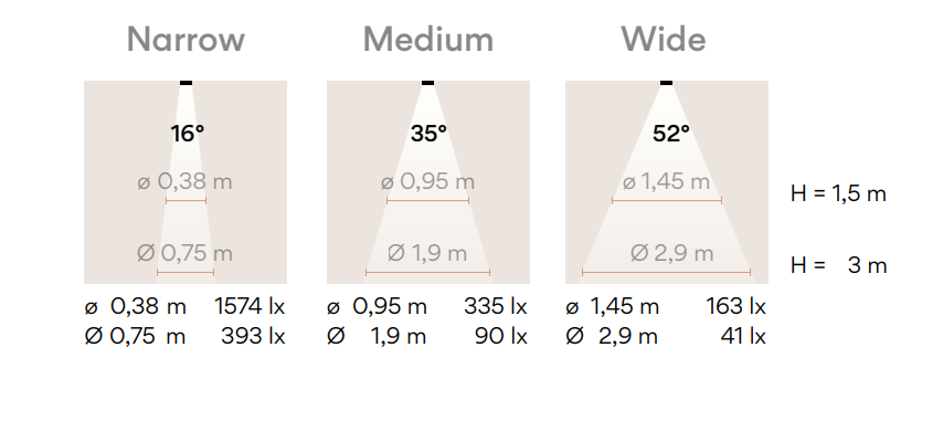 Narrow (узкий луч) – идеален для точечного акцентирования, например, произведений искусства, ниш или архитектурных деталей.