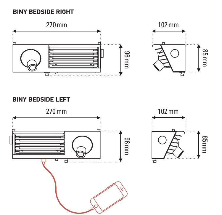 Настенный светильник Biny Bedside оснащён встроенным светодиодным сферическим поворотным прожектором. Это позволяет каждому из партнёров настроить освещение так, чтобы оно не мешало другому. С помощью боковой ручки легко управлять светодиодной кассетой с регулируемыми поворотными лопастями.