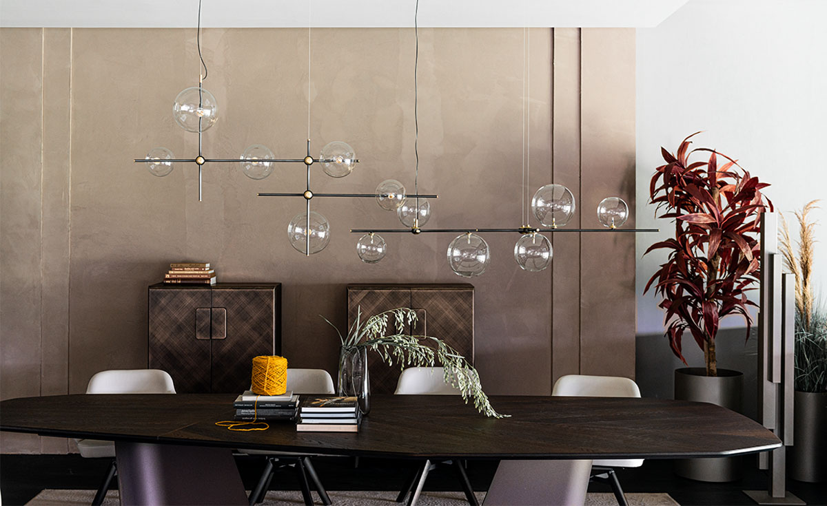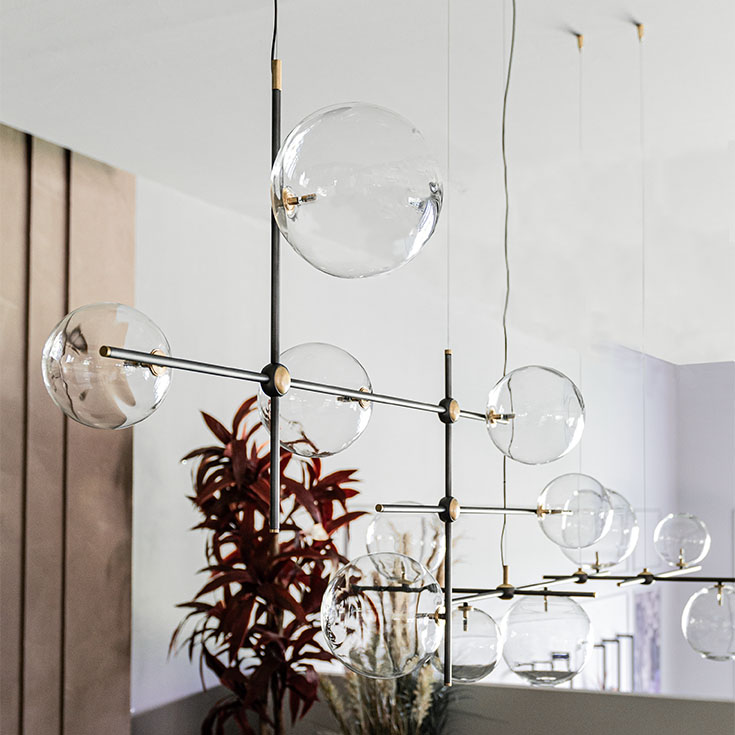 Светильник Biarritz представляет собой современную потолочную люстру, вдохновлённую композиционными принципами метафизического авангарда. Плафоны различных размеров и оттенков, подобно спутникам, обрамляют стальной контур с интегрированной светодиодной подсветкой, формируя сложную визуальную динамику.