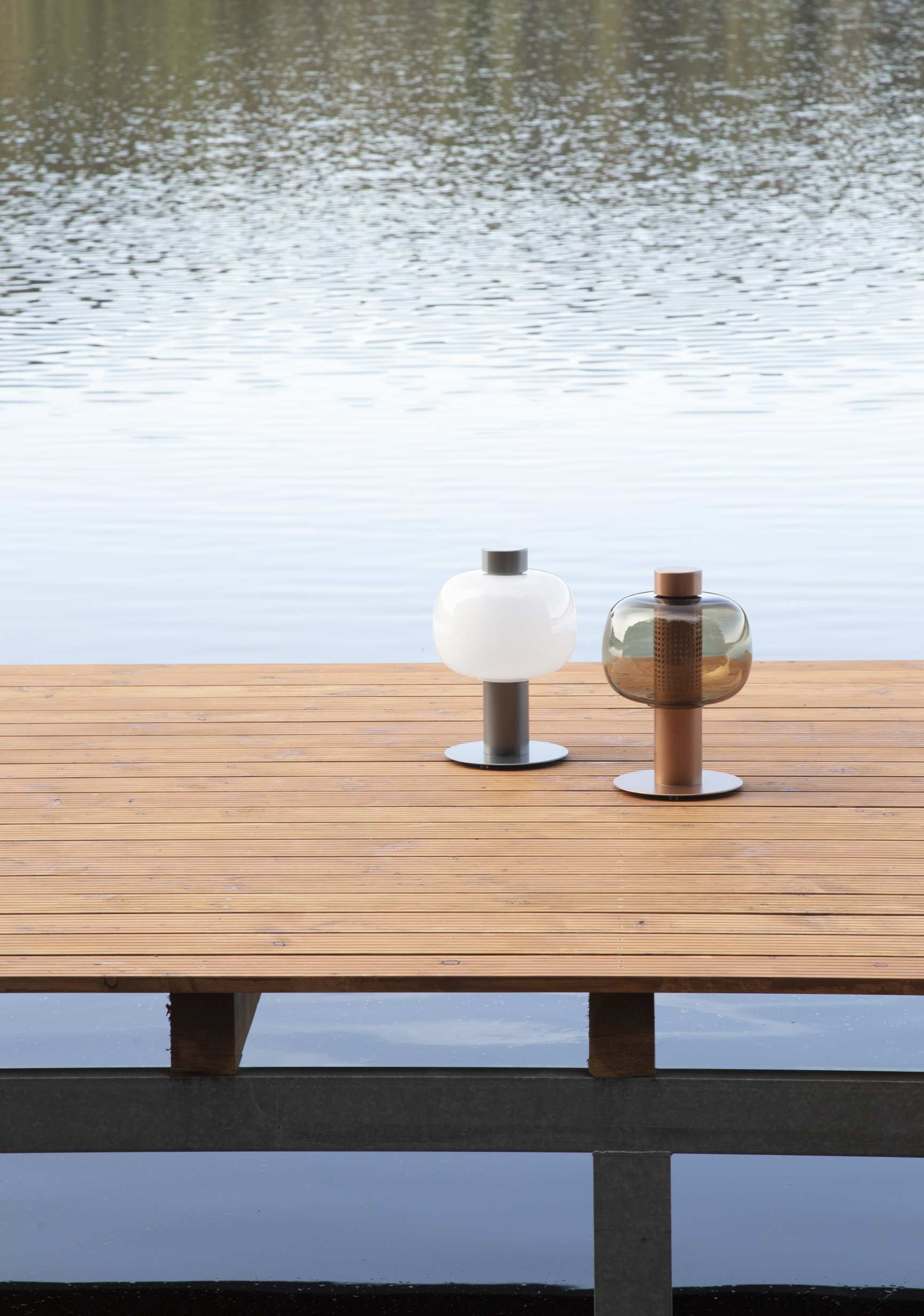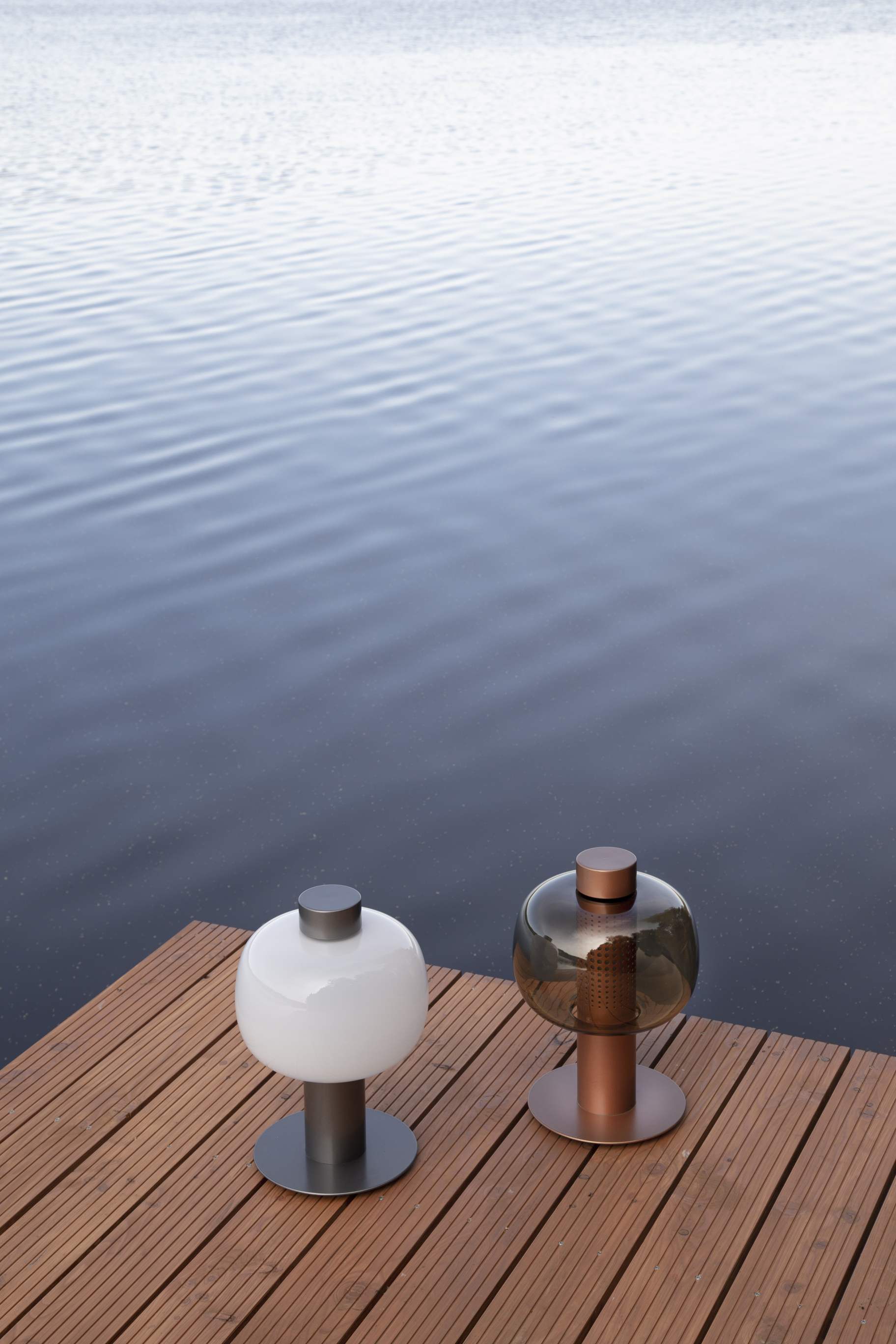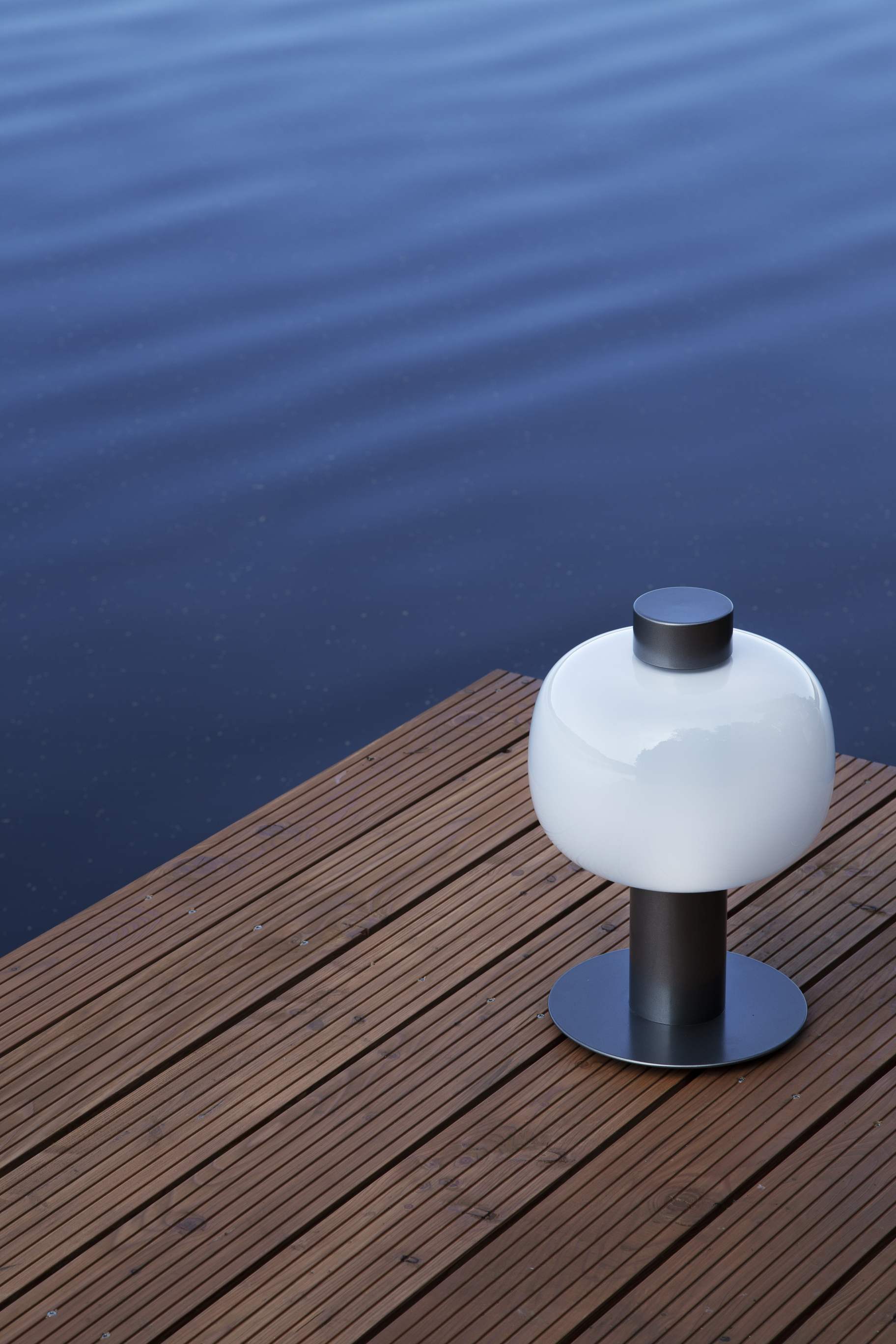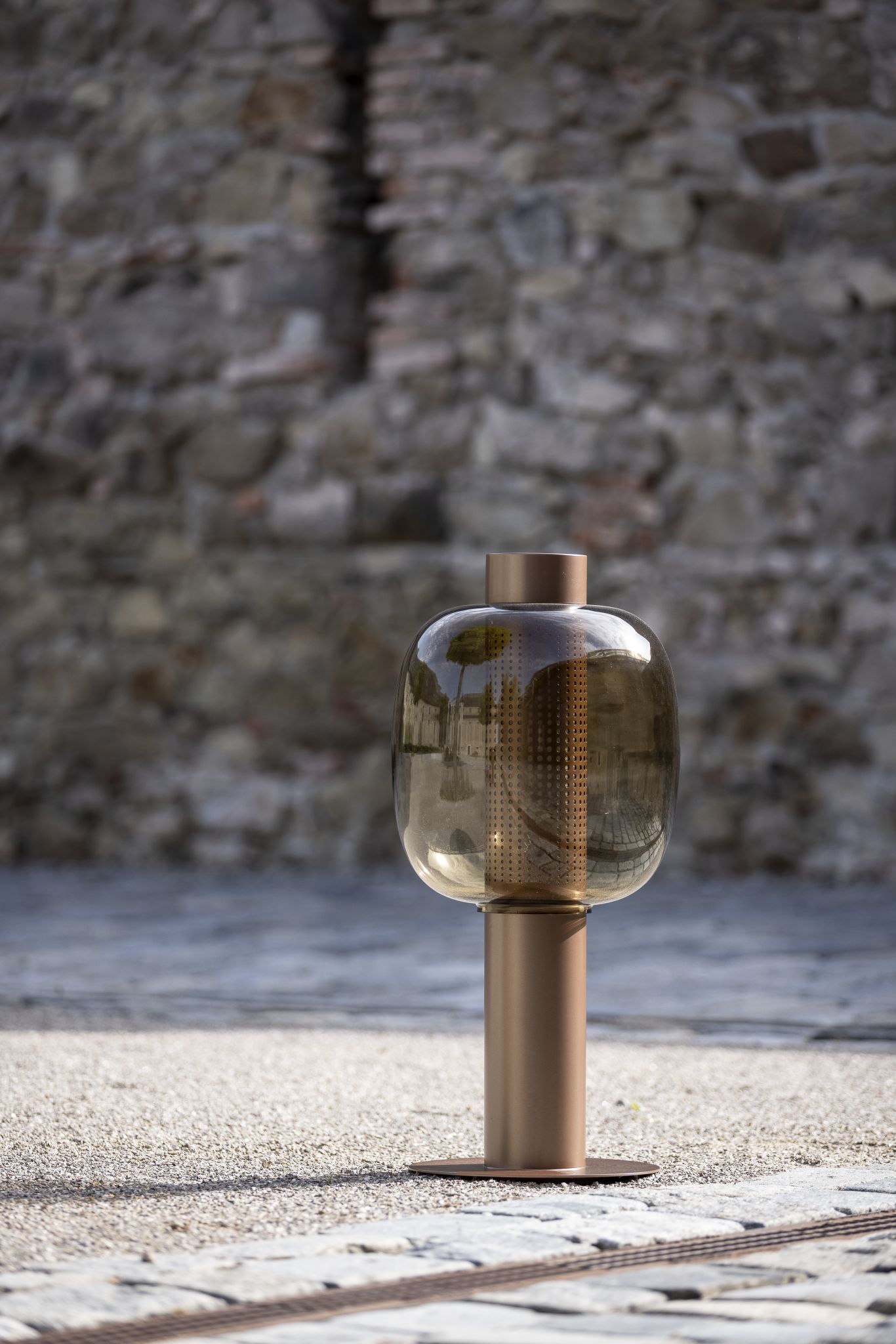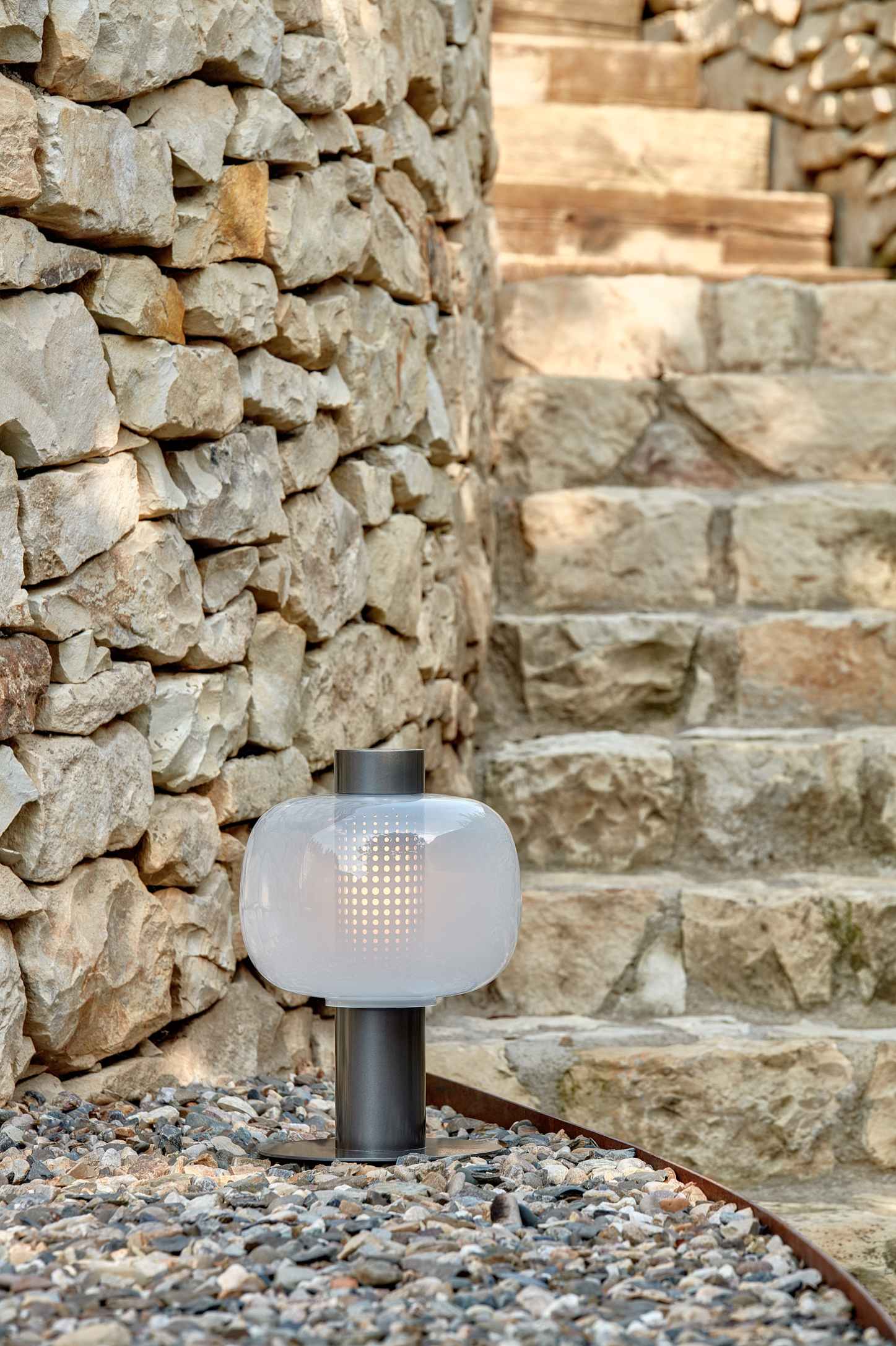 Светильники Bonbori Outdoor floor представлены в двух размерах. Они состоят из металлического корпуса, прочного основания, стеклянного плафона и рассеивателя.