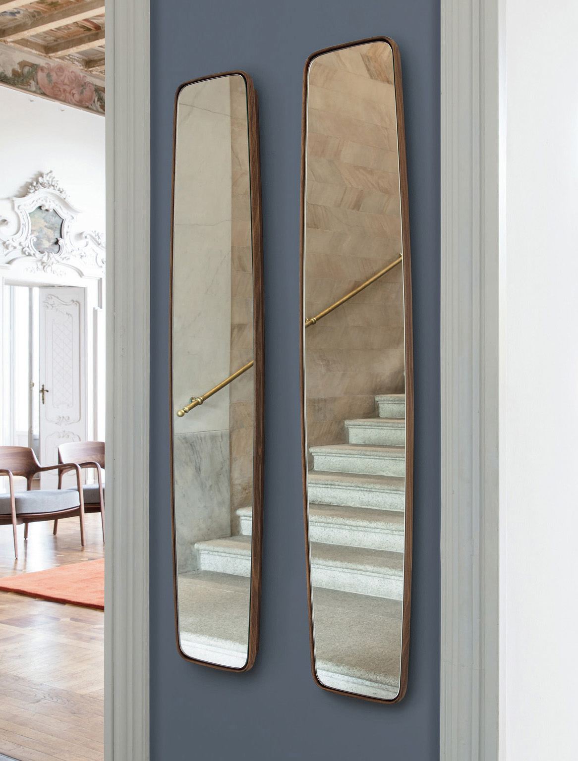 Три варианта отделки позволяют выбрать зеркало, соответствующее любому стилю интерьера: натуральное дерево, благородная тонировка в оттенках Moka и Wengé или лакированная поверхность в палитре коллекции. Такое разнообразие вариантов делает зеркала универсальными и позволяет легко интегрировать их в любой дизайнерский замысел.