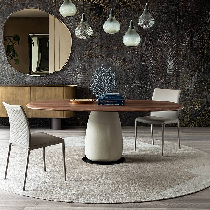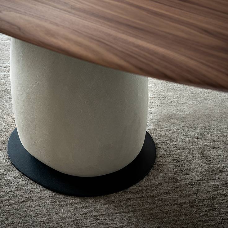 Поверхность основания покрыта тоном материалом, имитирующим глину, — что создаёт ручную, фактурную текстуру с игрой света и тени. Этот эффект подчёркивает высокое ремесленное качество и делает каждый экземпляр уникальным. Botero Wood оснащён столешницей из натурального дерева — массива или шпона ценных пород. Тёплая текстура древесины контрастирует с мощным основанием, создавая баланс между лёгкостью поверхности и монументальностью базы.