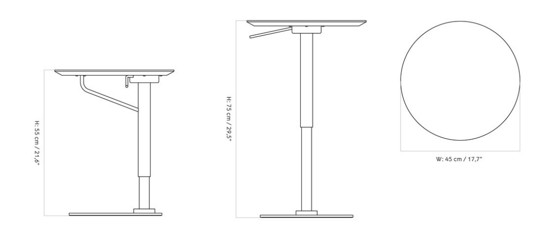 Его размеры идеально сбалансированы. Высота составляет 75 см. Ширина и глубина – по 45 см. Диаметр столешницы – 45 см.