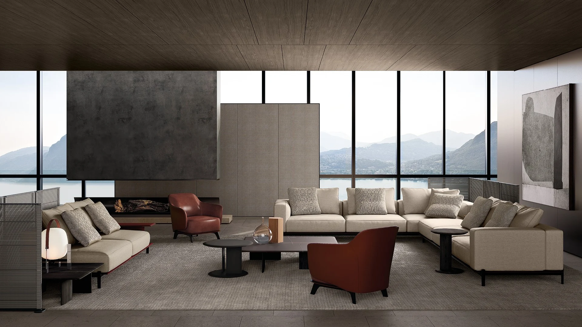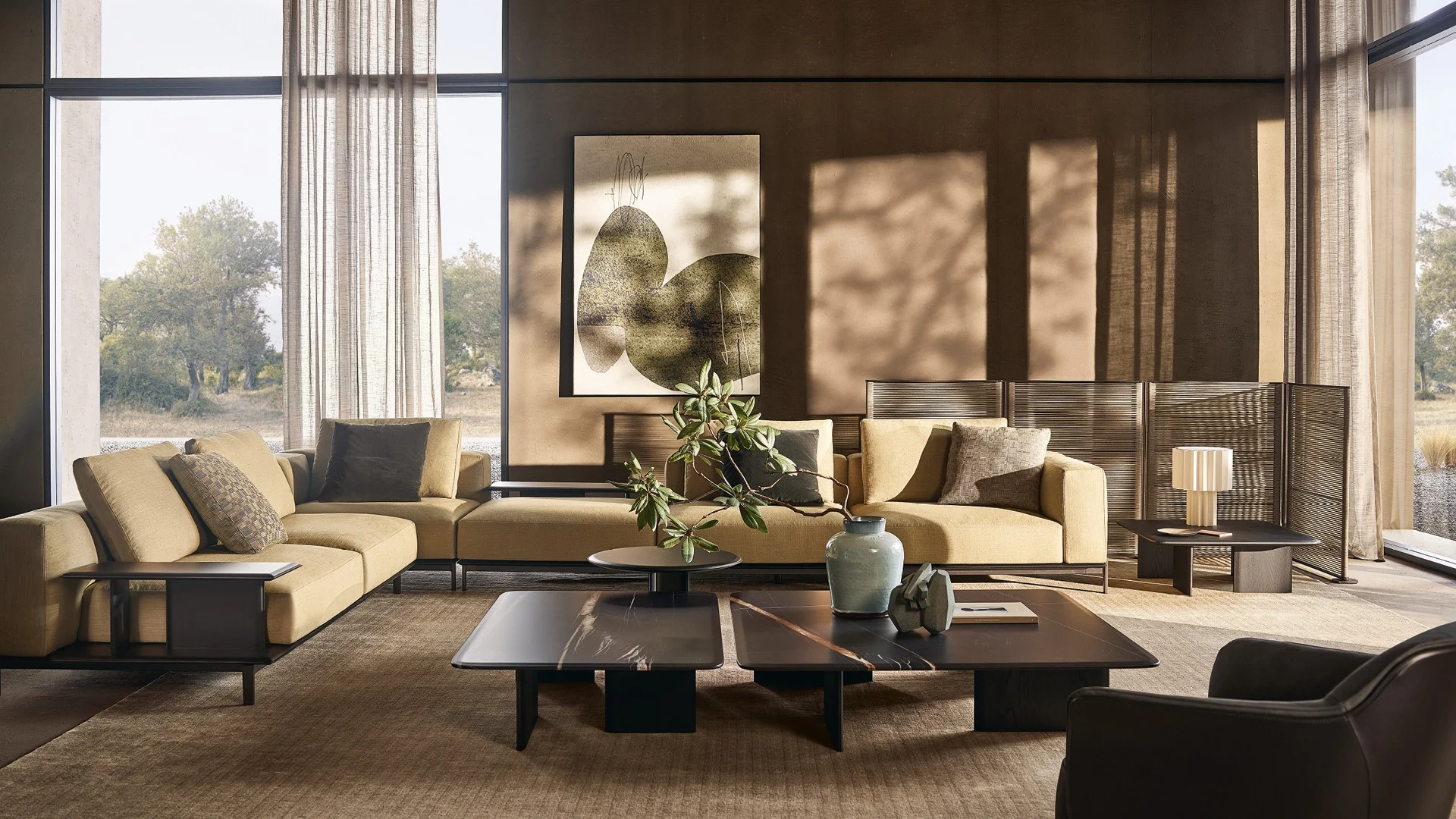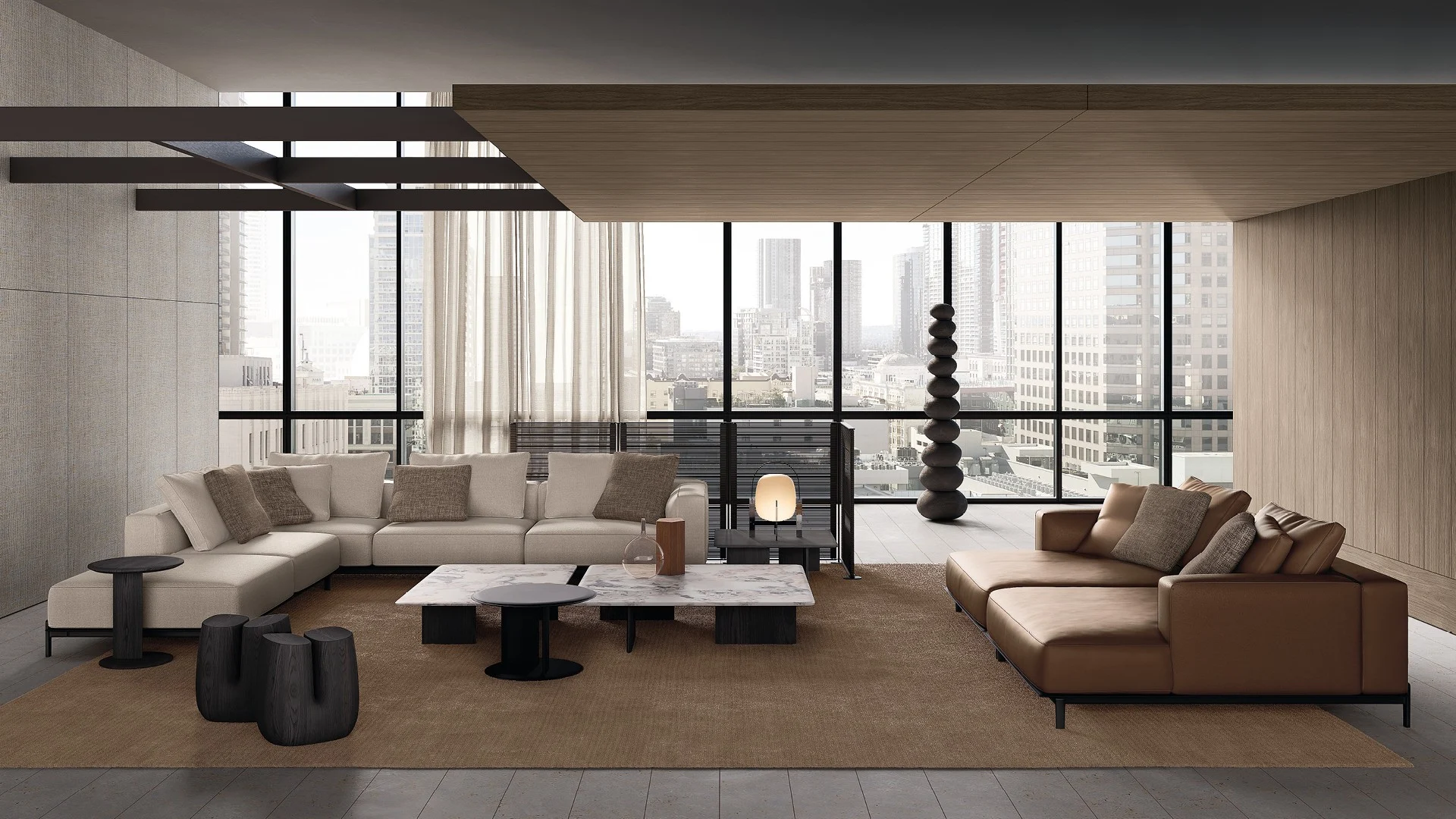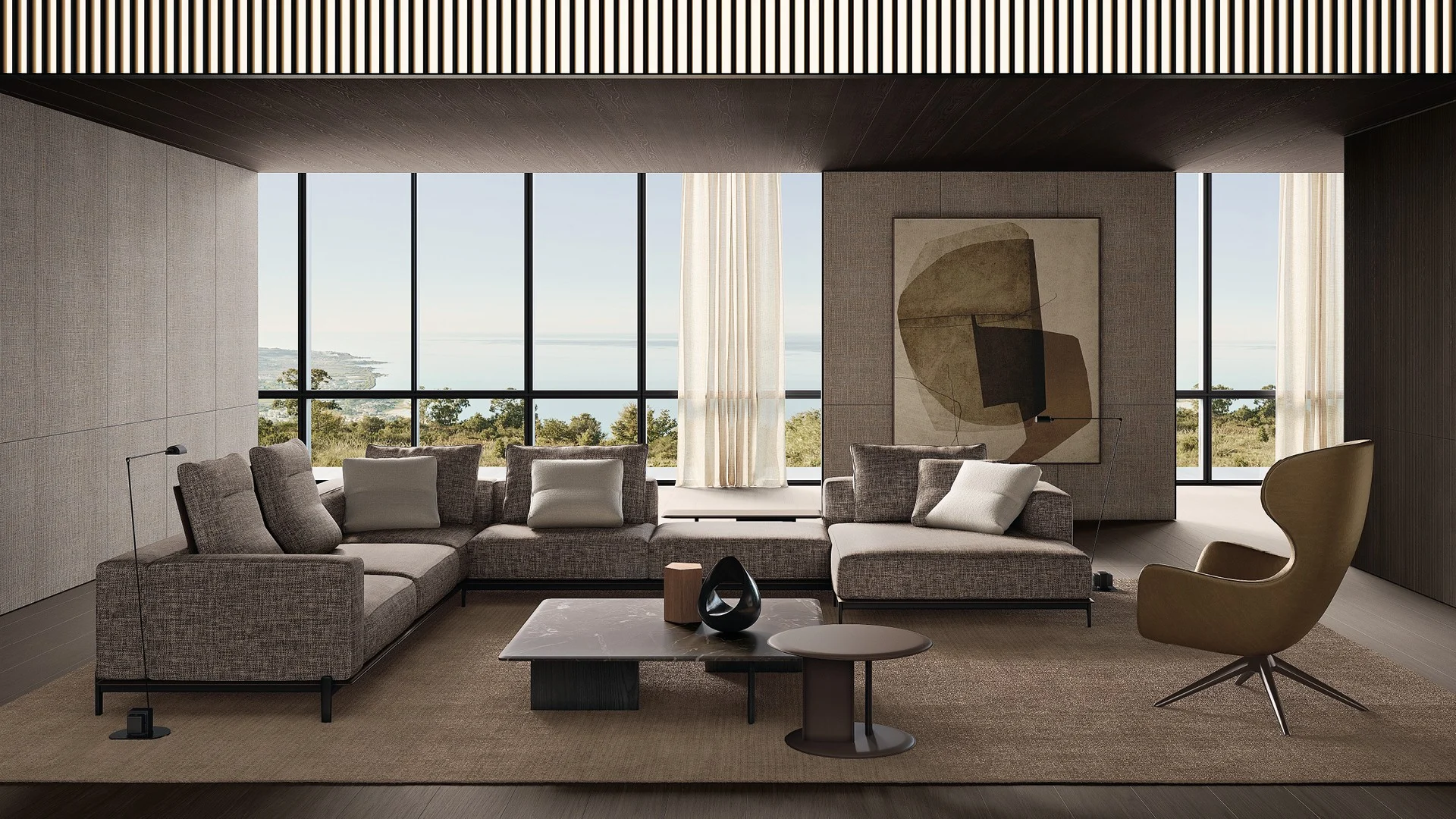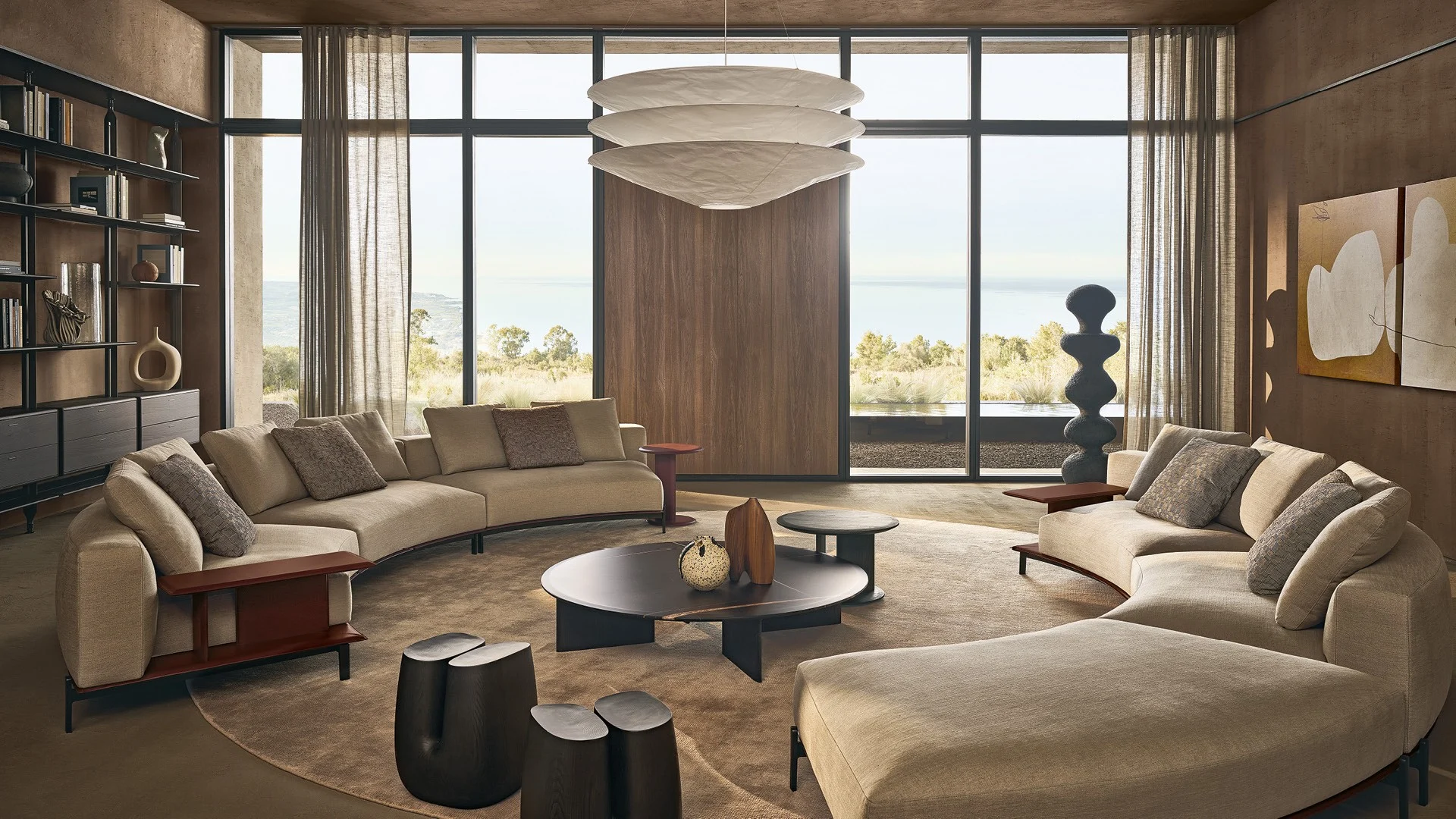 Жан-Мари Массо воплотил в этом интерьере глубокий диалог между мебельным дизайном и архитектурной пластикой. Система диванов Brera выступает здесь не просто как функциональный элемент, а как скульптурный компонент пространства, где каждая линия ведет осмысленный разговор с окружающей средой. Архитектоничность форм проявляется в идеально выверенных горизонталях, которые создают визуальный ритм, одновременно статичный и динамичный.