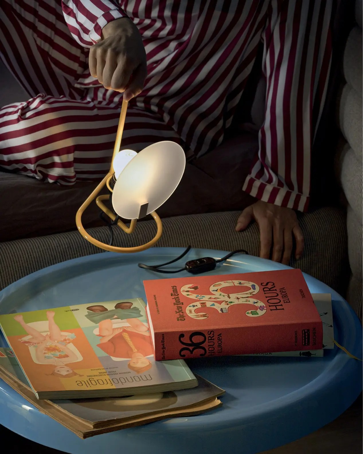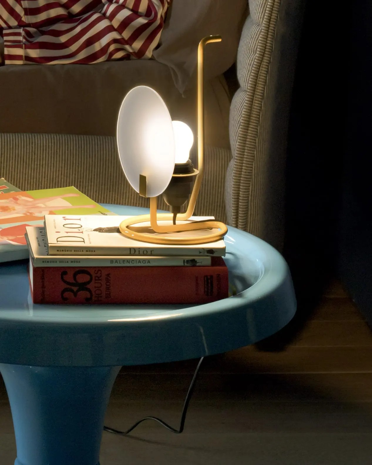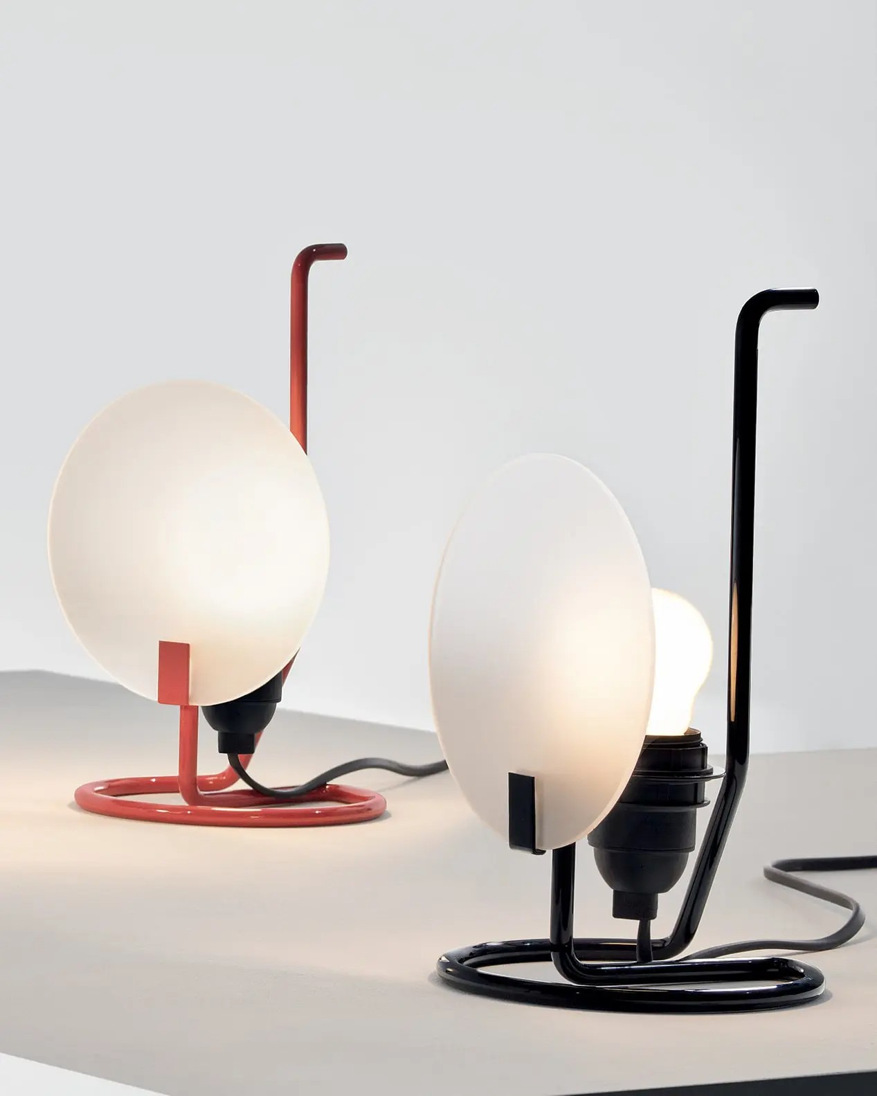 Настольная лампа Bugia Table, созданная в 1977 году дизайнерами Роберто Береттой и Антонио Макки Кассией, соединяет в себе простоту и глубокий смысл. Её форма напоминает традиционный подсвечник с ручкой — предмет, связанный с домашними ритуалами.