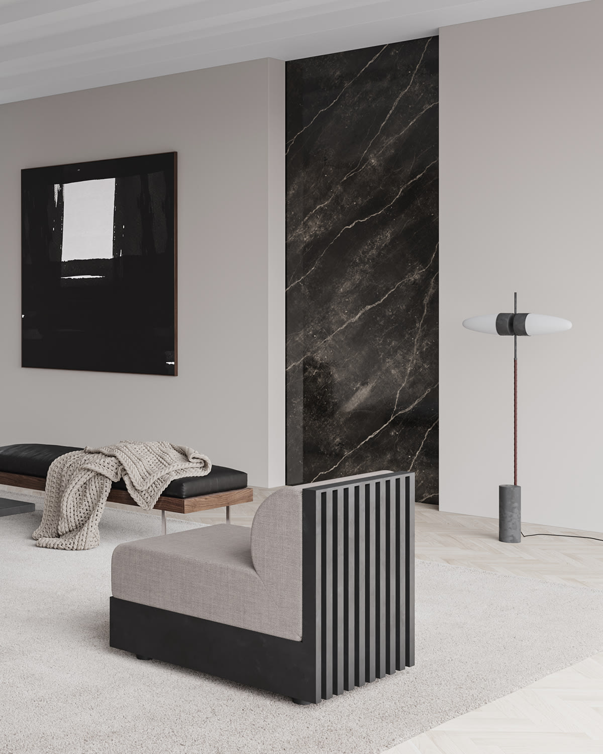 Основание выполнено из натурального мрамора с грубоватой фактурой. Природные прожилки камня словно связывают светильник с землей. Это придает ему ощущение фундаментальности и устойчивости.