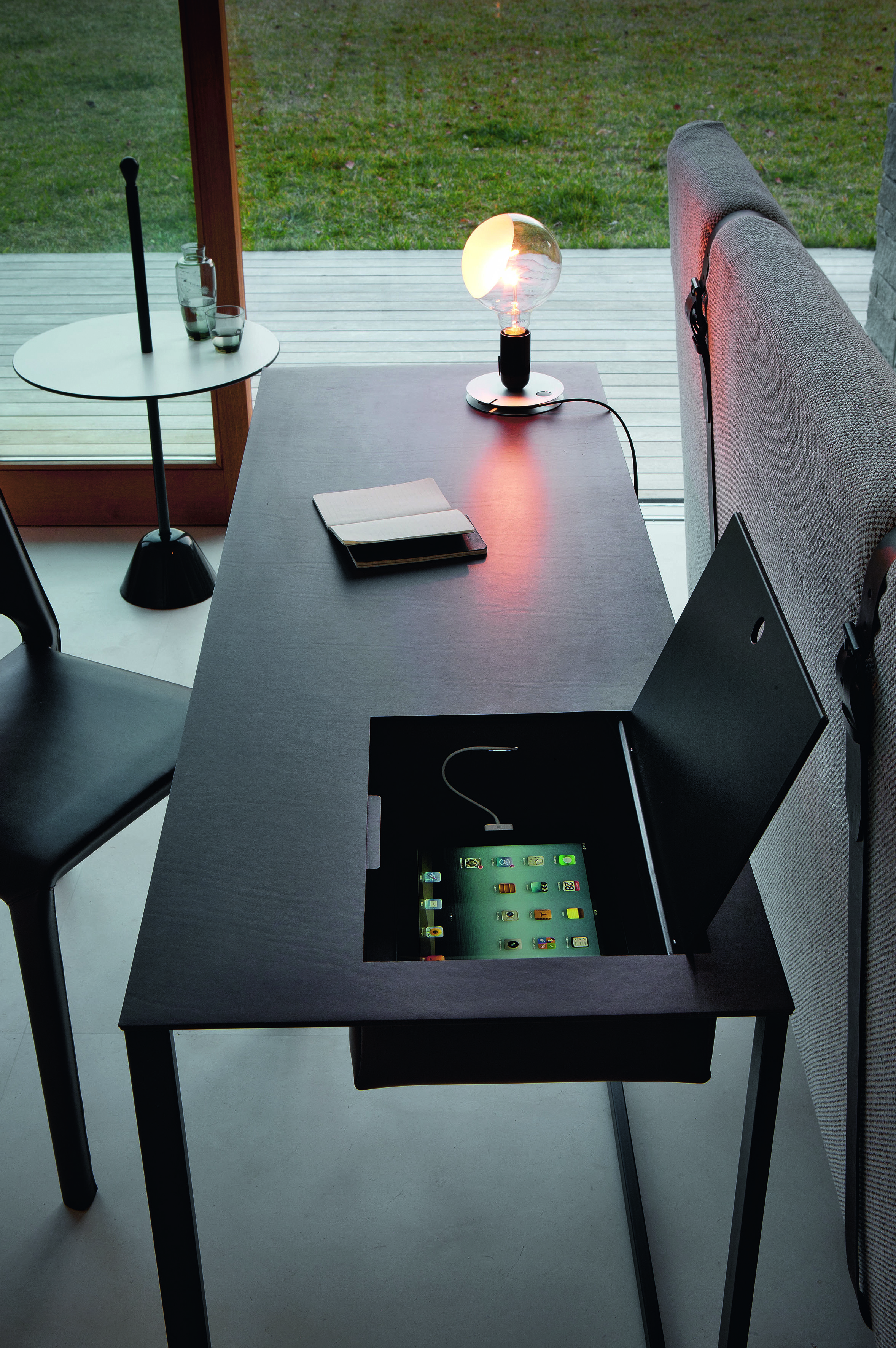 Каркас письменного стола Calamo изготовлен из прочной стали. На топе расположен ящик с откидной крышкой. Топ и ящик отделаны окрашенной кожей. Стол Calamo станет изюминкой вашего рабочего пространства. Подробнее уточняйте у менеджеров или в PDF инструкции.