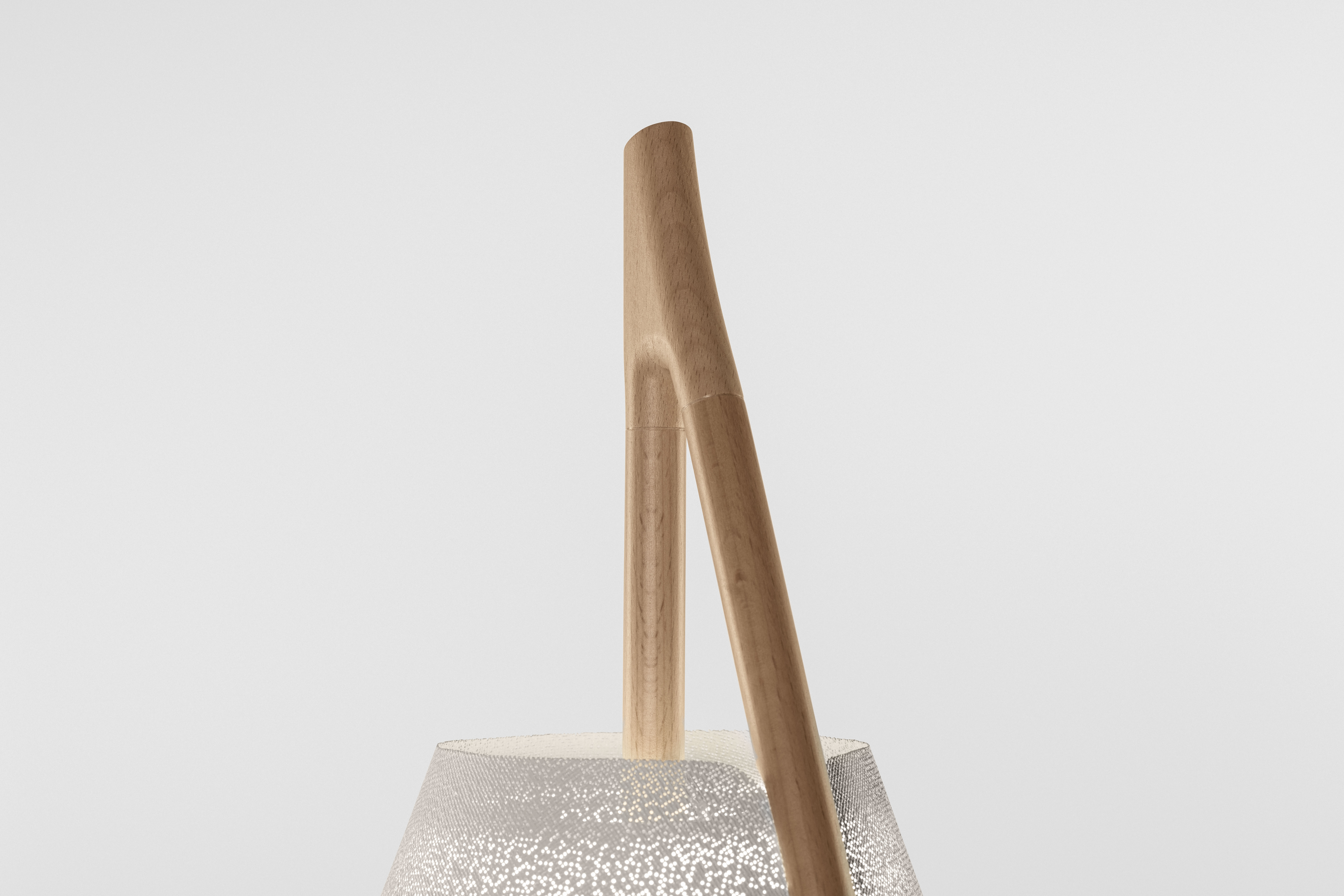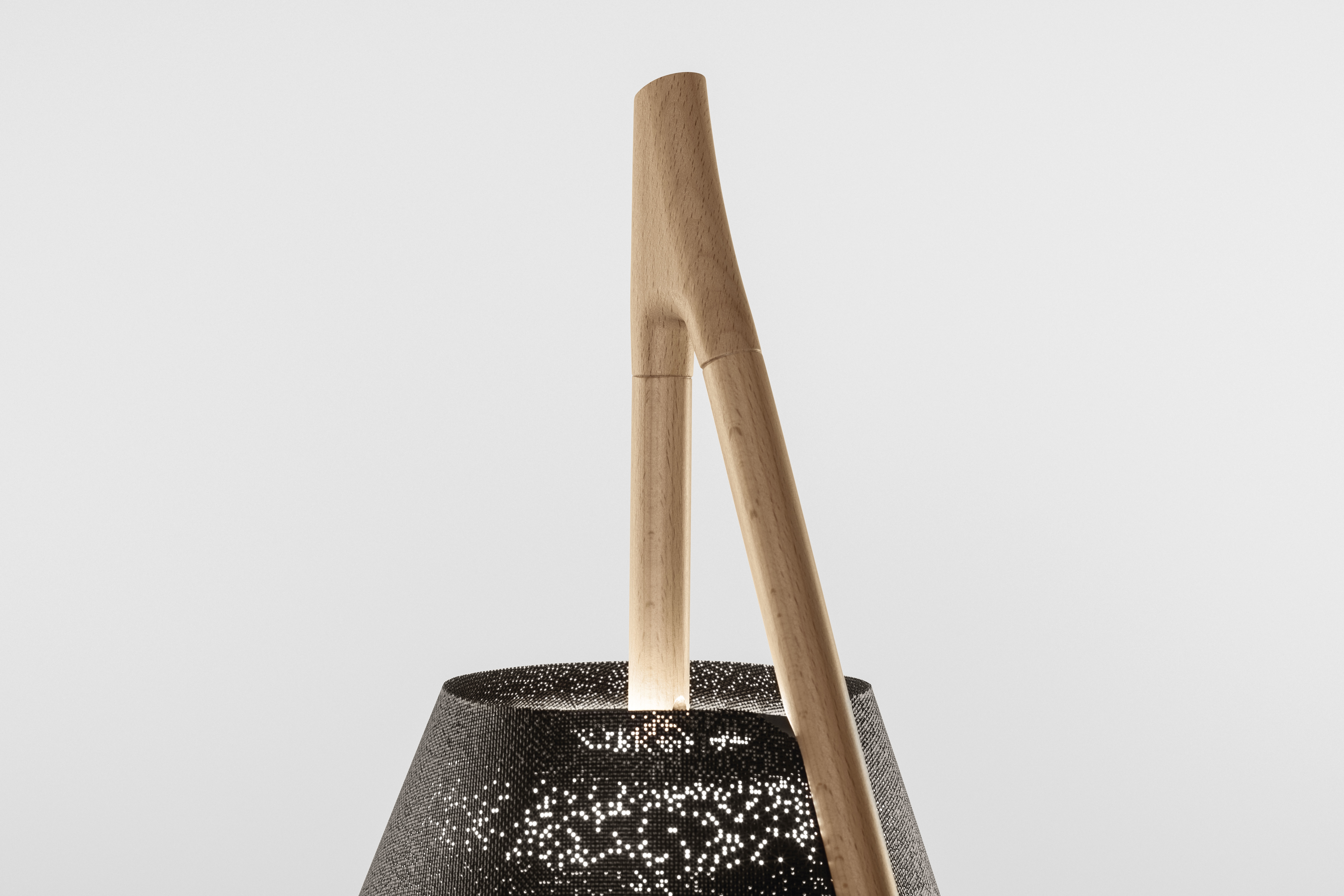 Для изготовления лампы выбрали древесину бука. Её покрыли водным лаком, чтобы сохранить естественный вид материала. Особенность конструкции — в тюльпане лампы размещена окрашенная сетка из нержавеющей стали. Она держит встроенный светодиодный источник света.