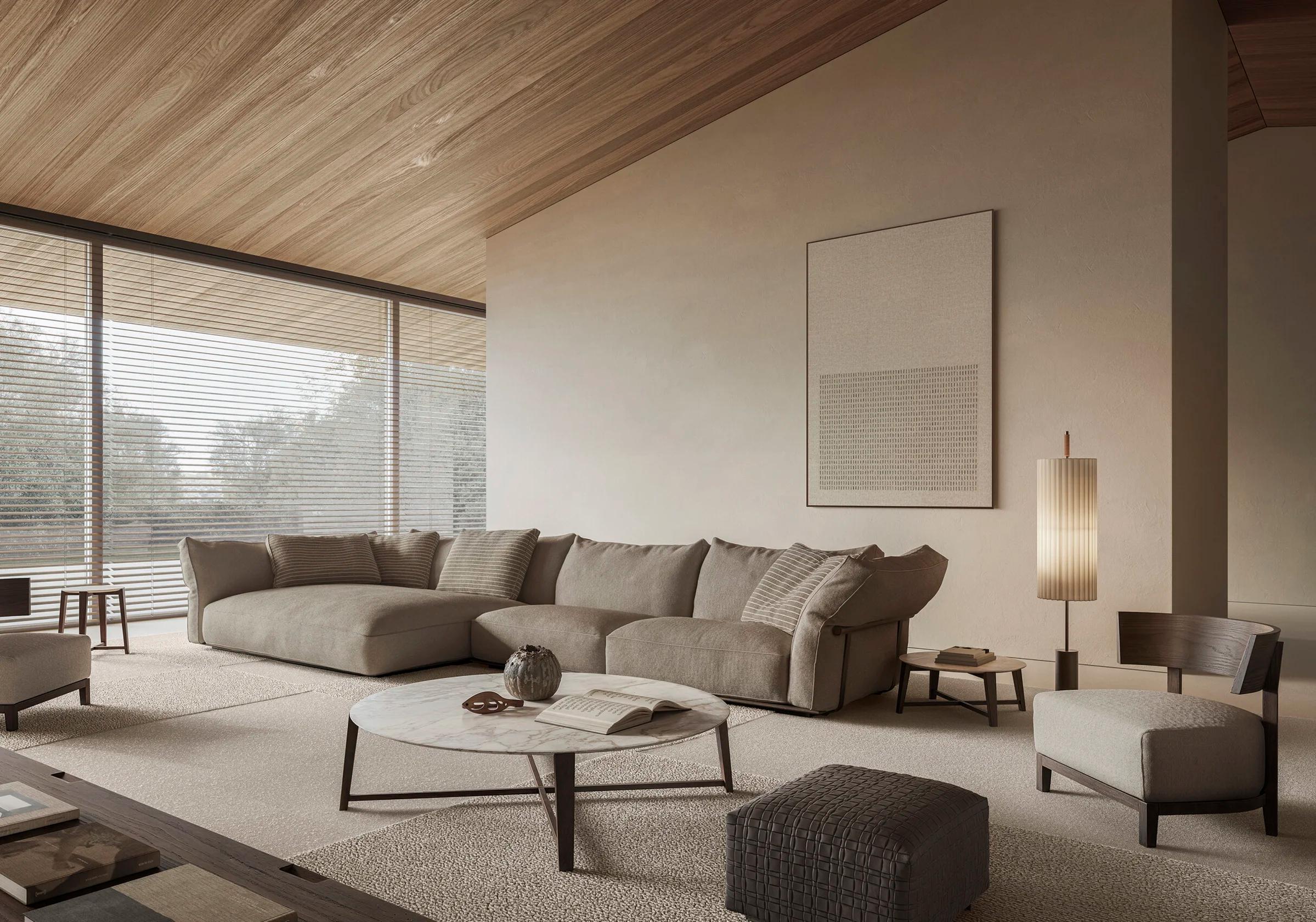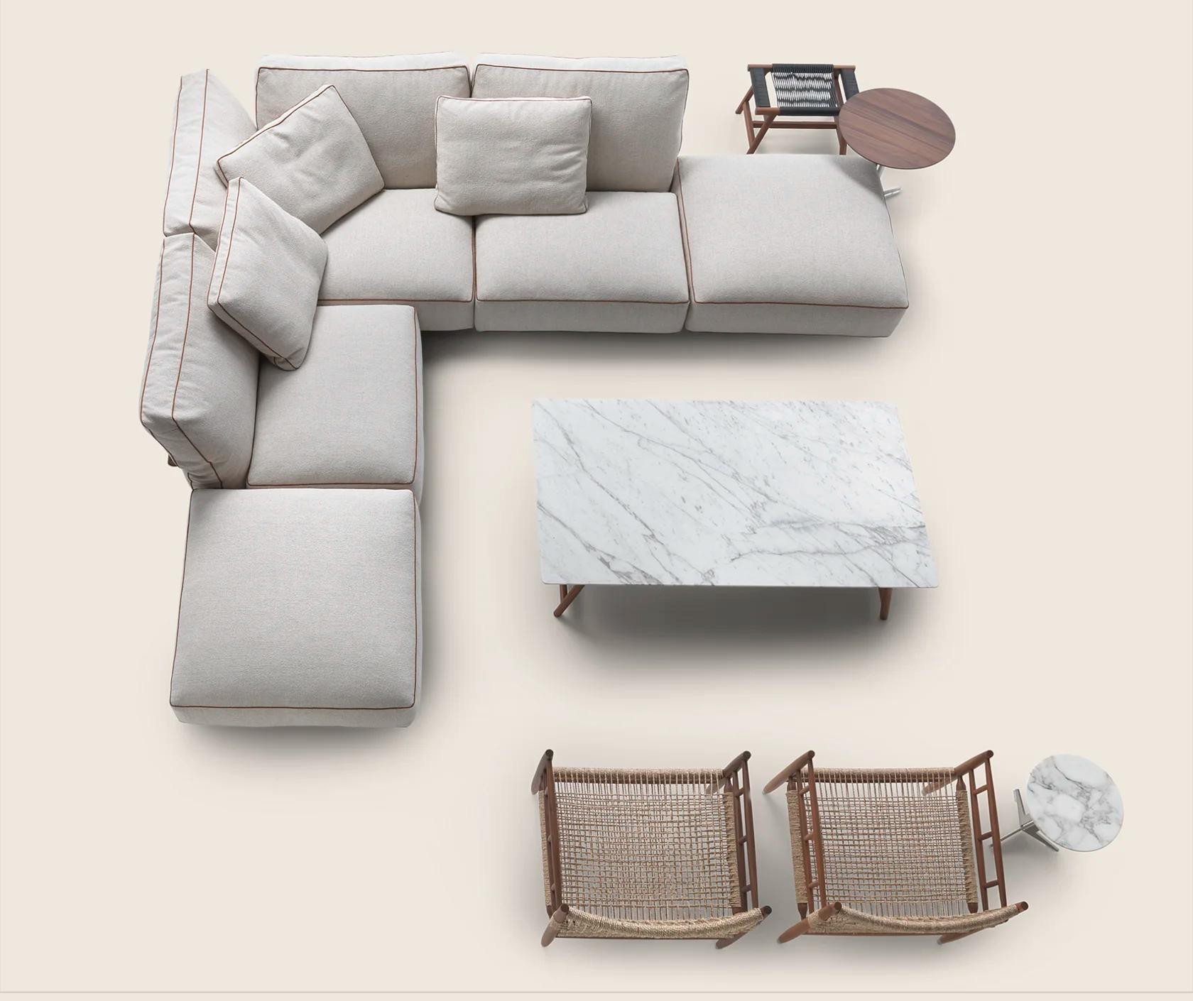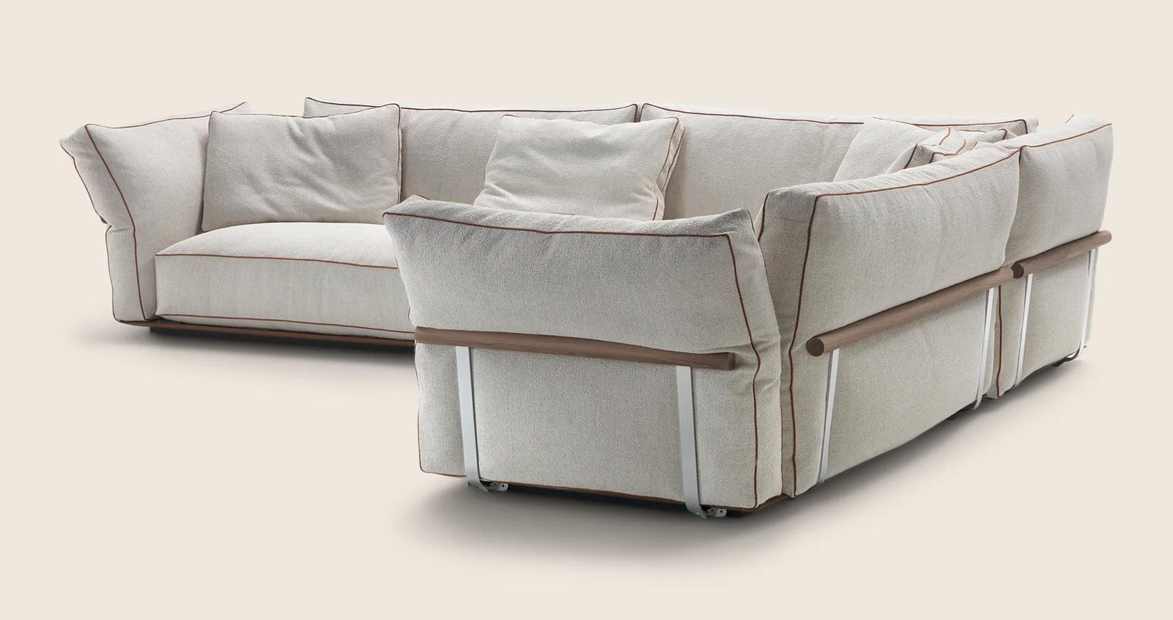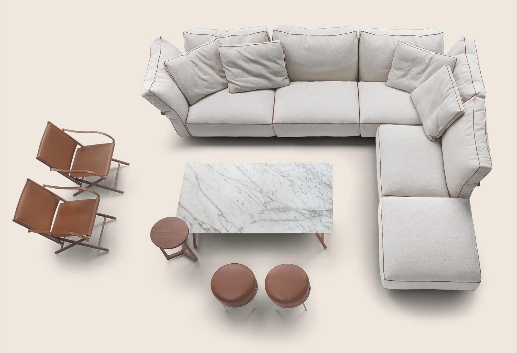 Подушки спинки большие и мягкие, наполнены гусиным пухом. Это создает идеальные условия для отдыха. Отделочные детали подчеркивают внимание Flexform к ручной работе. Они отражают высокие стандарты качества.