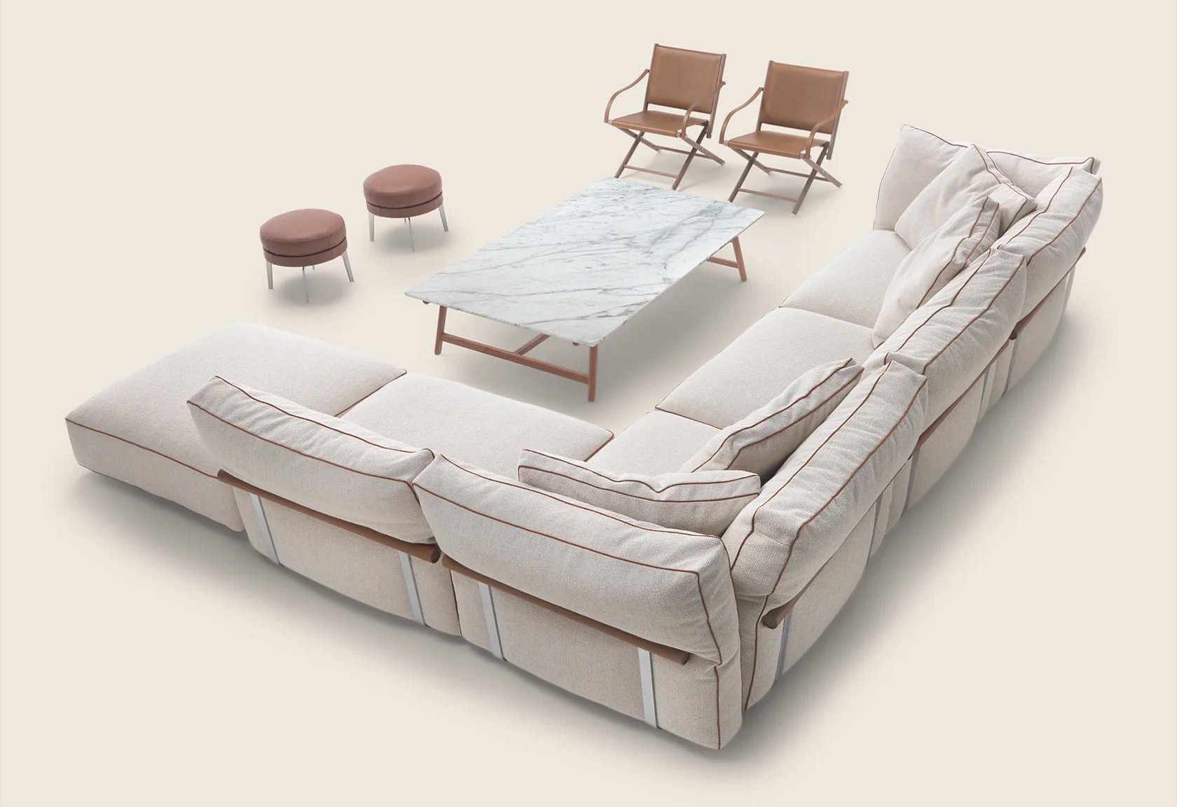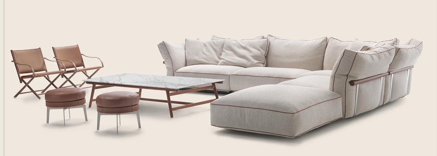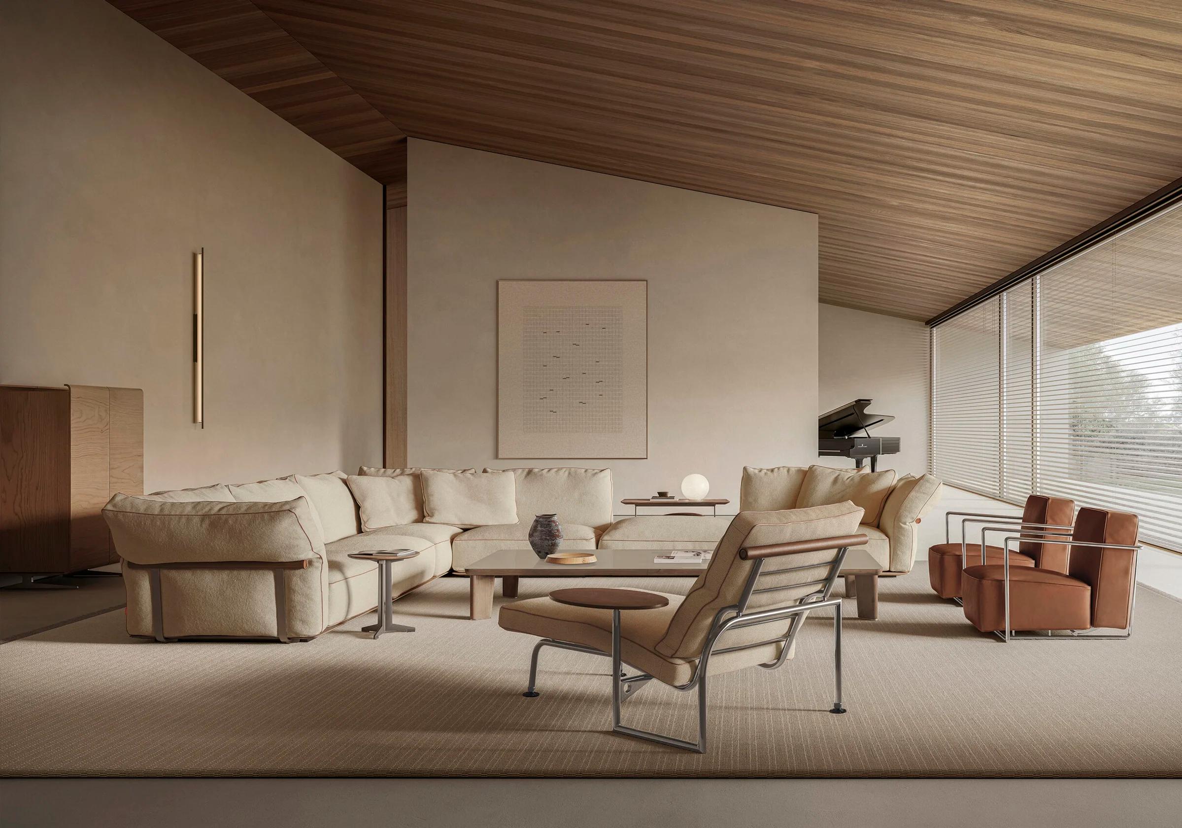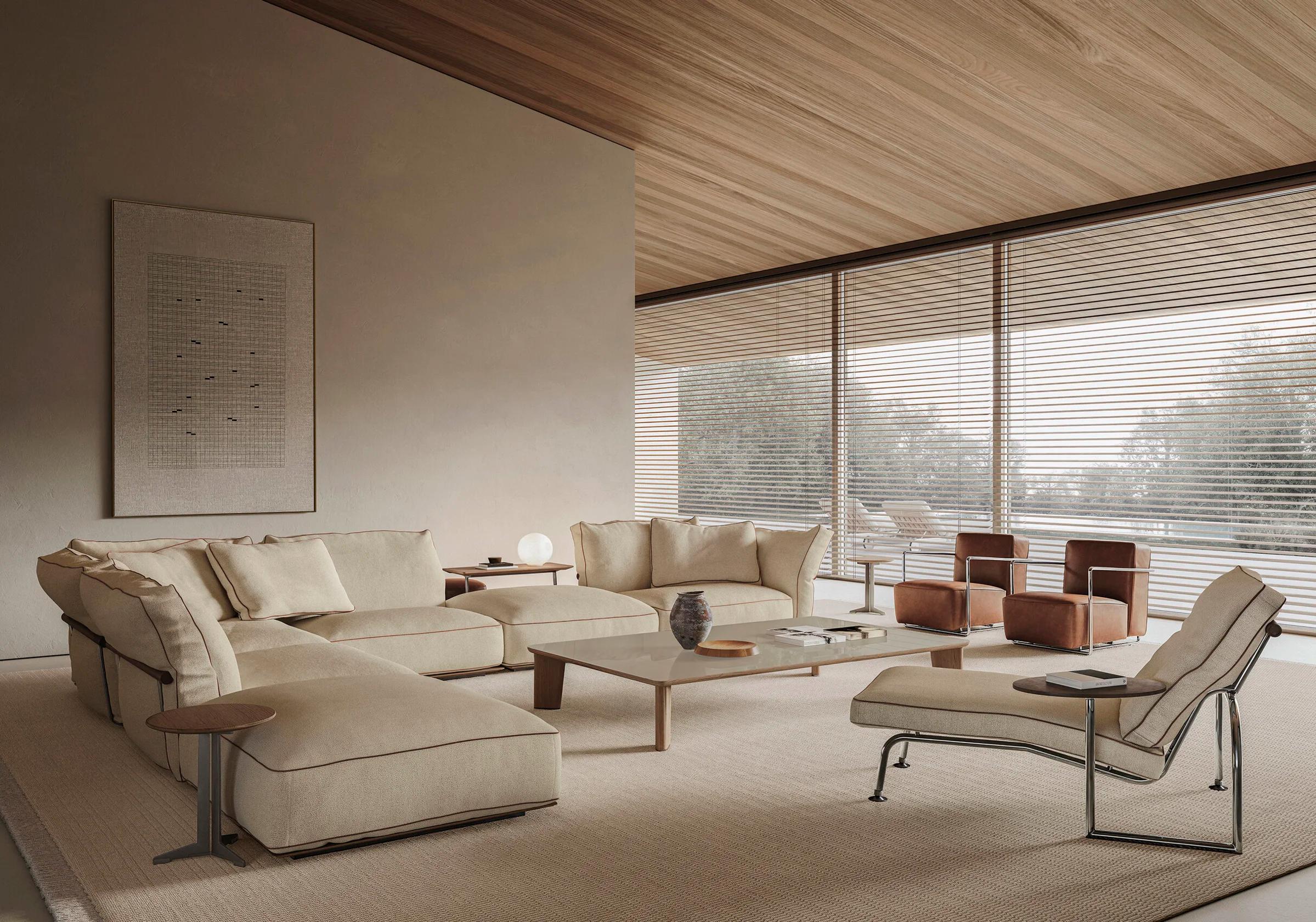 Подушки спинки большие и мягкие, наполнены гусиным пухом. Это создает идеальные условия для отдыха. Отделочные детали подчеркивают внимание Flexform к ручной работе. Они отражают высокие стандарты качества.