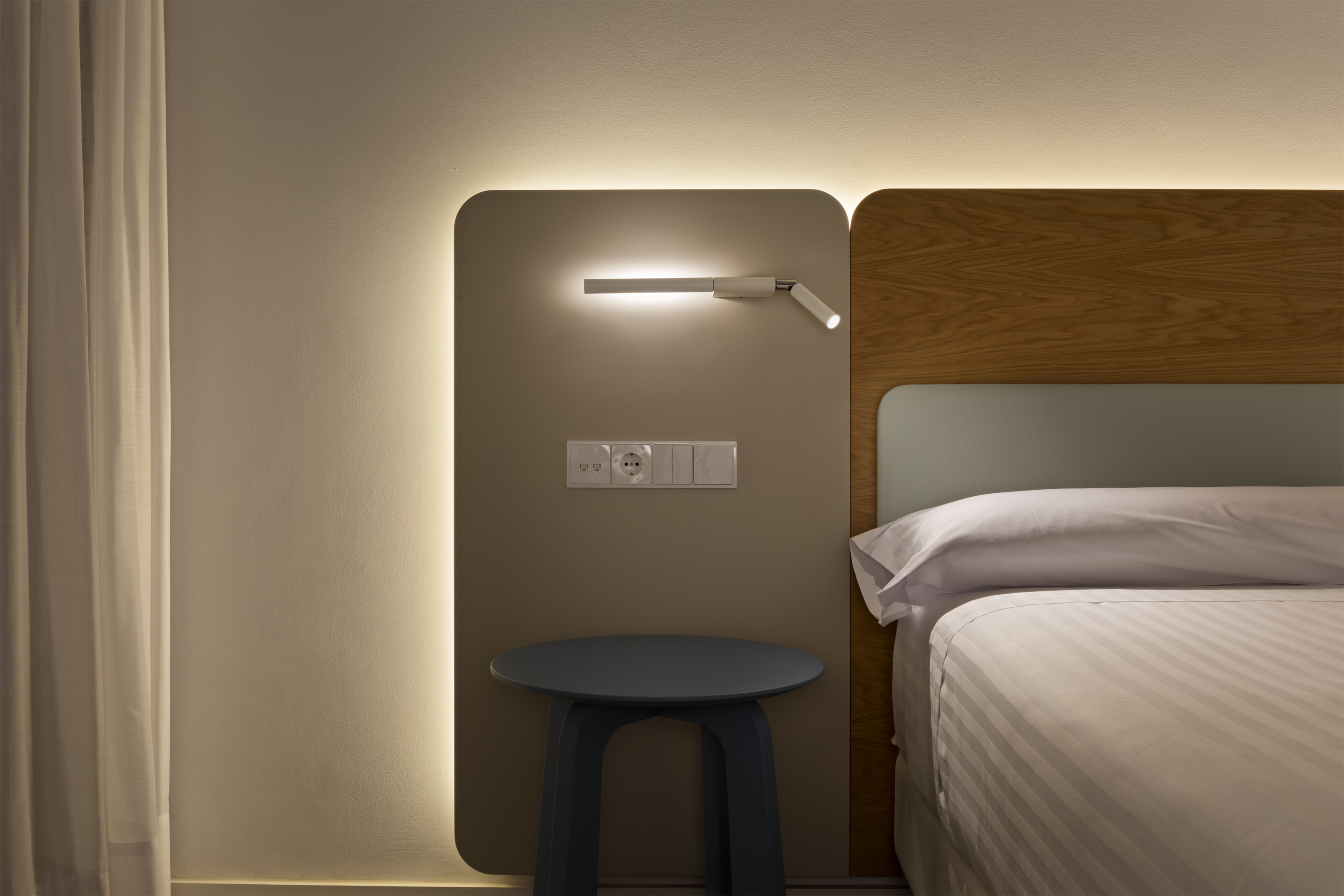 Светильник имеет собственный выключатель, что позволяет легко регулировать освещение независимо от основного источника света. С помощью настенного выключателя можно регулировать непрямое освещение, настраивая его интенсивность и направление. Обе части светильника работают от отдельных электрических цепей, что облегчает их подключение к одному выключателю при установке.