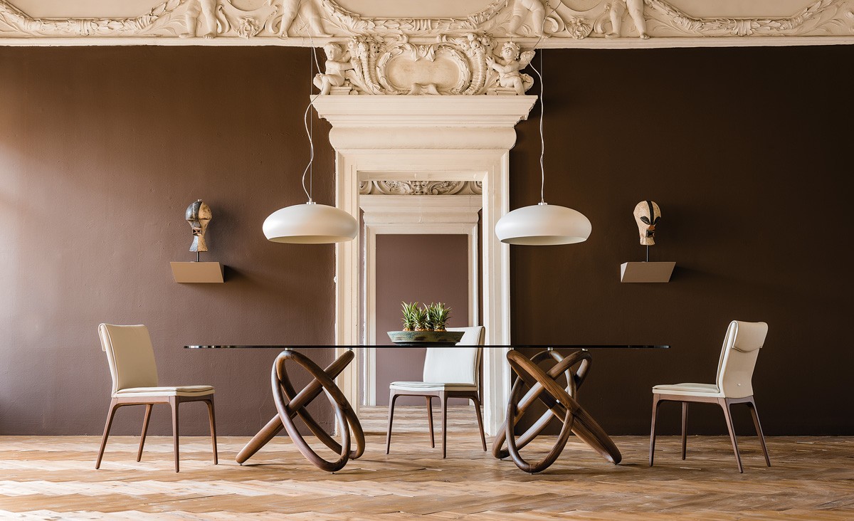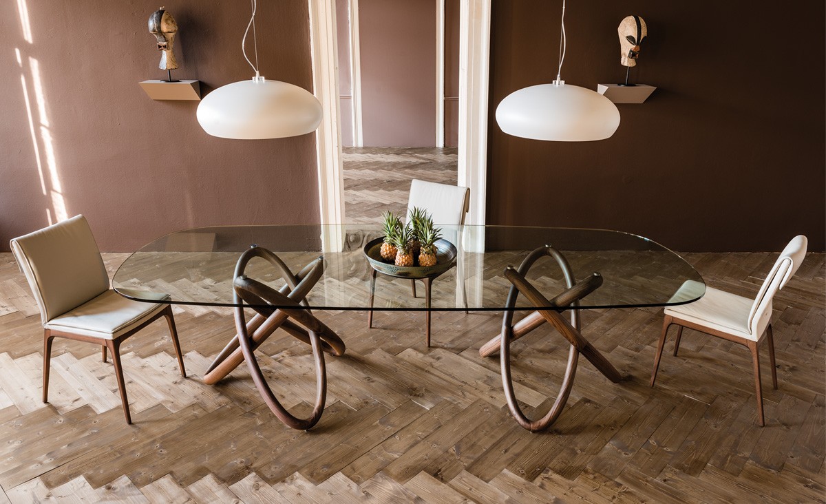 Стол Carioca — очень необычное изделие на стыке стилей, которое комбинирует в себе красивые витые ножки из массива североамериканского ореха Каналетто и столешницу овальной формы. В качестве столешницы выступает прозрачное и ударопрочное стекло, лист которого профилируется и в овальном виде устанавливается на ножки с помощью специальных металлических креплений. Доступны разные варианты форм столешницы.