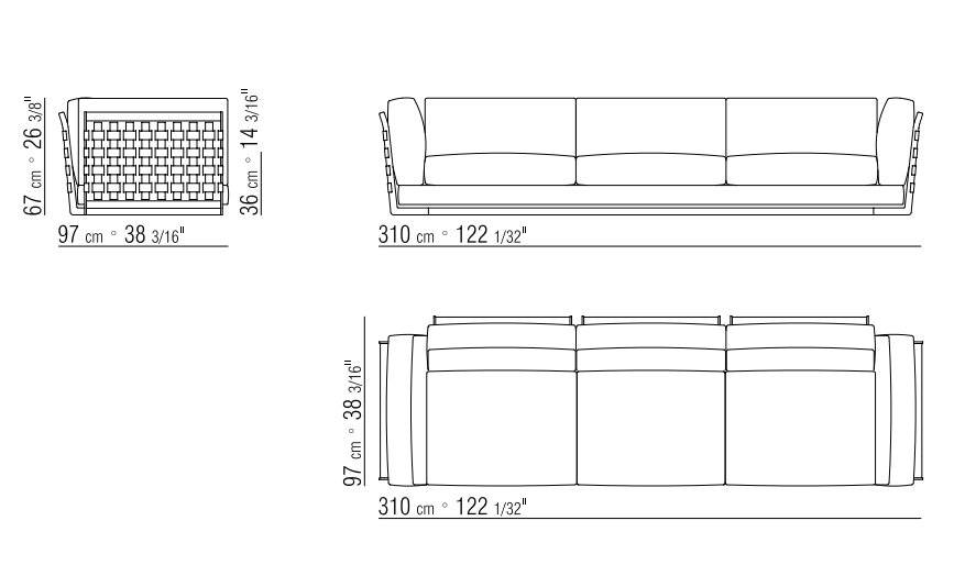 Плетение бывает двух типов: плотное, образующее сплошное покрытие, и более редкое, позволяющее ткани обивки просвечивать. В обоих случаях шахматный узор придаёт дивану уникальный и запоминающийся вид. Контраст света и тени усиливает эстетическое впечатление, делая модель выразительной. Плавные линии и идеальные пропорции мягких частей гармонично сочетаются с металлическим каркасом, создавая ощущение баланса и утончённости.