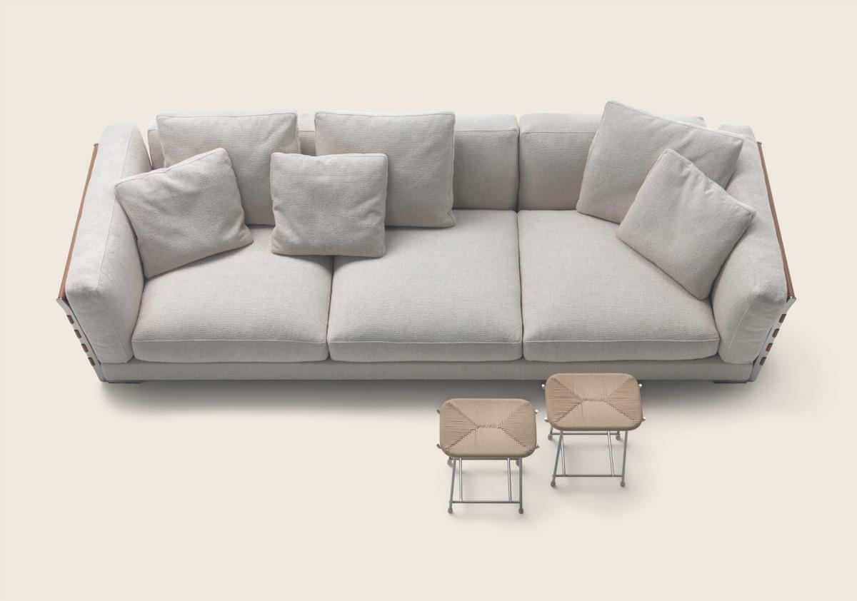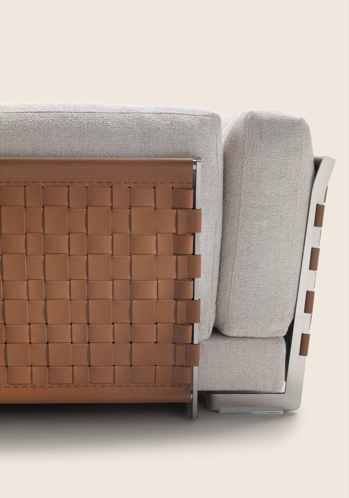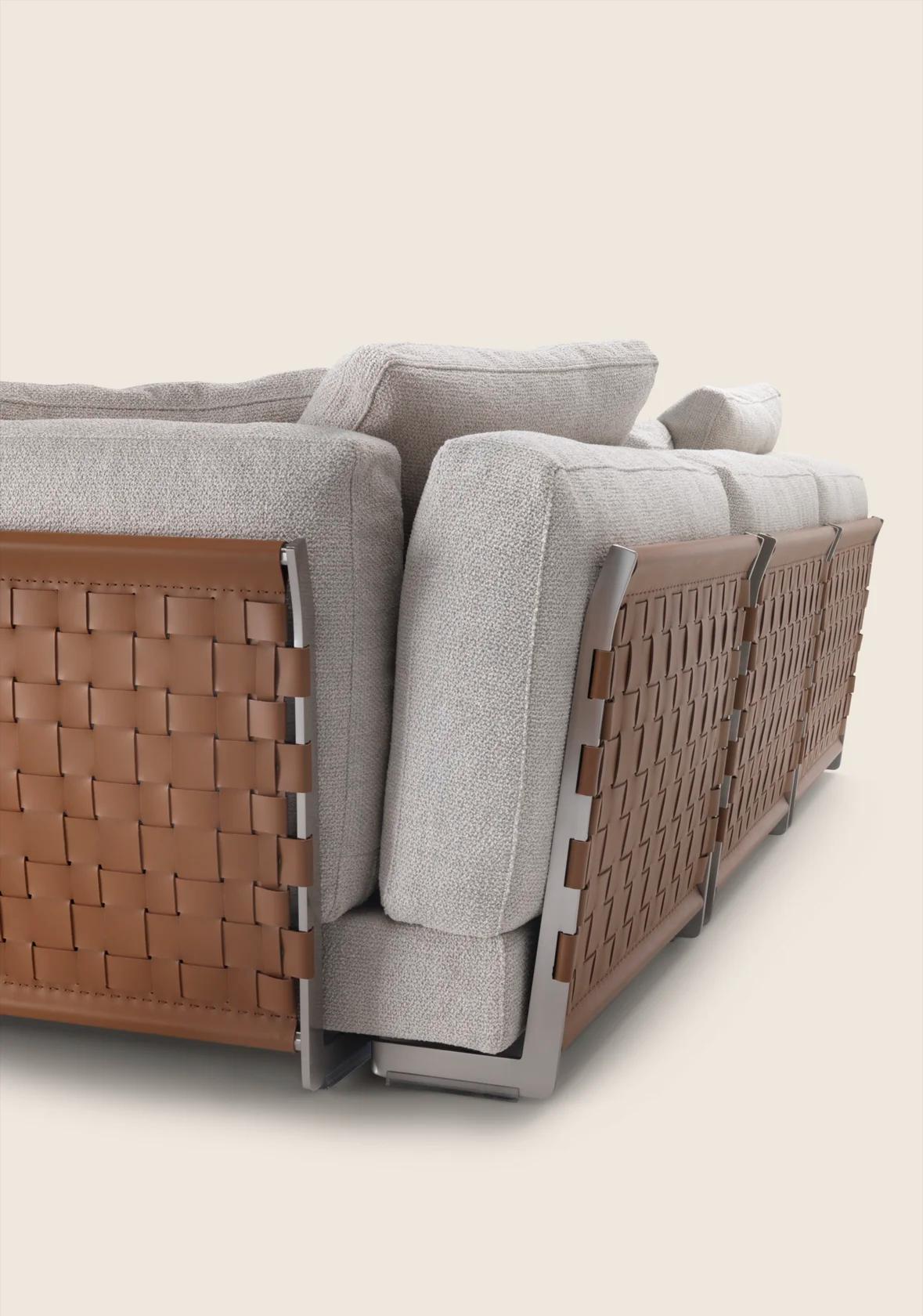 Диван Cestone — выдающаяся модель. Она мгновенно привлекает внимание смелым и элегантным дизайном. Этот предмет мебели не просто украшает гостиную. Он становится её центральным акцентом. Металлический каркас дивана покрыт изысканным кожаным плетением. Плетение состоит из узких и широких полос. Оно создаёт сложный и динамичный узор. Этот узор напоминает ручную работу.