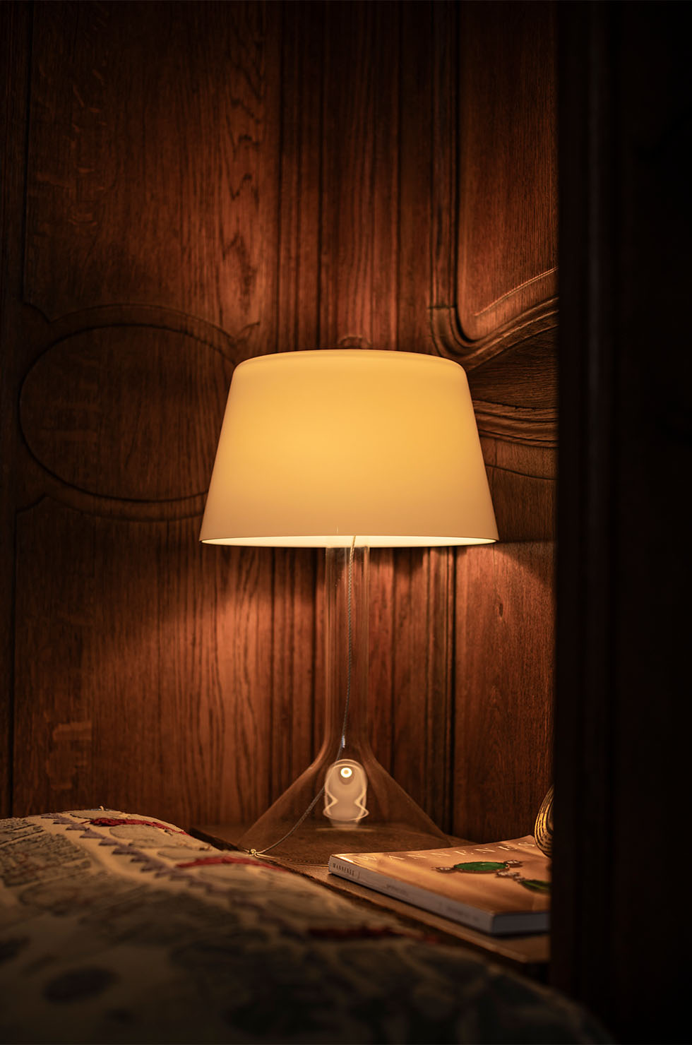 Простота конструкции здесь обманчива. Она рождает выразительную игру материалов: хрупкость и невесомость стекла контрастирует с тёплой, тактильной поверхностью матового металла, а сам свет становится осязаемым архитектурным элементом. Этот светильник — не просто прибор, а скульптурный объект, который вносит в интерьер лаконичность, порядок и изысканную функциональность, характерные для зрелого итальянского дизайна.