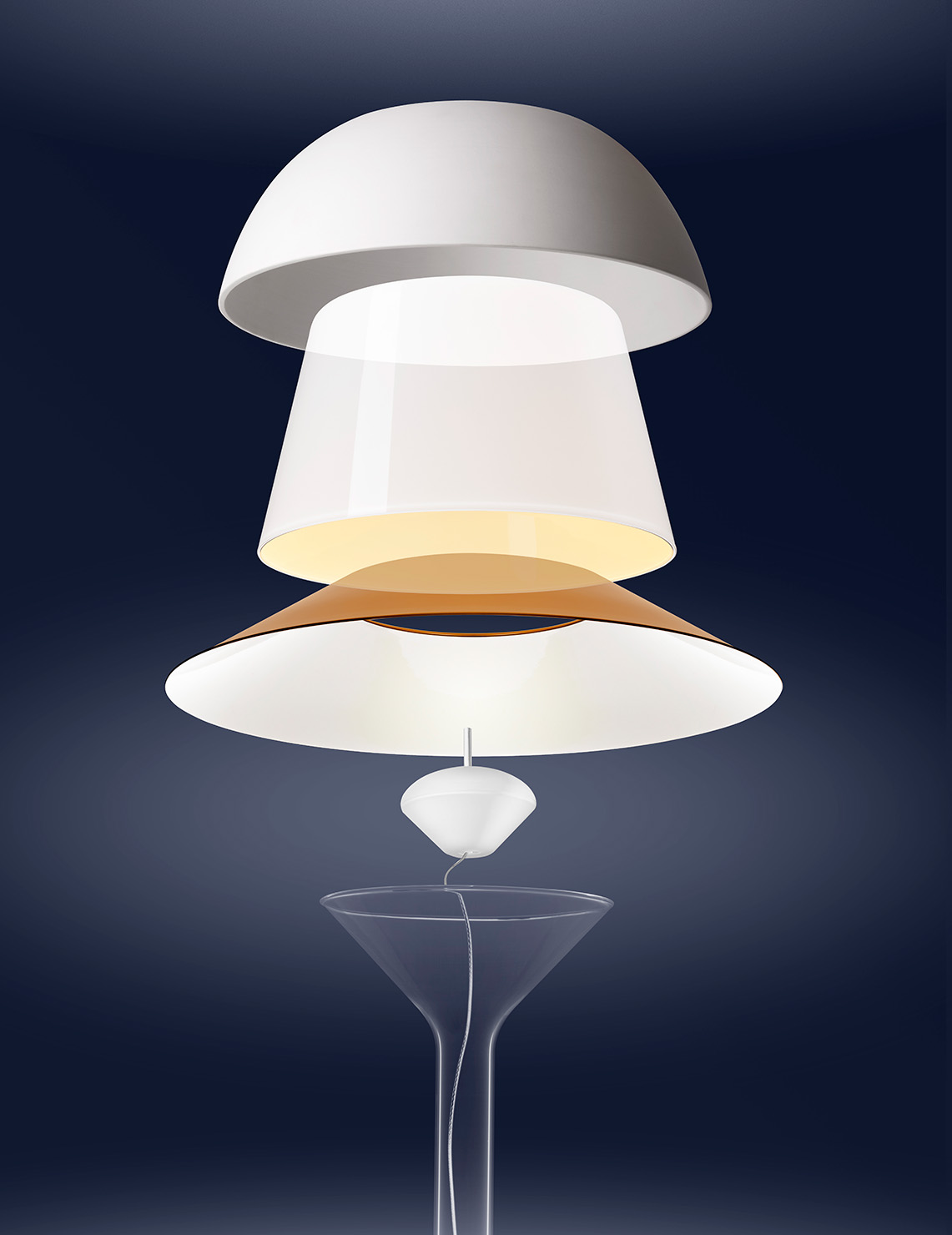 Конструкция Chapeaux сведена к минимально необходимым элементам, что выявляет чистоту форм и красоту материалов. Лампа состоит из трёх чётких компонентов: практически невидимого прозрачного стеклянного основания, компактного светового модуля и свободно позиционируемого рассеивателя.