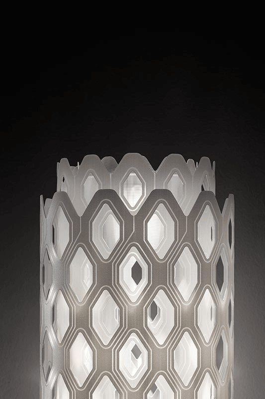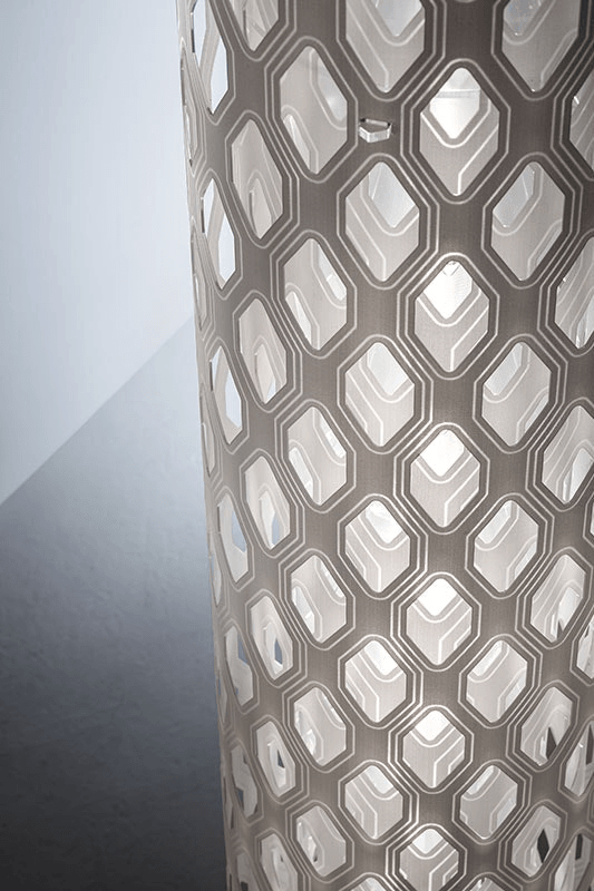 Скульптурная форма торшера напоминает пчелиные соты, где каждый элемент организован с математической точностью и симметрией. Гладкие, концентрические шестиугольники, выстроенные в идеальный порядок, создают иллюзию бесконечности. Их структура приглашает наблюдателя погрузиться в изучение мельчайших деталей, словно открывая перед ним целый мир гармонии и совершенства. Этот дизайн напоминает о сложных и упорядоченных формах природы, но одновременно подчеркивает искусственность и продуманность человеческого творчества.
