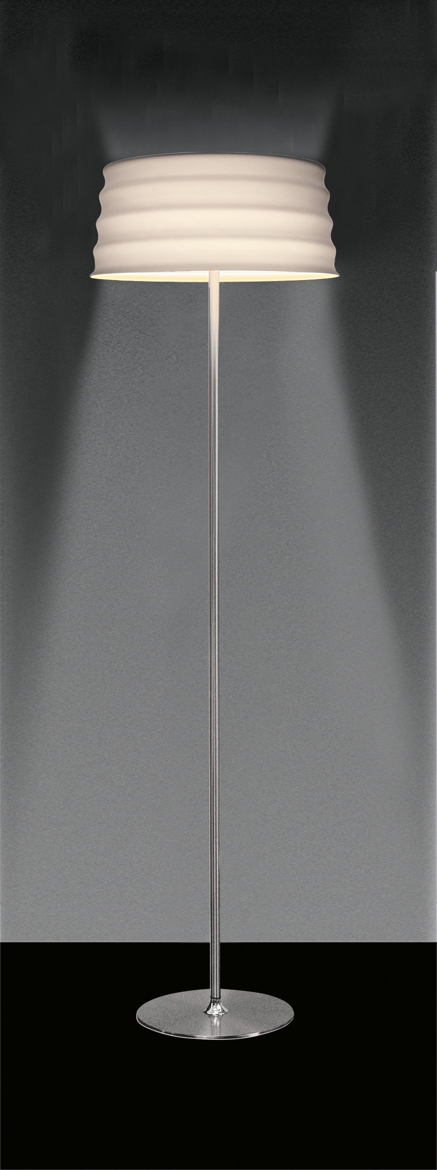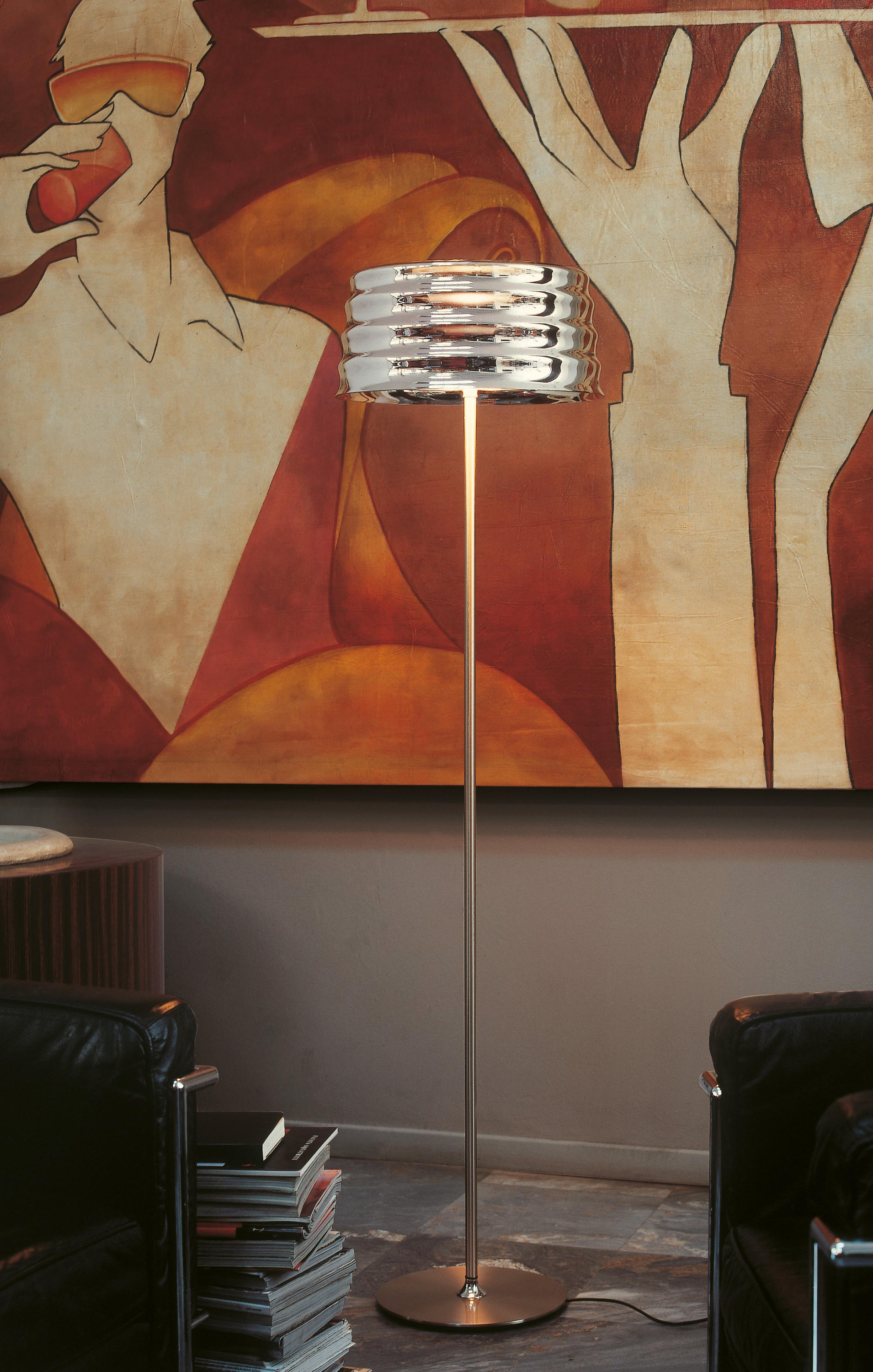 C’hi - торшер, спроектированный Umberto Asnago. Основание торшера выполнено из матового никеля, а абажур из выдувного стекла, которое имеет рельефную структуру. Абажур может быть выполнен из прозрачного или серебряного стекла, белого опала или стекла в пескоструйной обработке. В коллекцию также входят настольные, настенные и подвесные светильники.n